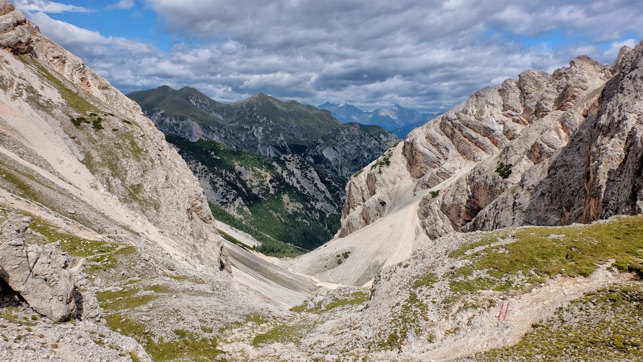 An der nächsten Weggabelung behält man den nunmehr schmalen Pfad Nr. 23 bei, der nach etwa 50 Minuten zur geröllbeladenen Seitenbachscharte führt. Nun folgt der steile Abstieg durch die unwirtliche, von mächtigen Felsen umfriedete Scharte durchs Sennerstal.