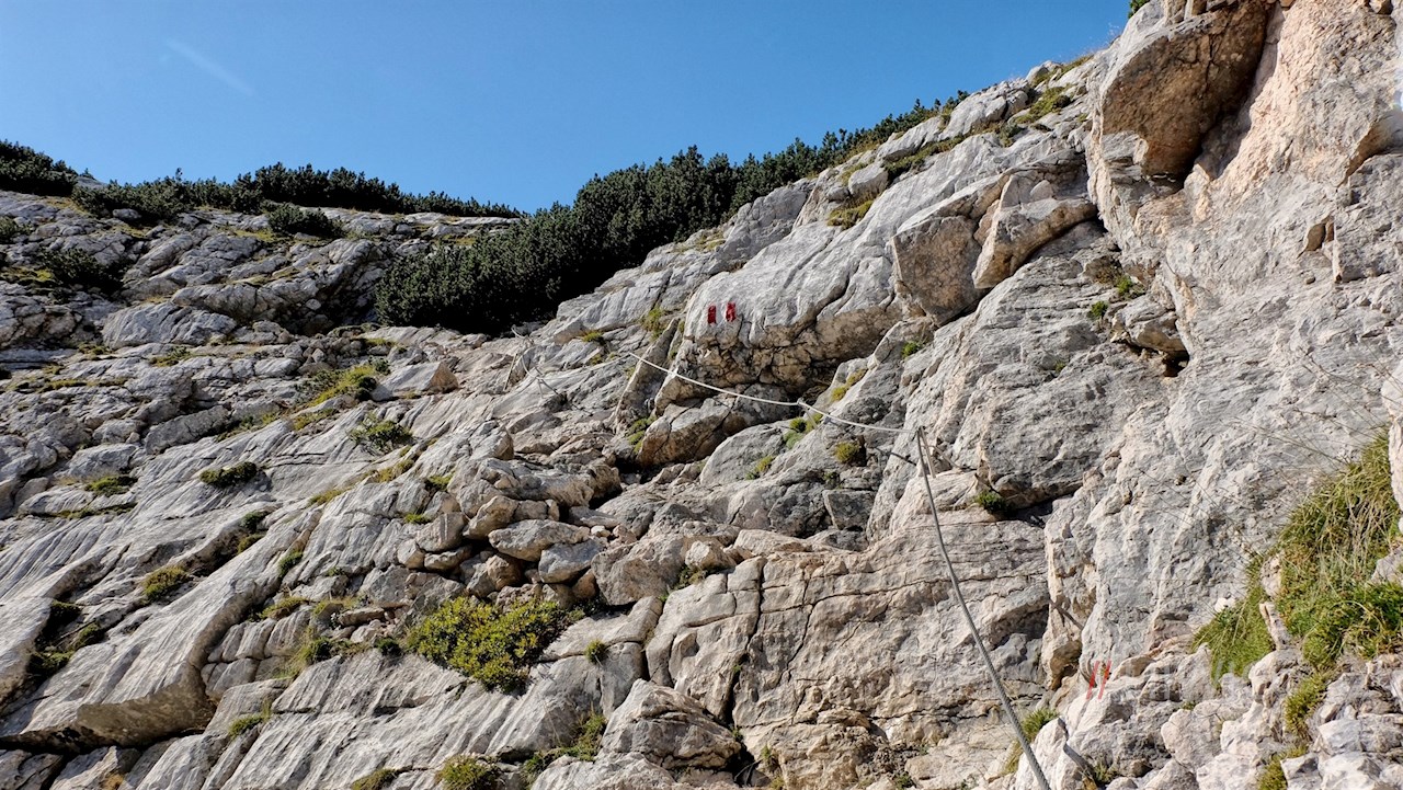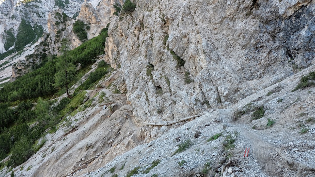 Am Südufer folgt man dem zumeist steilen Dolomiten-Höhenweg Nr. 1, der zunächst durch ein schluchtförmig eingeschnittenes Tal führt. Zwei leicht ausgesetzte Passagen sind dank der angebrachten Stahlseile recht einfach zu überwinden.