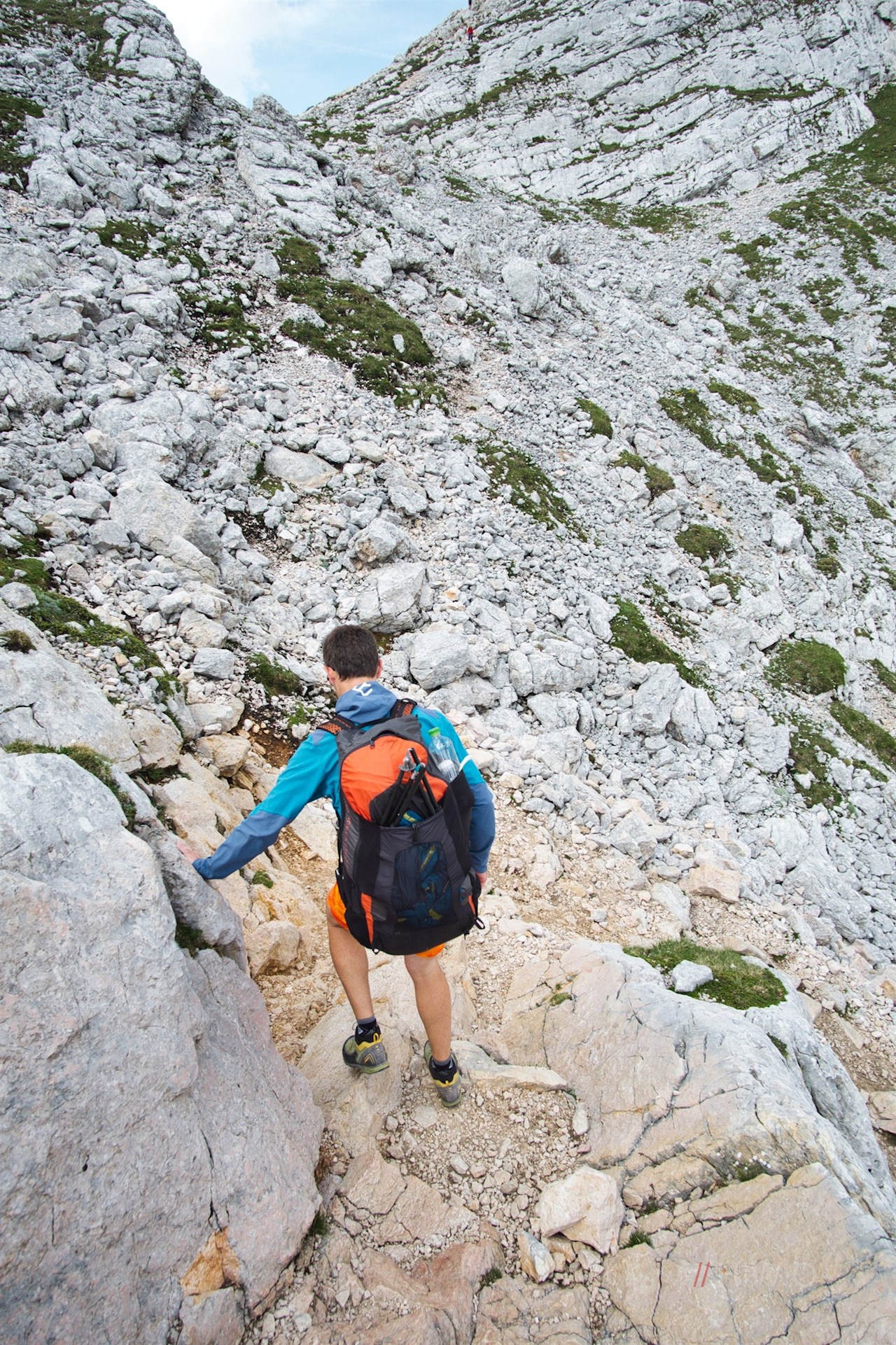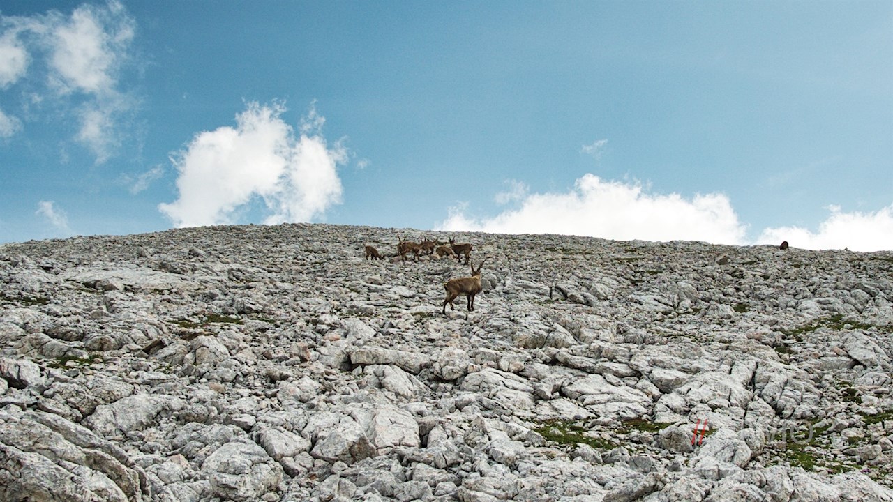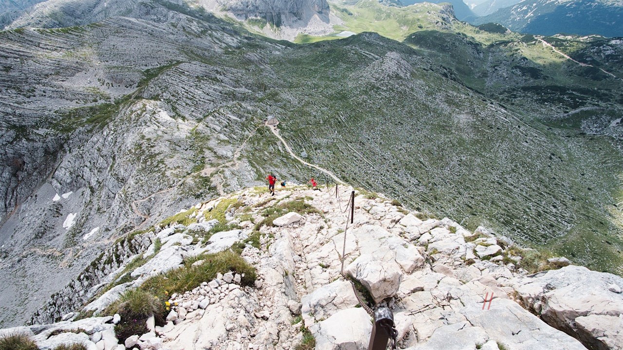 Nun folgt der steile Anstieg über die stein- und geröllbeschlagene Südostflanke des aussichtsreichen Seekofel. Trotz der fehlenden Markierungen ist der ausgetretene Weg leicht zu finden. Unterwegs trifft man auf eine ziemlich steile Passage, die dank der angebrachten Stahlkette recht einfach zu überwinden ist.