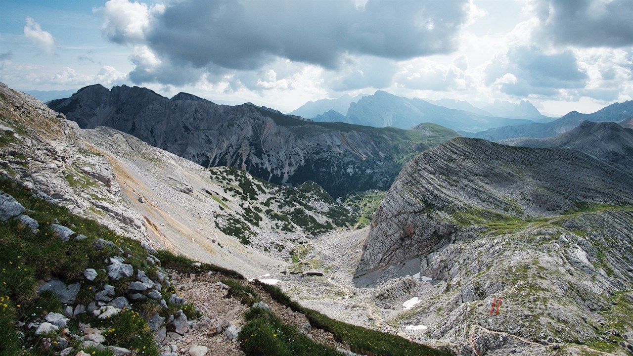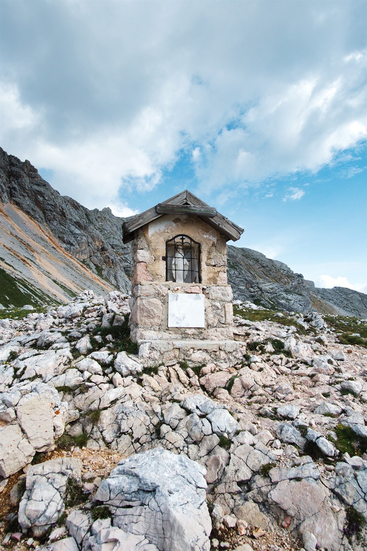 An der nächsten Weggabelung führen sowohl der links abzweigende Pfad Nr. 28 als auch der rechts abzweigende Pfad Nr. 3 in Richtung Seekofelhütte. Wir behalten den Weg Nr. 3 bei, der zunächst leicht abfällt und wenig später in den Dolomiten-Höhenweg Nr. 1 übergeht. Dieser führt im steten Anstieg auf die mit einem Marienbildstock geschmückte Ofenscharte.