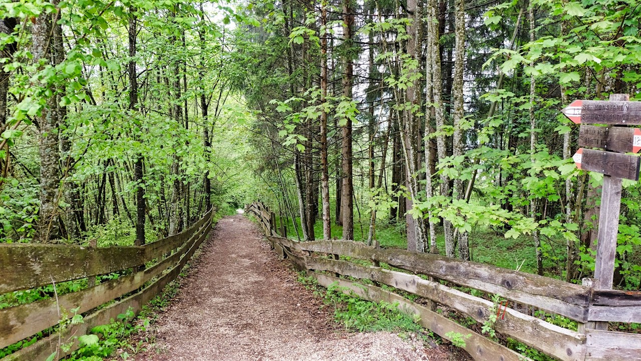 Nahe dem Restaurant Völser Weiher zweigt der Wanderweg Nr. 13 nach St. Konstantin ab, der sogleich in einen lauschigen Mischwald eintritt.