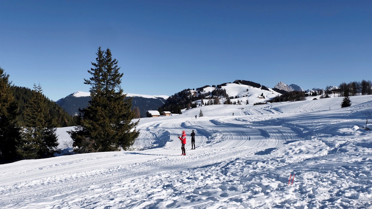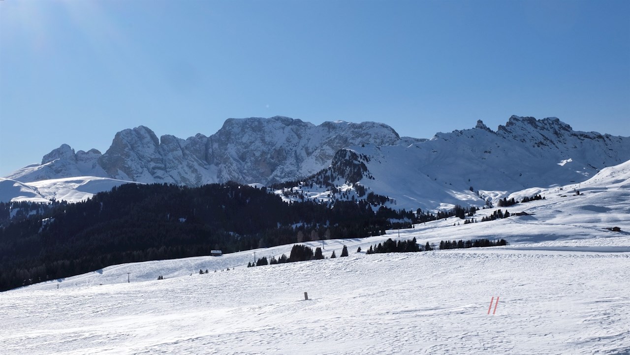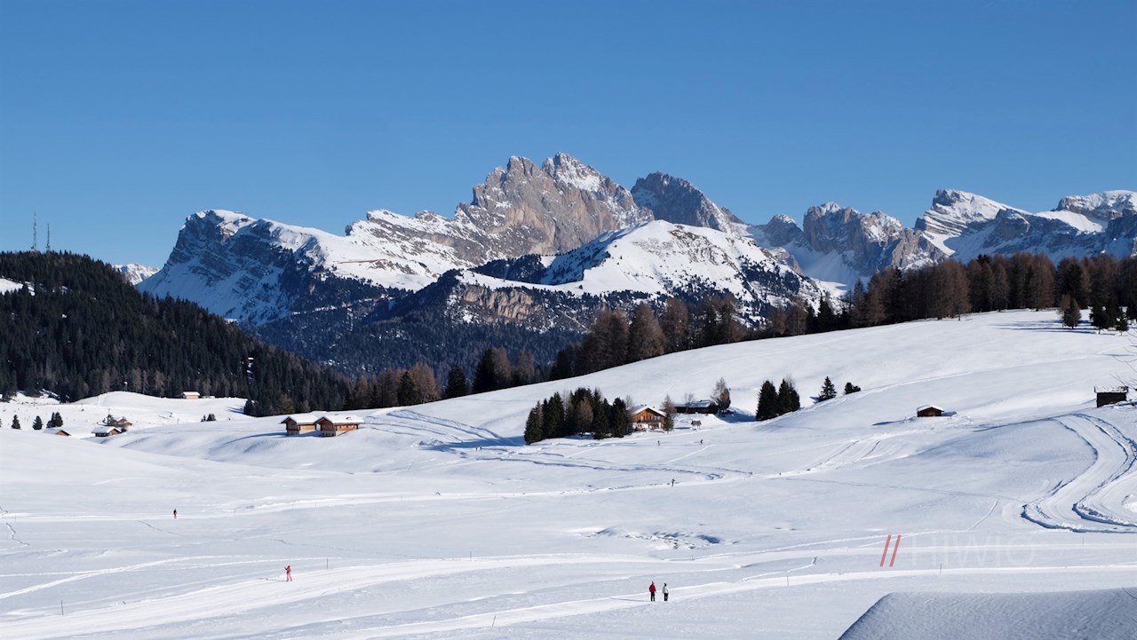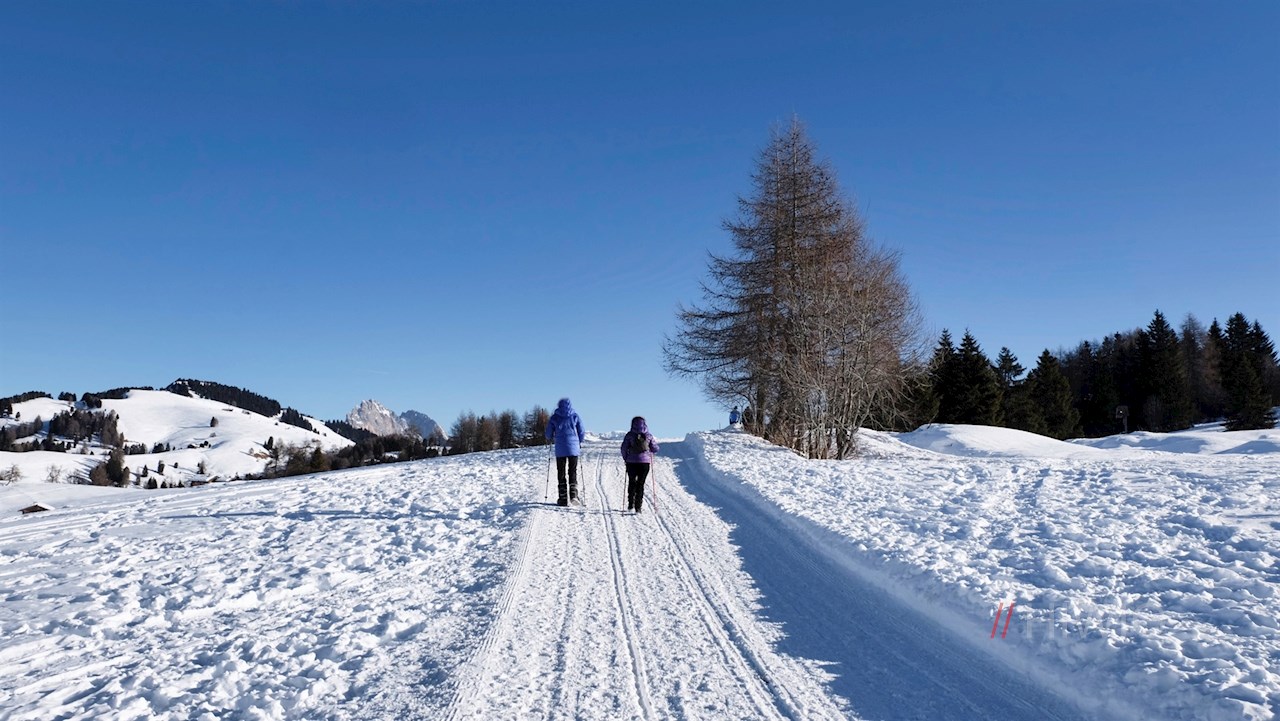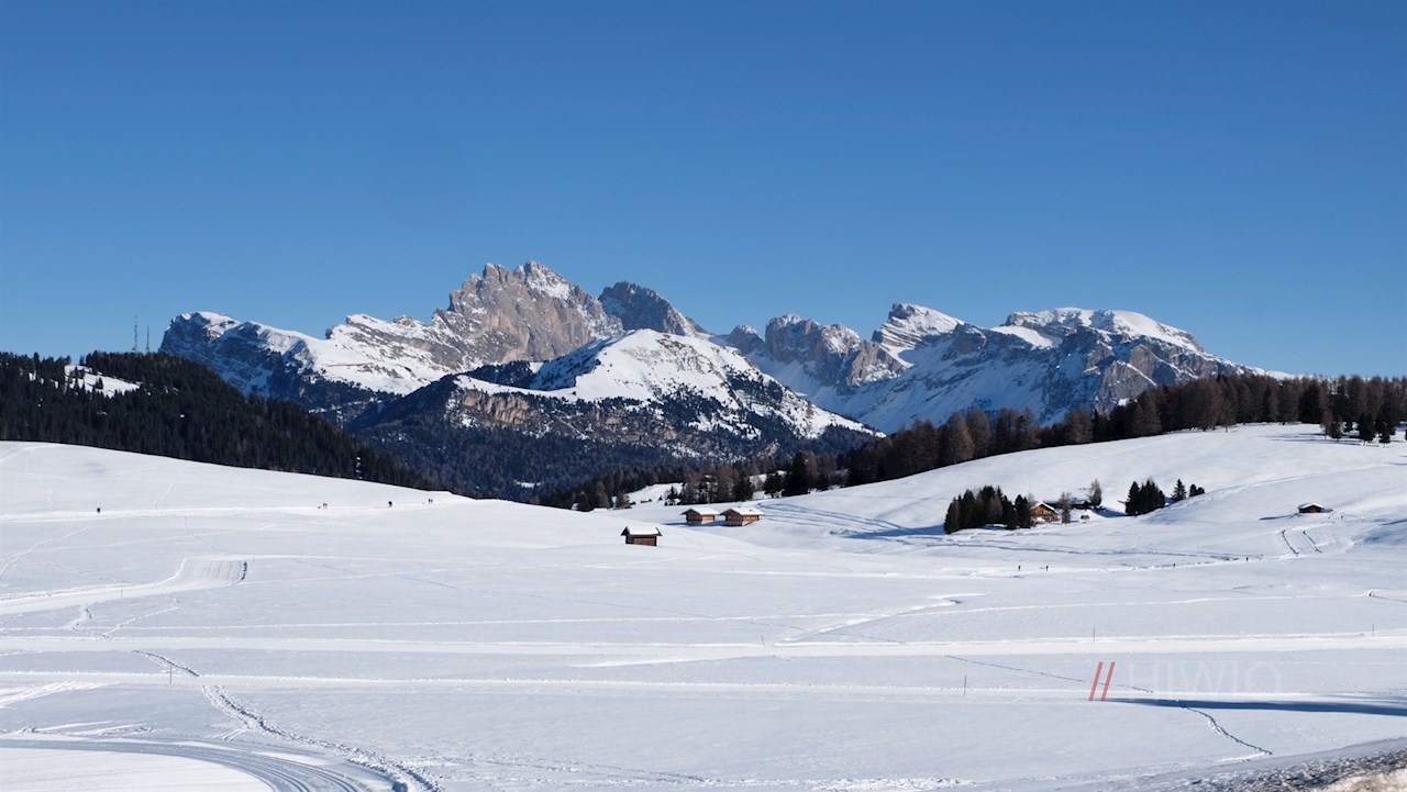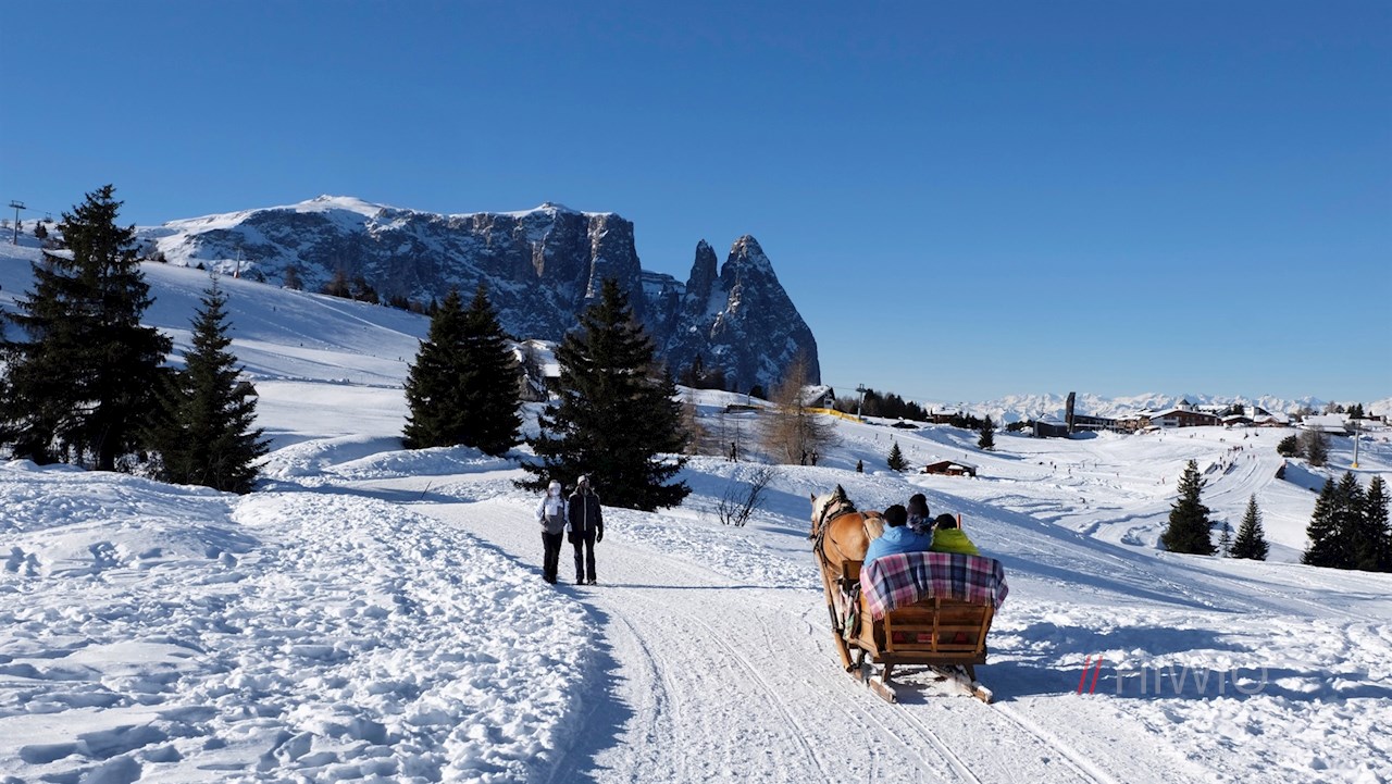 Etwas unterhalb der Bergstation zweigt bei der Franziskuskirche der mit der Nr. 30 ausgeschilderte Hans-und-Paula-Steger-Weg in Richtung Rauchhütte ab. Er schlängelt sich teils eben, teils im leichten Auf und Ab durch die sanft gewellten, unter einer dicken Schneedecke verborgenen Almwiesen und öffnet dabei malerische Ausblicke auf die ringsum aufragende Bergwelt. Namentlich die anmutigen Villnösser Geisler und die kühn aufragende Langkofelgruppe stechen ins Auge. Nicht minder idyllisch sind die nostalgischen Pferdekutschen, die zuweilen an uns vorbeitraben.