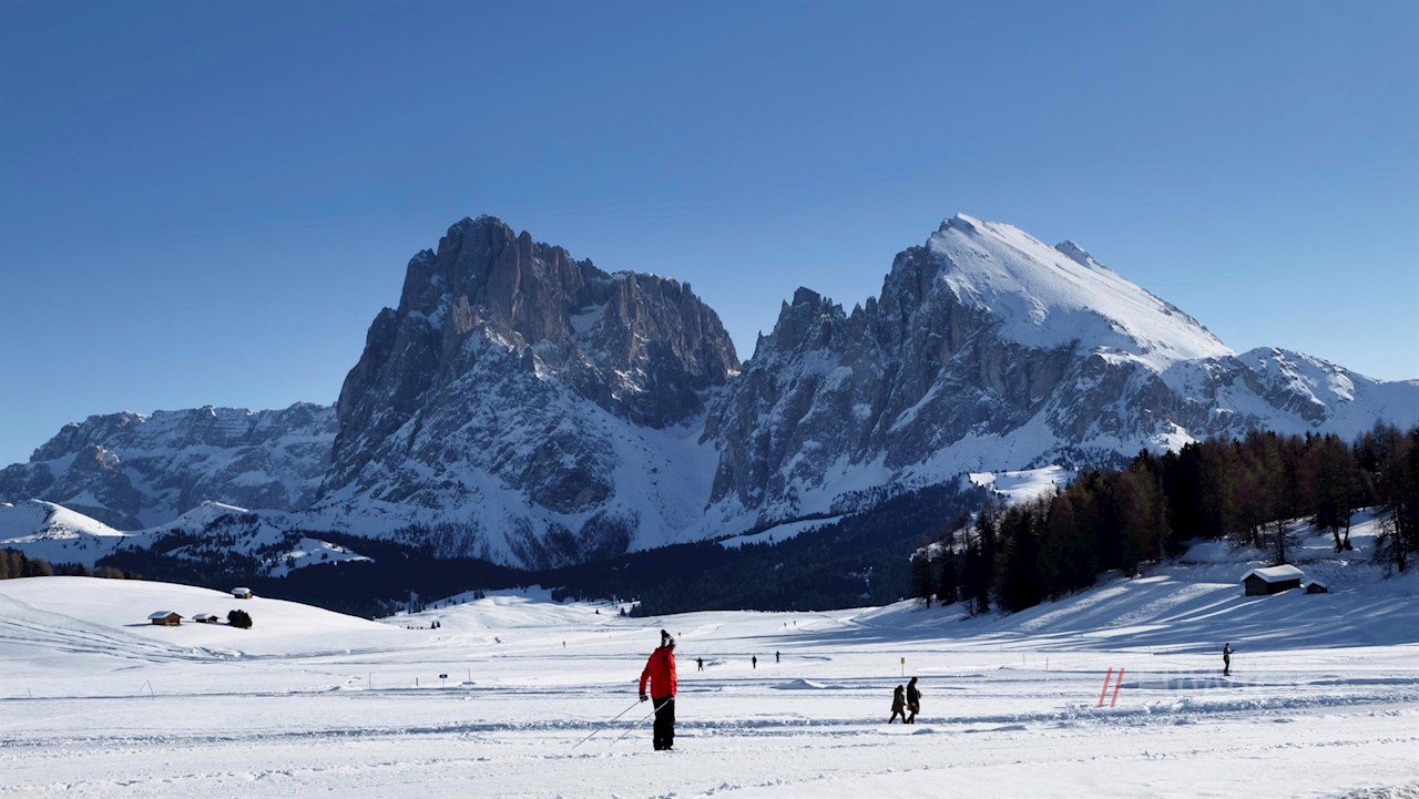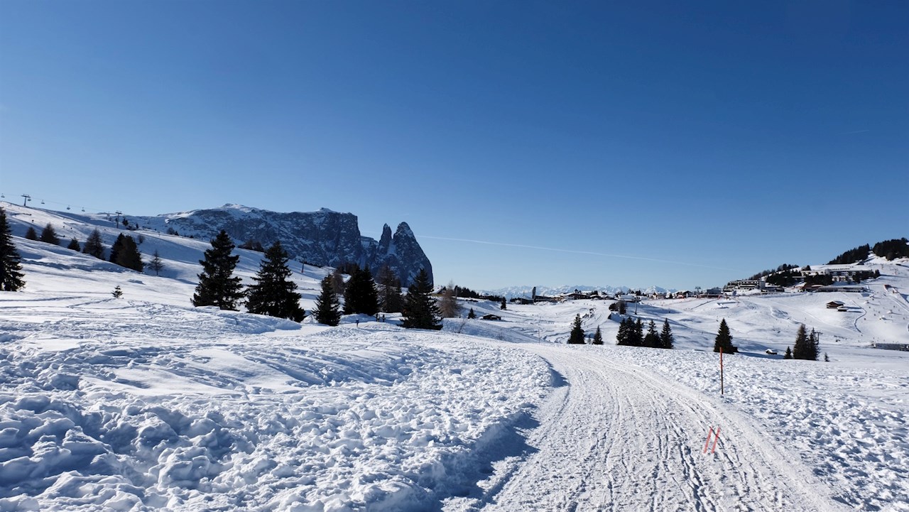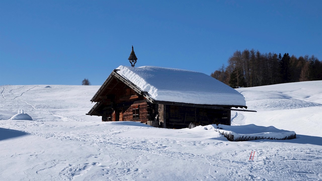 Die Seiser Alm eröffnet auch im Winter eine Vielzahl von Wanderwegen. Einer davon schlängelt sich ohne nennenswerte Höhenunterschiede durch die bezaubernde, von schneebedeckten Dolomitenbergen umrahmte Winterlandschaft zur einladenden Rauchhütte.