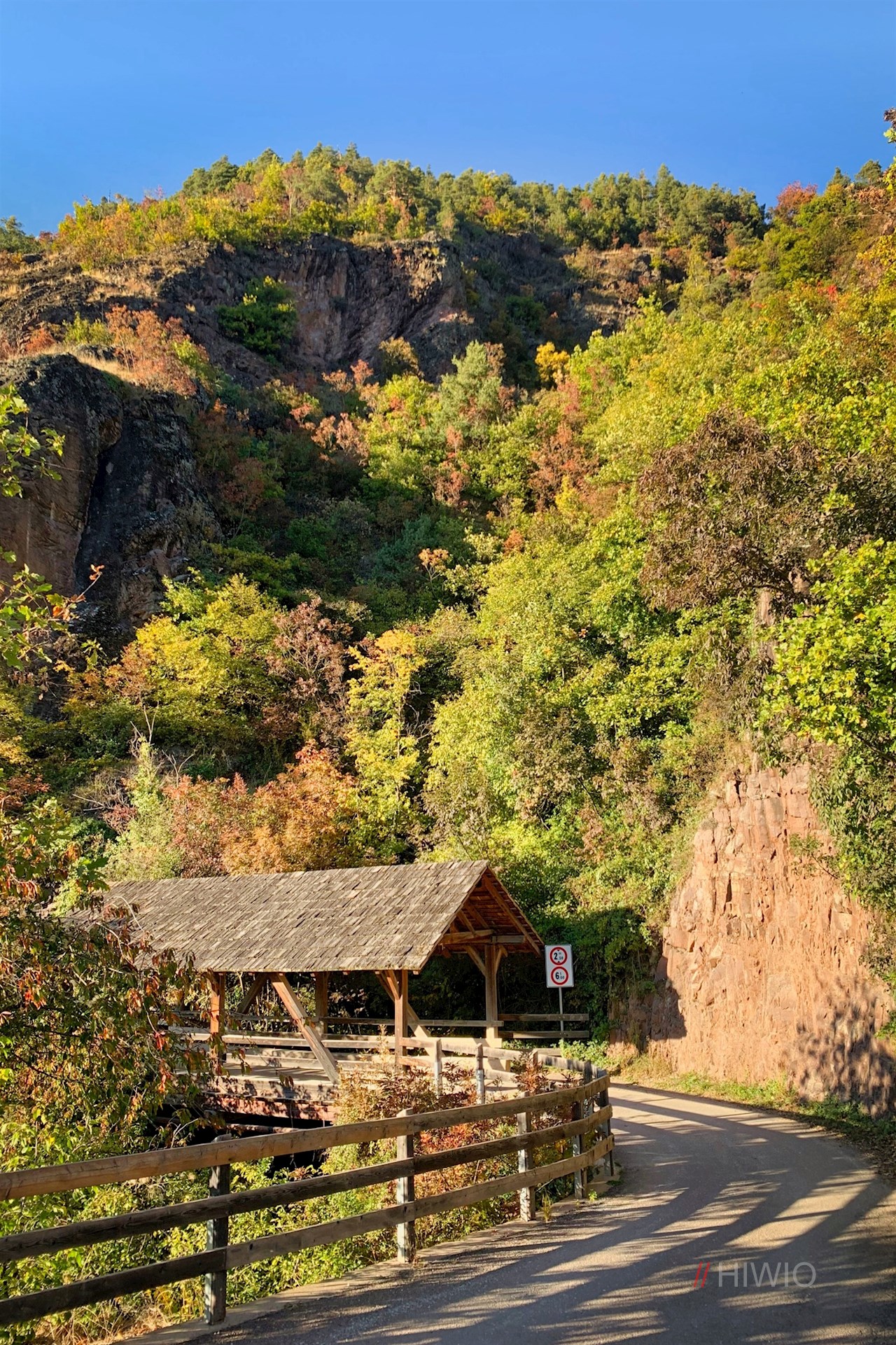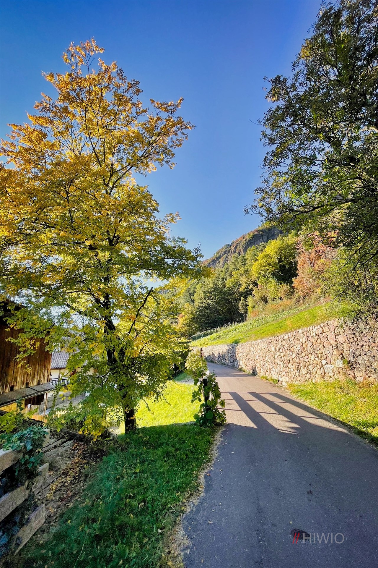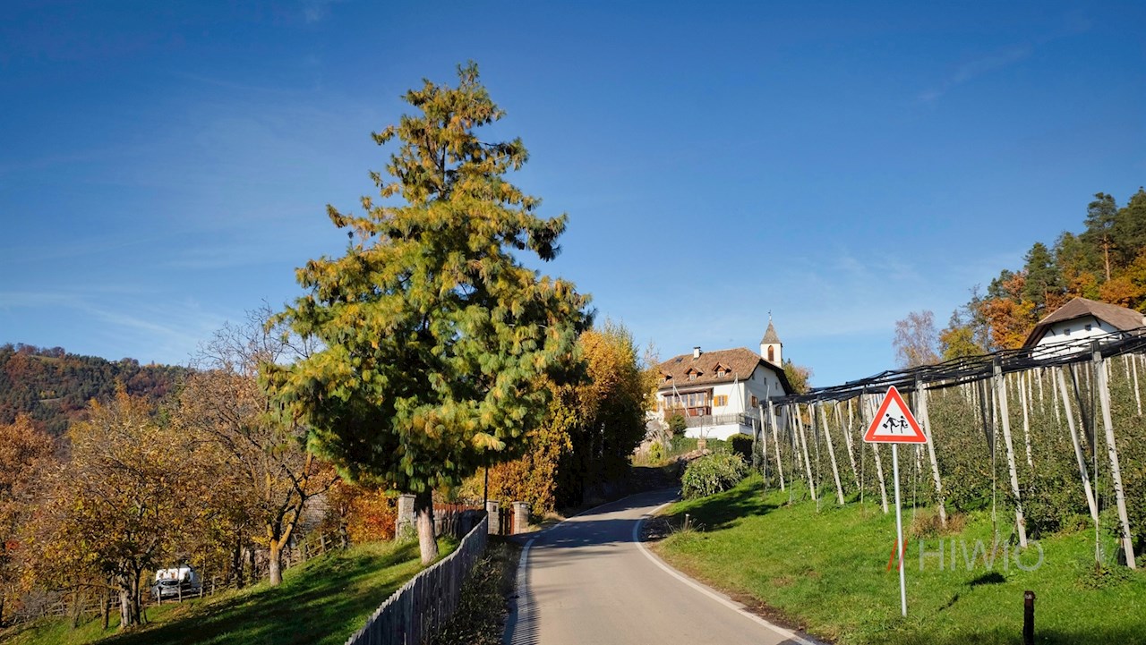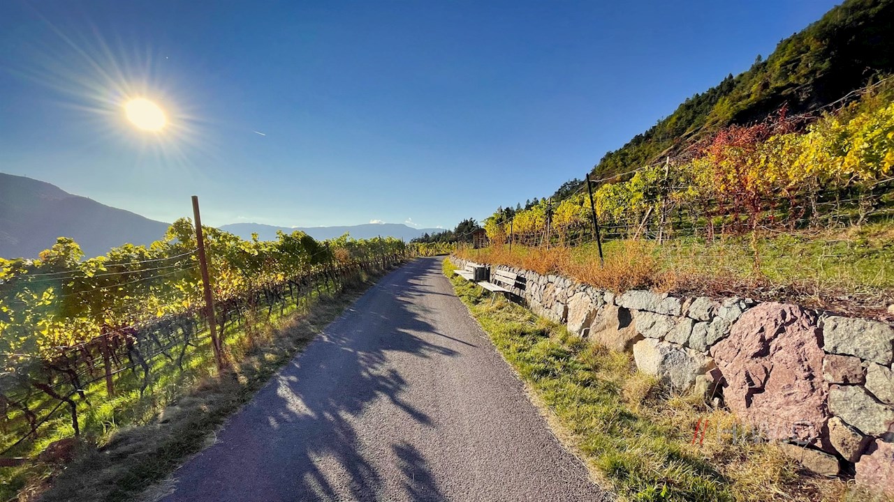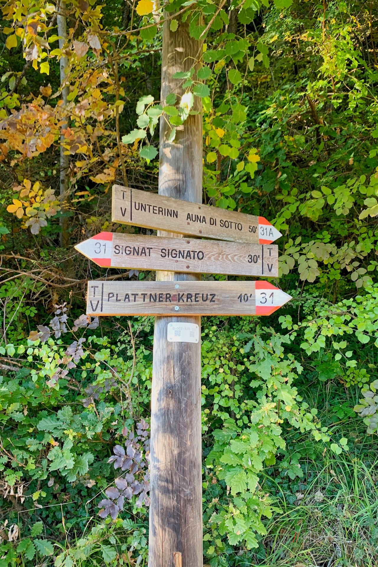 Auf der gegenüberliegenden Straßenseite weist das Wanderschild Nr. 31 den Weg in Richtung Signat. Er zieht sich ohne nennenswerte Höhenunterschiede durch aussichtsreiche Wiesen, Weinberge und lichte Haine, die sich im Herbst in ein leuchtendes Farbenmeer verwandeln. Unterwegs öffnen sich schöne Ausblicke auf die gegenüberliegenden Dolomiten mit dem alles beherrschenden Rosengarten.