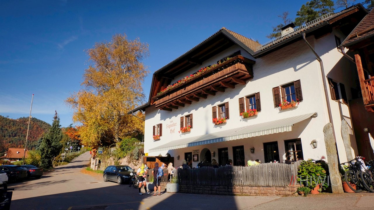 Nach einer guten halben Stunde gemütlichen Wanderns lädt der mehrfach ausgezeichnete Signaterhof im gleichnamigen Weiler zur genüsslichen Einkehr: In der getäfelten Bauernstube und auf der gemütlichen Terrasse zaubern die freundlichen Wirtsleute ihren Gästen hausgemachte Südtiroler Gaumenfreuden auf die Teller, zu denen sie erlesene regionale Weine servieren. Besonderer Beliebtheit erfreut sich der Signaterhof übrigens im Herbst, wenn zahlreiche Wanderer zum Törggelen einkehren.