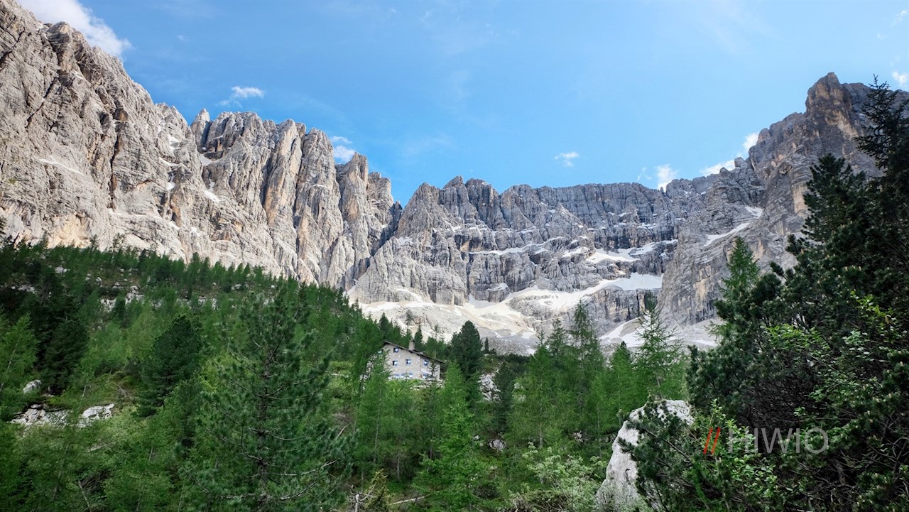 Dahinter taucht man erneut in einen lichten Wald ein. Nun ist die steinerne Vandelli Hütte mit ihren markanten blau-weißen Fensterläden nicht mehr fern. Umgeben von hohen Bäumen und noch höheren Felsen lädt sie auf 1.926 m Höhe zur gemütlichen Einkehr.