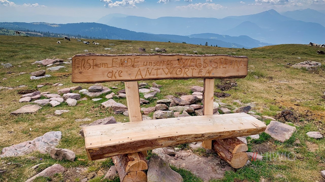 Auf 2.080 m Höhe öffnet sich schließlich ein malerischer Ausblick, der sich von den nahen Bergspitzen des Ifinger, der Verdinser Plattenspitze und des Mittager über den Rosengarten bis hin zur Ortlergruppe erstreckt. Eine Aussichtsbank lädt zum Verweilen und Genießen dieser traumverlorenen Idylle ein.