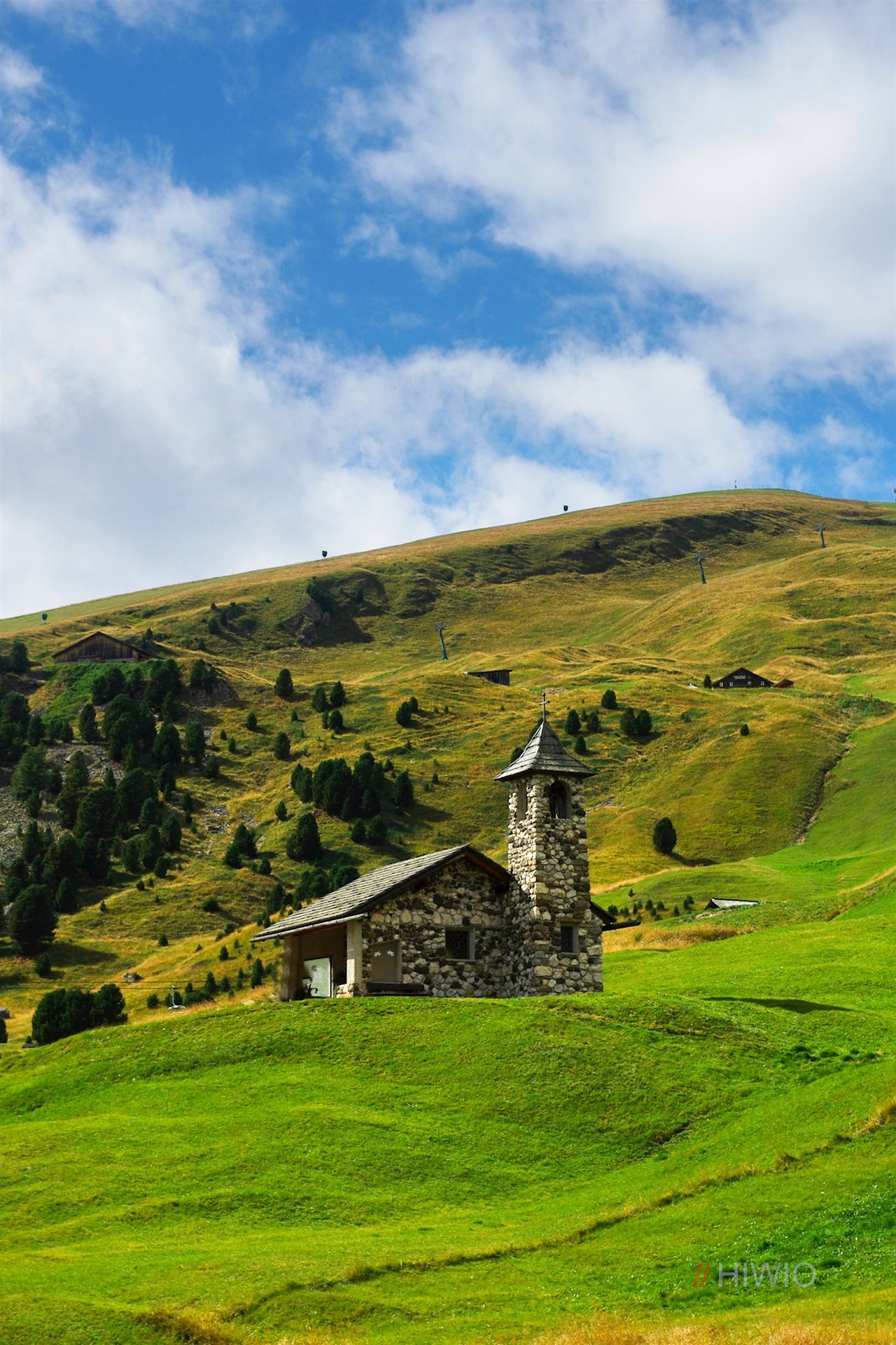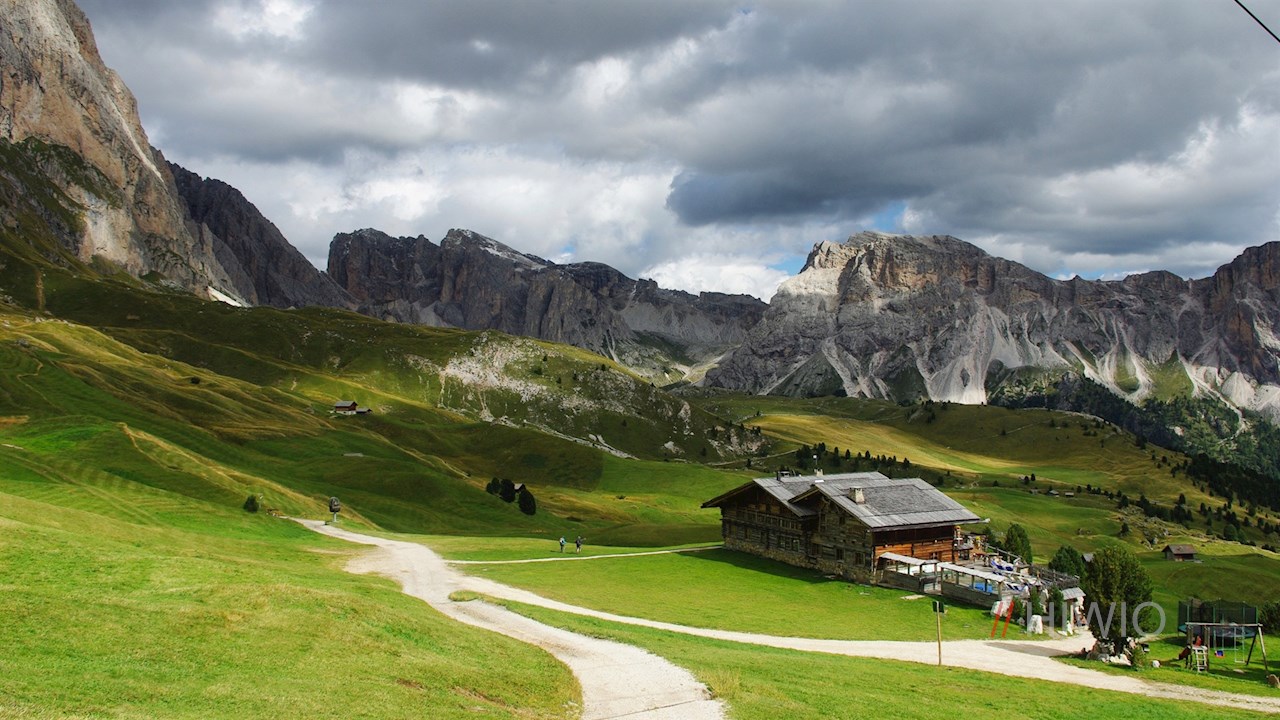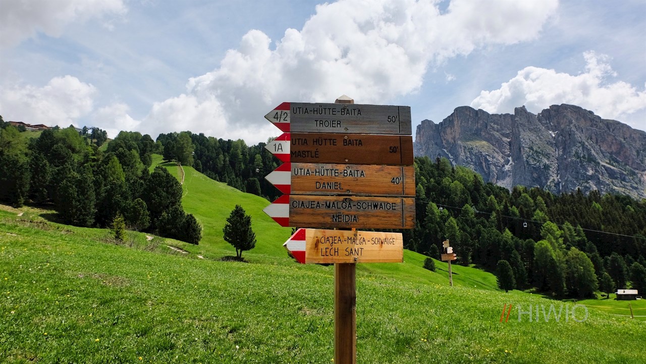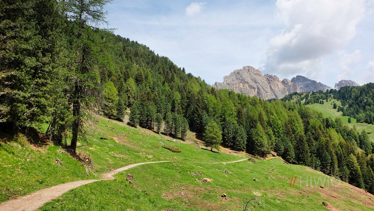 In der Dorfmitte schlägt man den bisweilen recht steilen Weg Nr. 20 ein. Er führt zunächst über einen liebevoll angelegten Stationenweg zum beschaulichen Weiler Runcaudie und steigt dann durch einen schattenverheißenden Nadelwald an. Unterwegs erhascht man immer wieder schöne Ausblicke auf den wuchtigen Sellastock und den imposanten Langkofel.