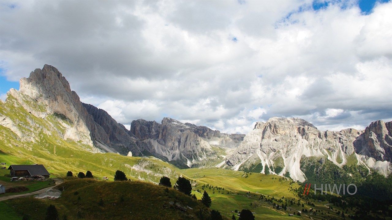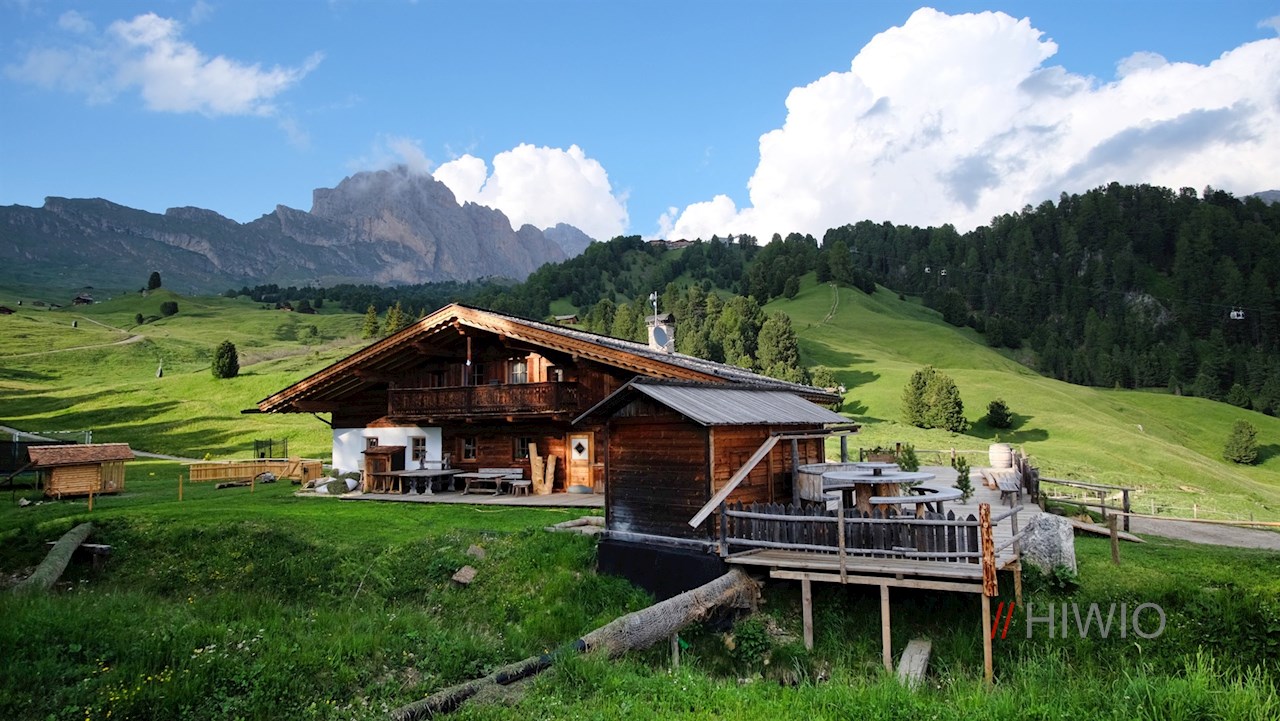 Hinter dieser einladenden Hütte mündet die Wanderung in den Weg Nr. 6. Er steigt durch die naturbelassenen, artenreichen Blumenwiesen auf die Seceda an.