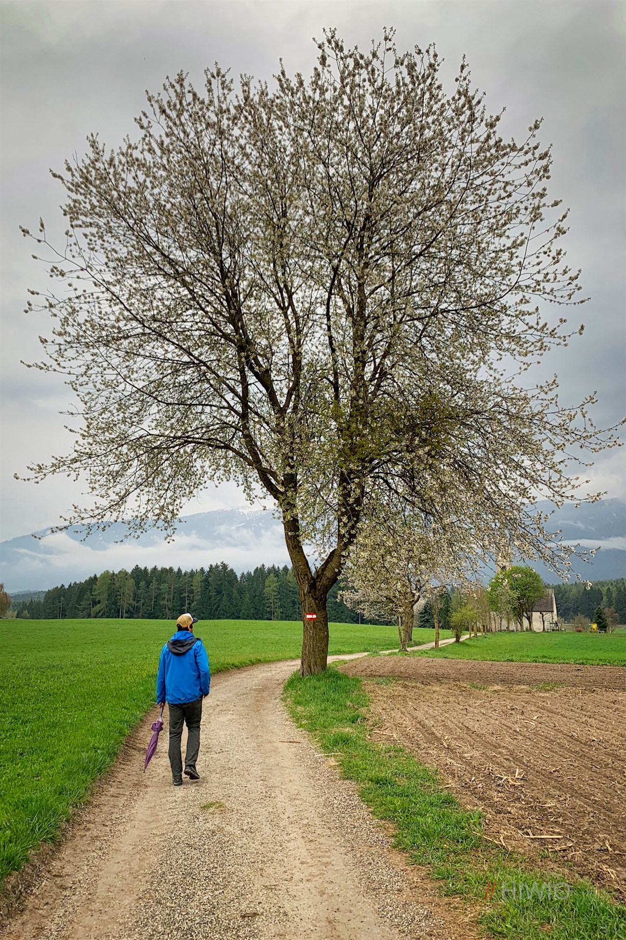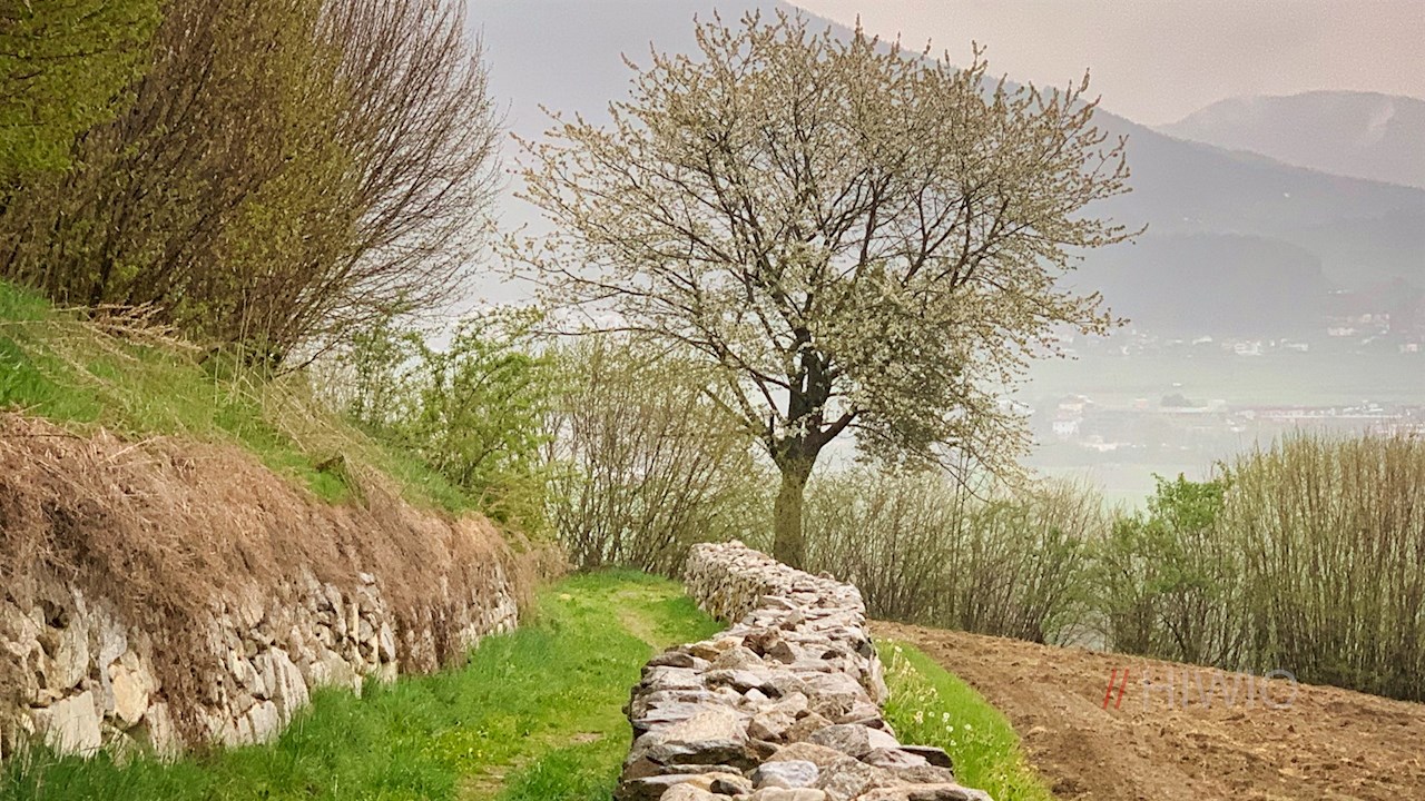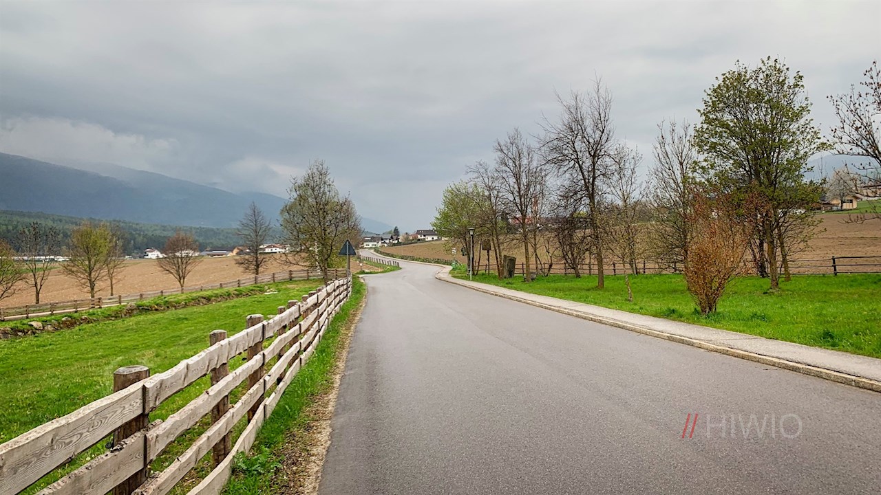 Hinter St. Valentin taucht der Weg in ein lichtes Waldstück ein, hinter dem er auf einzelne Häuser trifft.