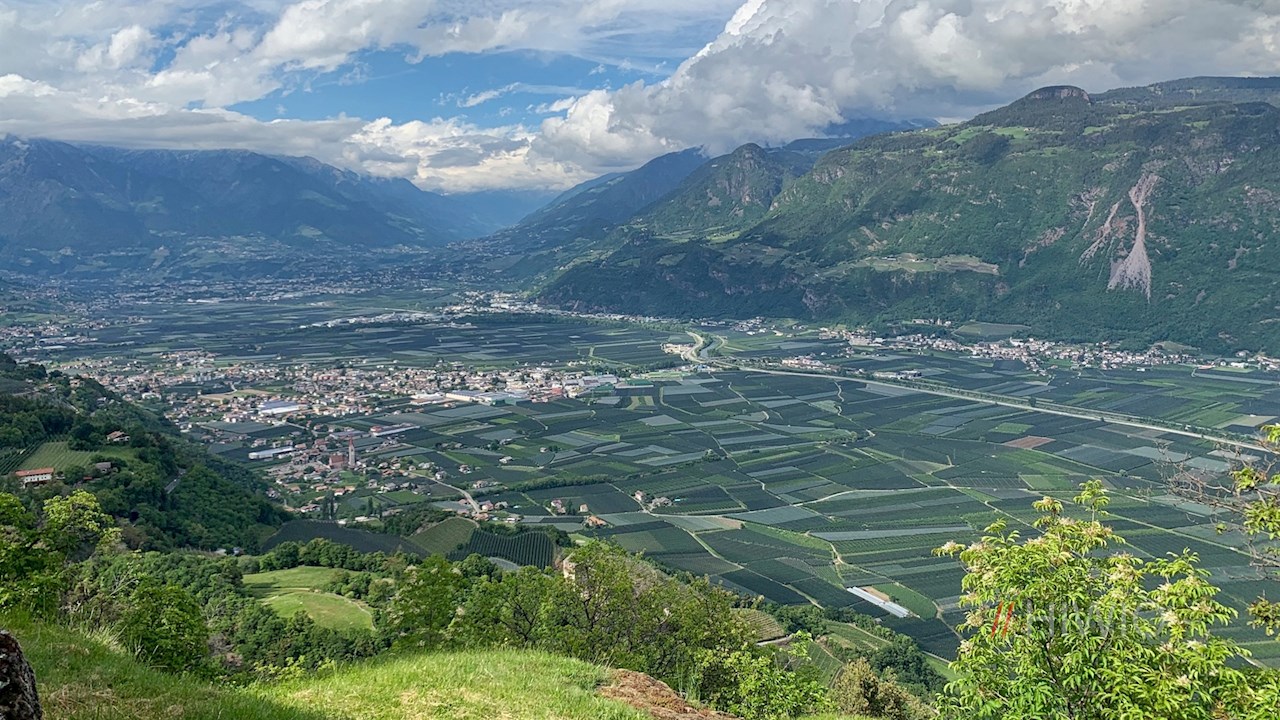 Nach der Überquerung der Gampenstraße trifft man auf die kleine Selbstbedienungshütte am Finsterbichlhof, die gegen eine freiwillige Spende einige Erfrischungen bereithält. An der nächsten Weggabelung halten wir uns rechts und wandern zum nahen Buschenschank Götzfriedkeller, der inmitten aussichtsreicher Obstwiesen zur genüsslichen Zwischenrast und im Herbst zum Törggelen lädt.