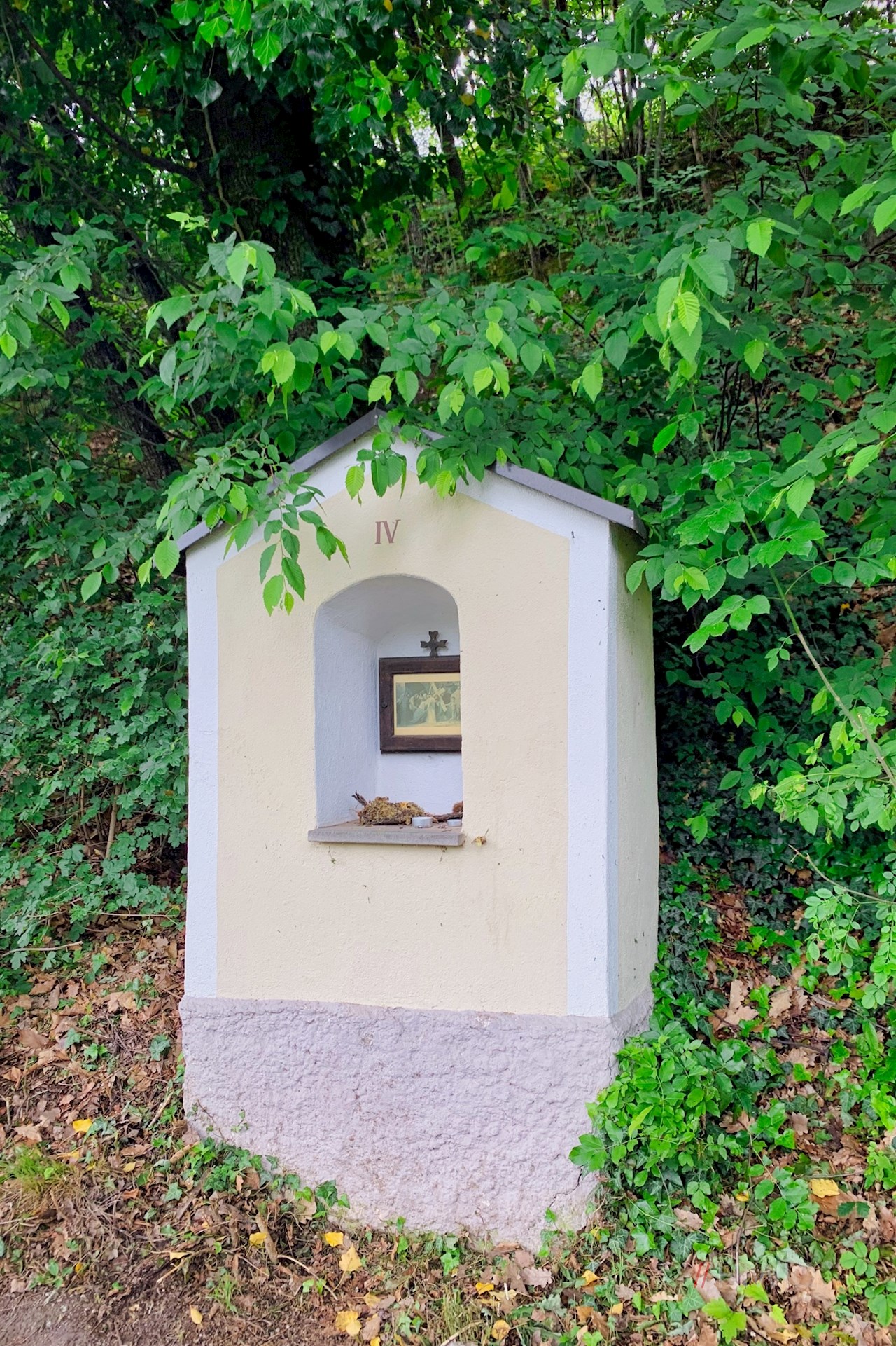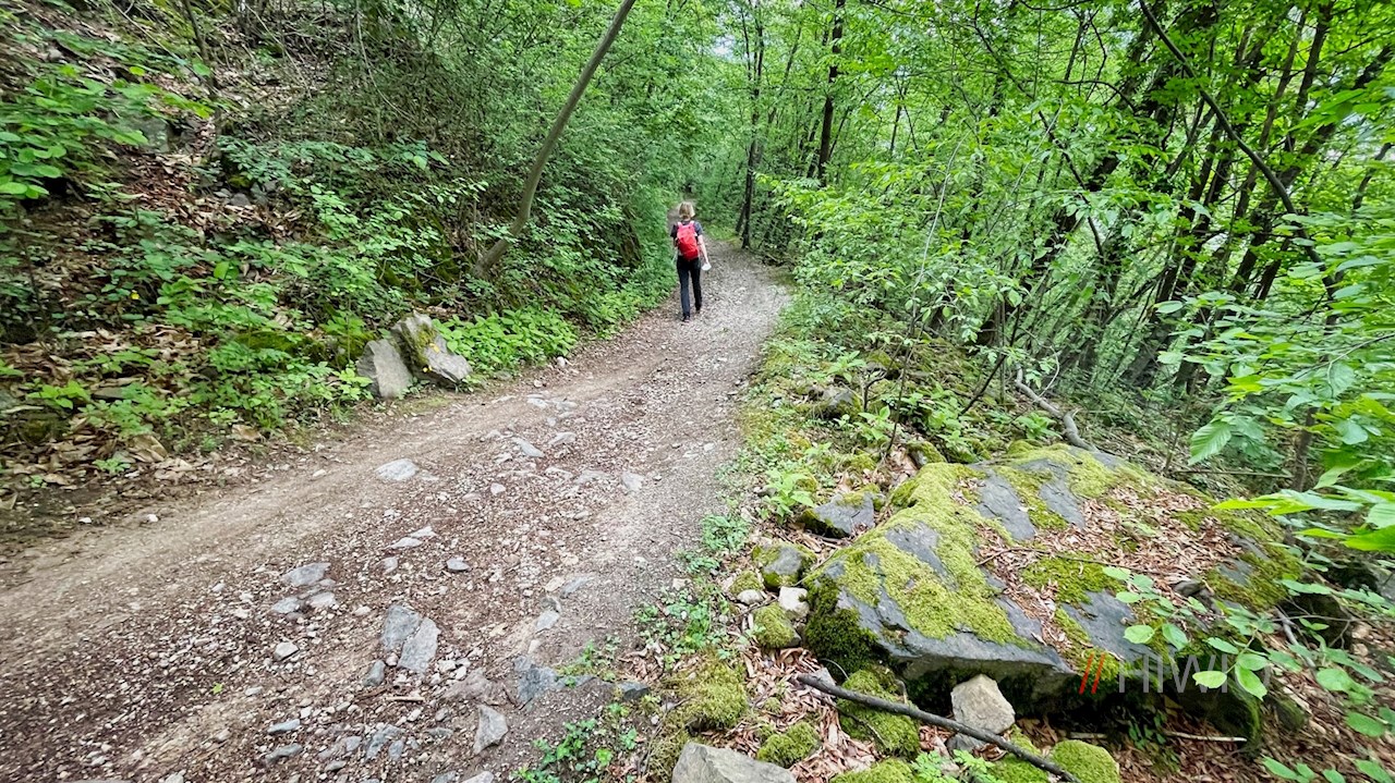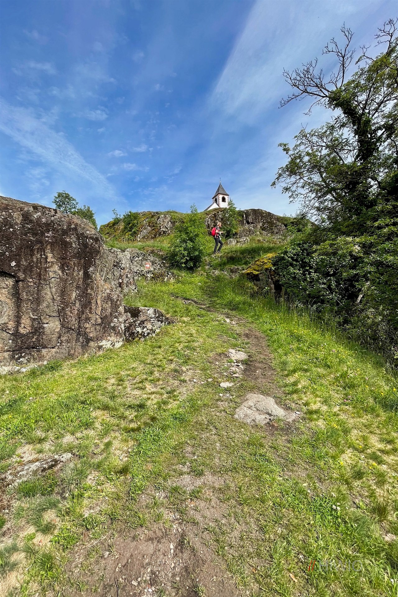 Hinter dem beliebten Buschenschank führt der Weg im angenehmen Anstieg durch einen schattenverheißenden Mischwald und zuletzt über eine von vulkanischem Porphyr geprägte Felskuppe zum Höhenkirchlein St. Hippolyt.