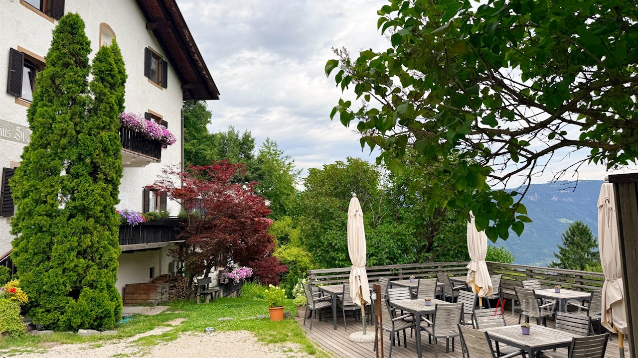 Vis-à-vis dem Gasthaus weist das Wanderschild Nr. 8 den sanften Anstieg nach St. Jakob. Er taucht sogleich in den schattenverheißenden Mischwald ein und öffnet bereits zu Beginn schöne Ausblicke auf den bewaldeten Porphyrhügel, auf dem die Kirche St. Apollonia thront. Als die Talsohle noch von Sümpfen durchzogen war, war dieser breite Wanderweg Teil der Hauptverkehrsader, die Bozen mit Meran verband.