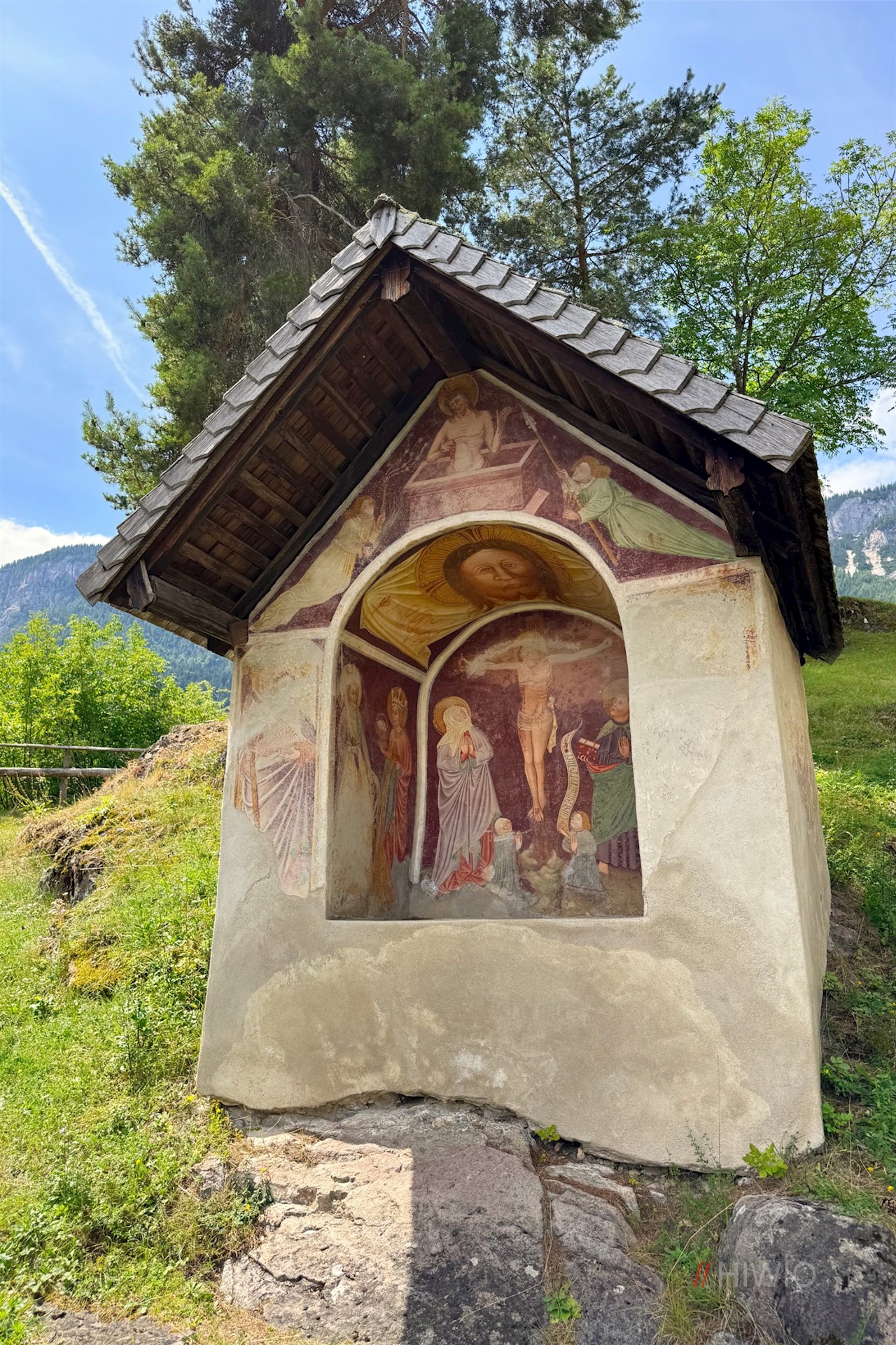 Nach etwa 40 Minuten gemütlichen Wanderns erreicht man das idyllisch gelegene Kirchlein St. Jakob. Es birgt in seinem Inneren farbenprächtige Fresken, die zu den bedeutendsten romanischen Wandmalereien des Landes zählen: In der Apsis sind Christus und die vier Evangelisten dargestellt, während im Triumphbogen darüber Abraham zu sehen ist, der mit seinem Sohn Isaak den Opferberg besteigt. Die dahinter abgebildeten schneebedeckten Berge galten lange als eine der frühesten Darstellungen der Dolomiten – eine Interpretation, der die meisten Kunsthistoriker heute widersprechen.