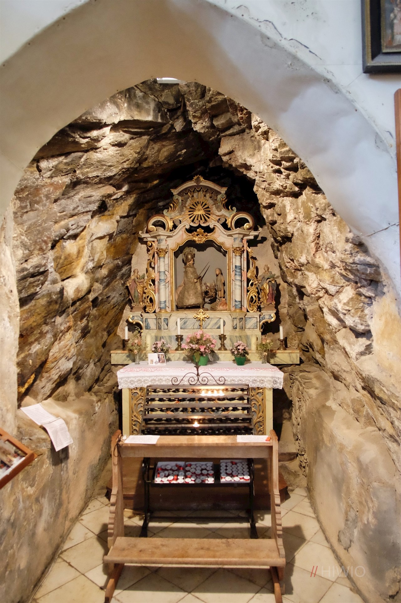 Bevor man mit der Bahn wieder ins Tal schwebt, sollte man sich den Besuch der kleinen Wallfahrtskirche aus dem 16. Jahrhundert nicht entgehen lassen. Sie wurde über einer kleinen Felshöhle errichtet, in der eine Statuette des heiligen Martin aufbewahrt wird – von dieser kleinen Grotte leitet sich übrigens der Name des lauschigen Bergdorfes St. Martin IM Kofel ab.