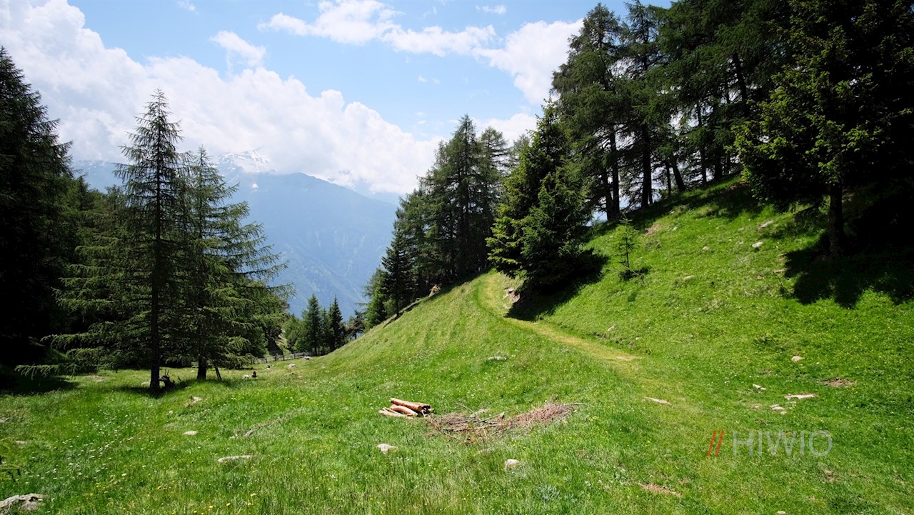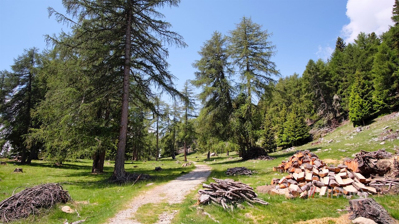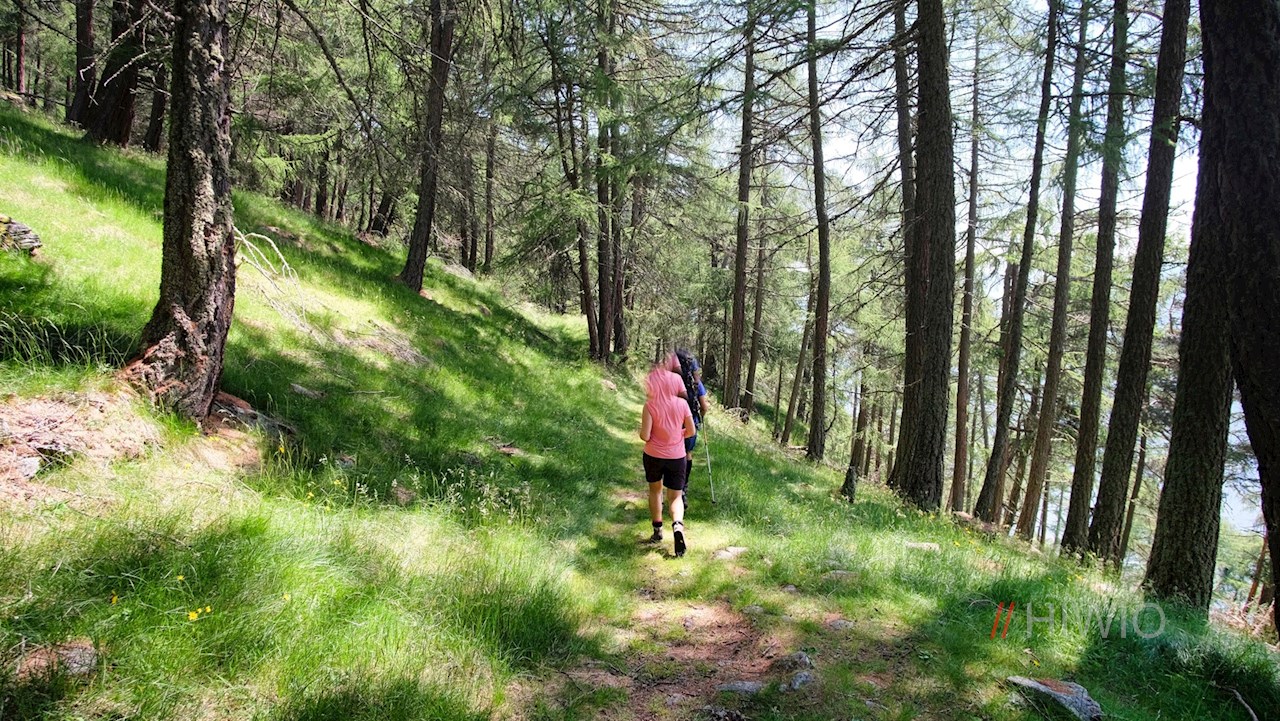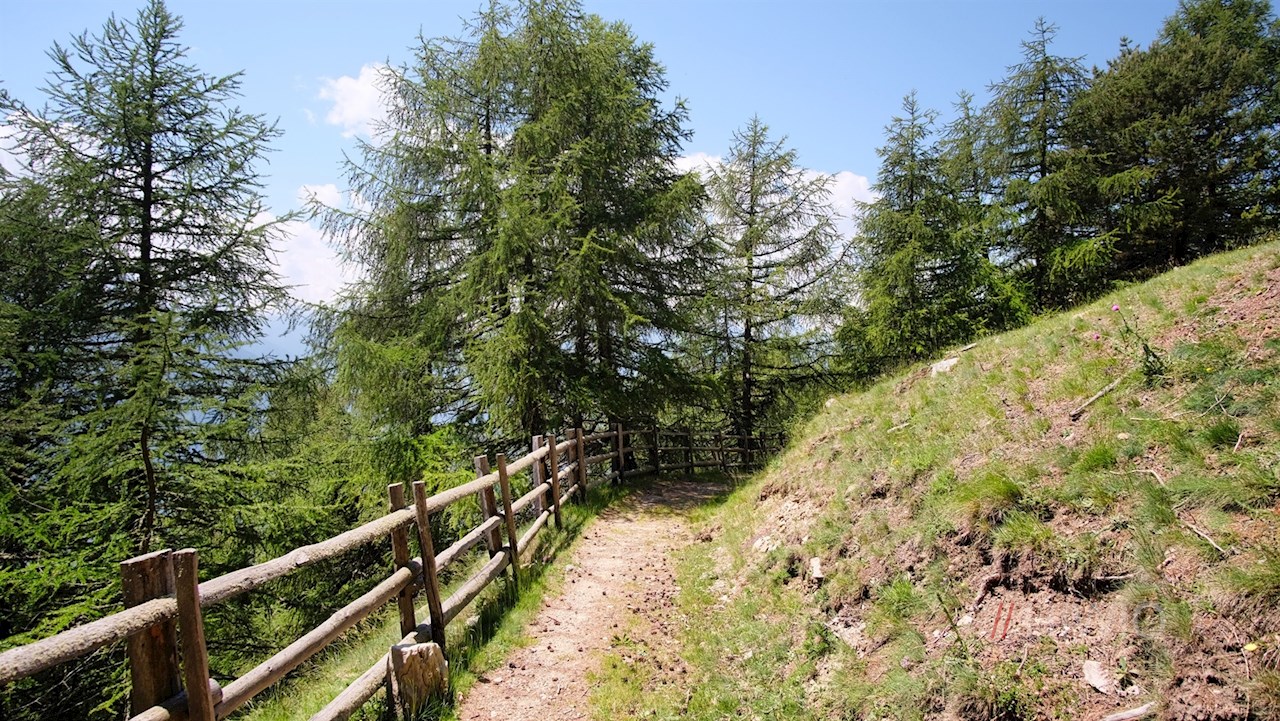 Oben folgt man dem sanften Wanderweg Nr. 2 in Richtung Trumsberg. Er führt zunächst über eine asphaltierte Straße, die wenig später in einen breiten Forstweg übergeht. Unterwegs öffnen sich schöne Ausblicke auf Latsch, ins Martelltal und die ringsum aufstrebende Bergwelt mit dem markanten Hasenöhrl.