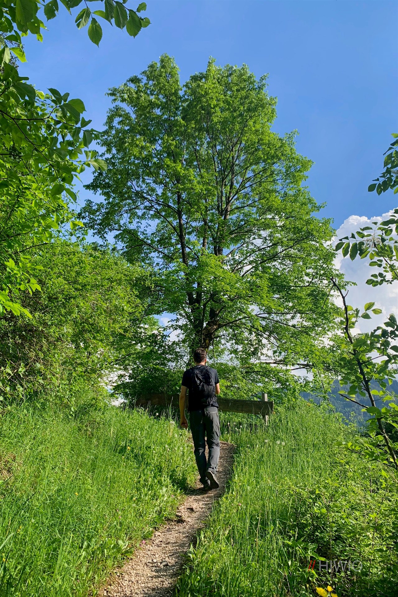 Am Parkplatz weist das Wanderschild Nr. 4 den Anstieg nach St. Sebastian. Er folgt zunächst asphaltierten Wegen, von denen wenig später ein schöner, von hölzernen Kreuzwegstationen gesäumter Waldpfad abzweigt. Er führt im angenehmen Anstieg zum sog. „Weihboden“, auf dem das gotische Kirchlein St. Sebastian thront.