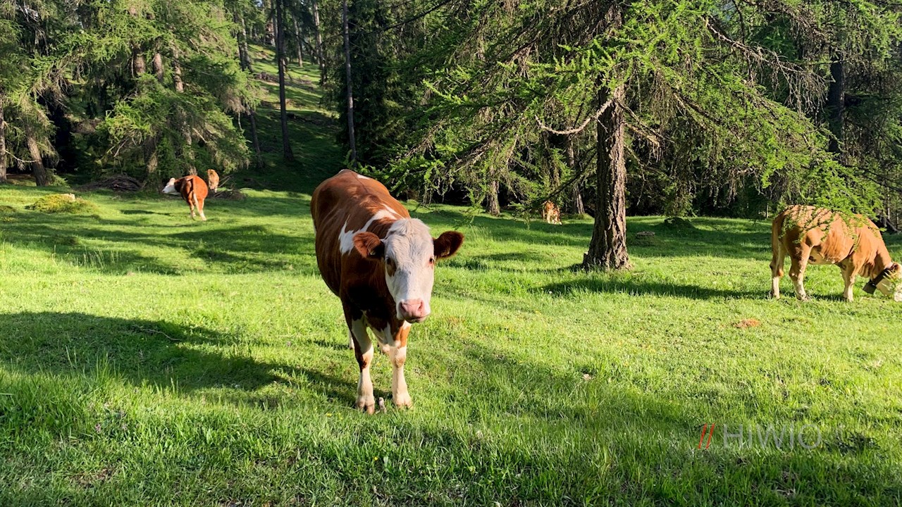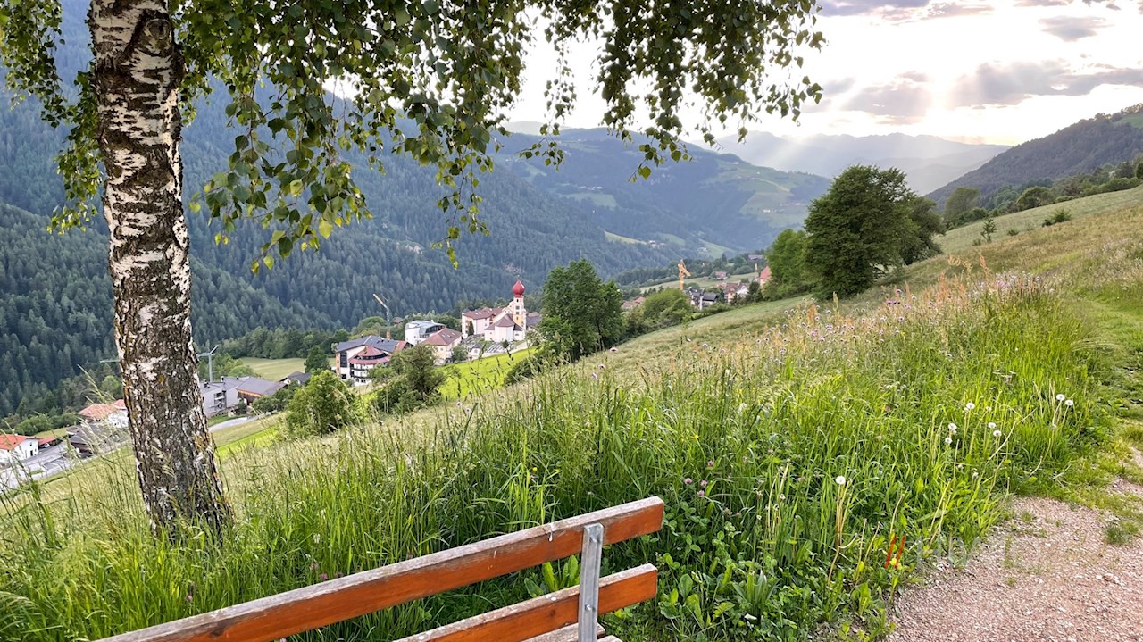 Oberhalb von Tiers weist ein Wanderschild den etwa zehnminütigen Abstieg ins Dorf, in dem gleich mehrere Cafés und Restaurants zur Einkehr laden.