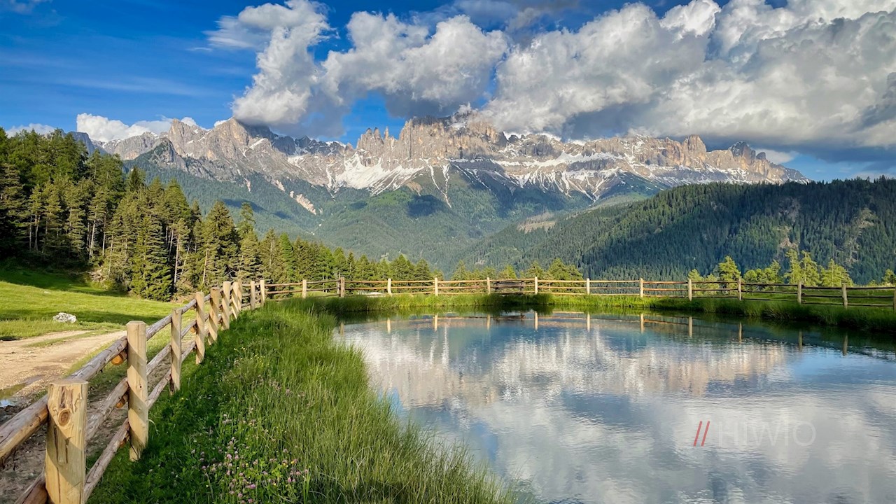 Oberhalb des Kirchleins taucht der Wanderweg Nr. 4 erneut in den Wald ein, durch den er zum nunmehr nahen Wuhnleger ansteigt. In dieser malerischen Almwiese öffnet sich wenig später ein atemberaubend schöner Ausblick auf die majestätischen Felswände des Rosengarten und des Latemar, die sich im lauschigen, von Libellen, Kröten, Salamandern und anderen Kleintieren bewohnten Weiher spiegeln. Aussichtsbänke laden zum Verweilen und Genießen dieser traumverlorenen Idylle ein.