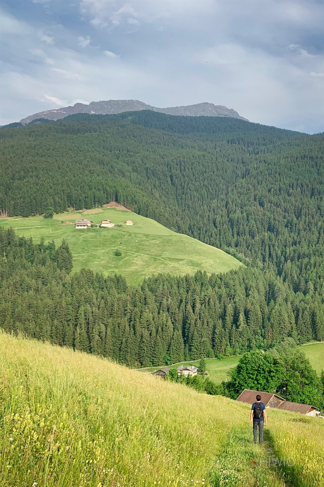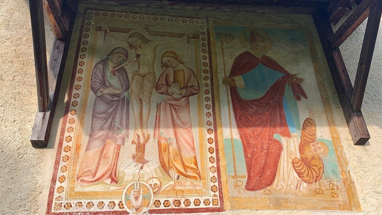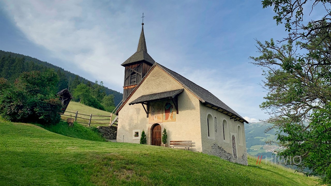 Nach einer guten halben Stunde gemütlichen Wanderns erreicht man das romanische Kirchlein St. Valentin mit dem hölzernen Glockenturm. Wie bereits sein Name verrät, ist es dem heiligen Valentin, dem Schutzpatron der Liebenden und der Verlobten, geweiht, der die Westfassade des Wallfahrtskirchleins ziert. Auch in seinem Inneren birgt St. Valentin suggestive, bis zu 700 Jahre alte Fresken.