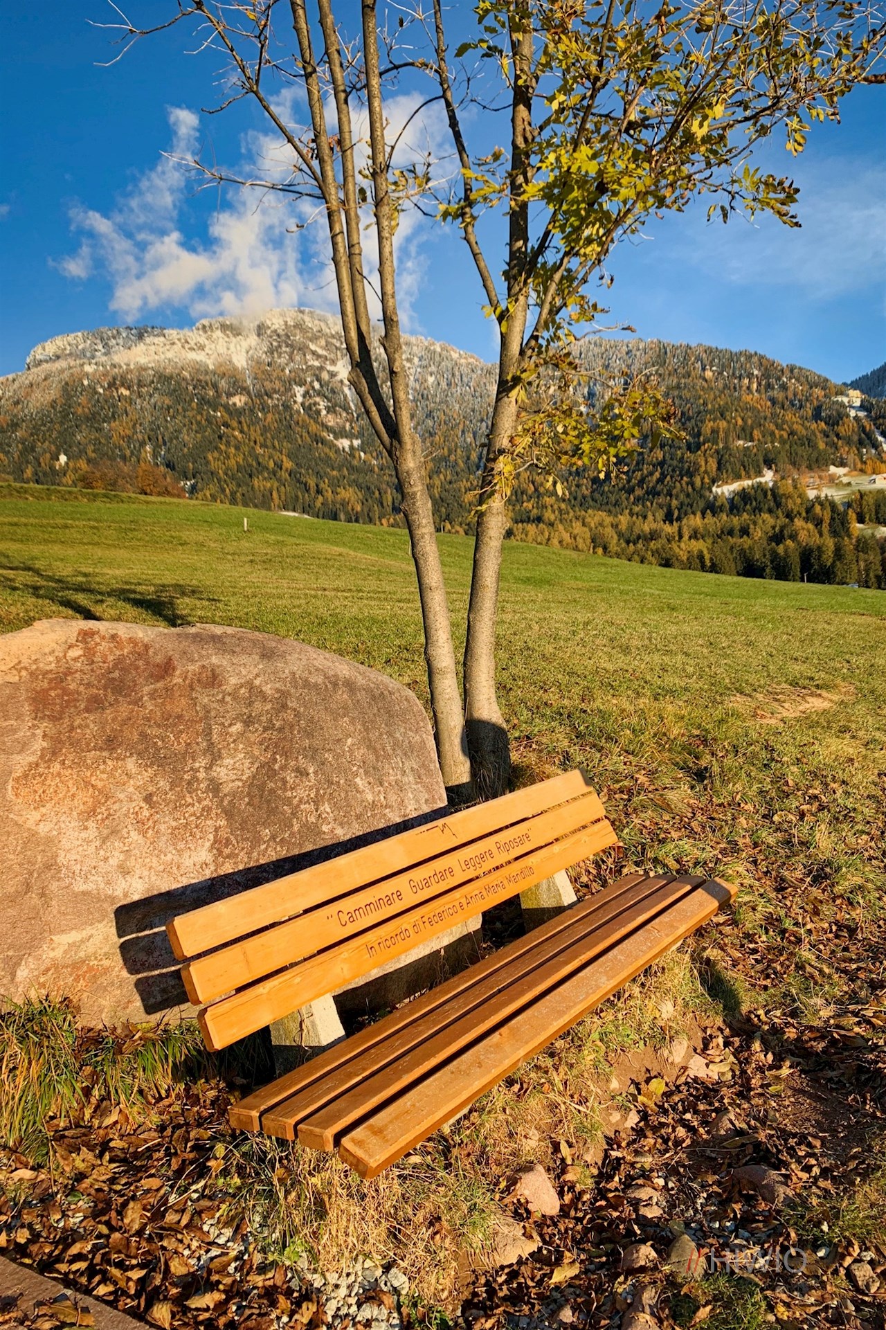 Von der St. Valentin Kirche führt die Wanderung zur nahen Aussichtsbank weiter. Hier zweigt der Weg rechts ab und führt vor der Kulisse des Schlern wieder nach Seis hinab.