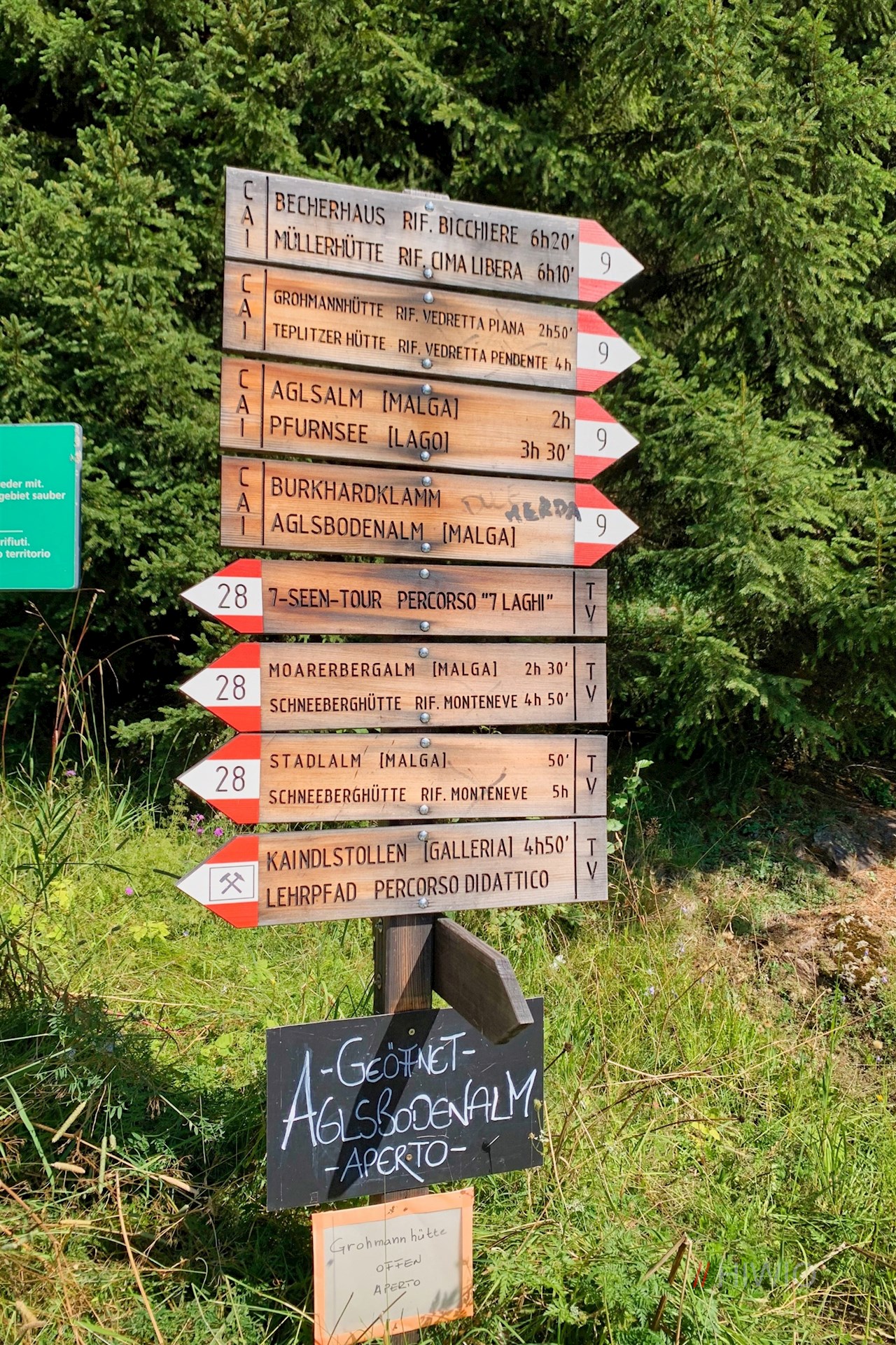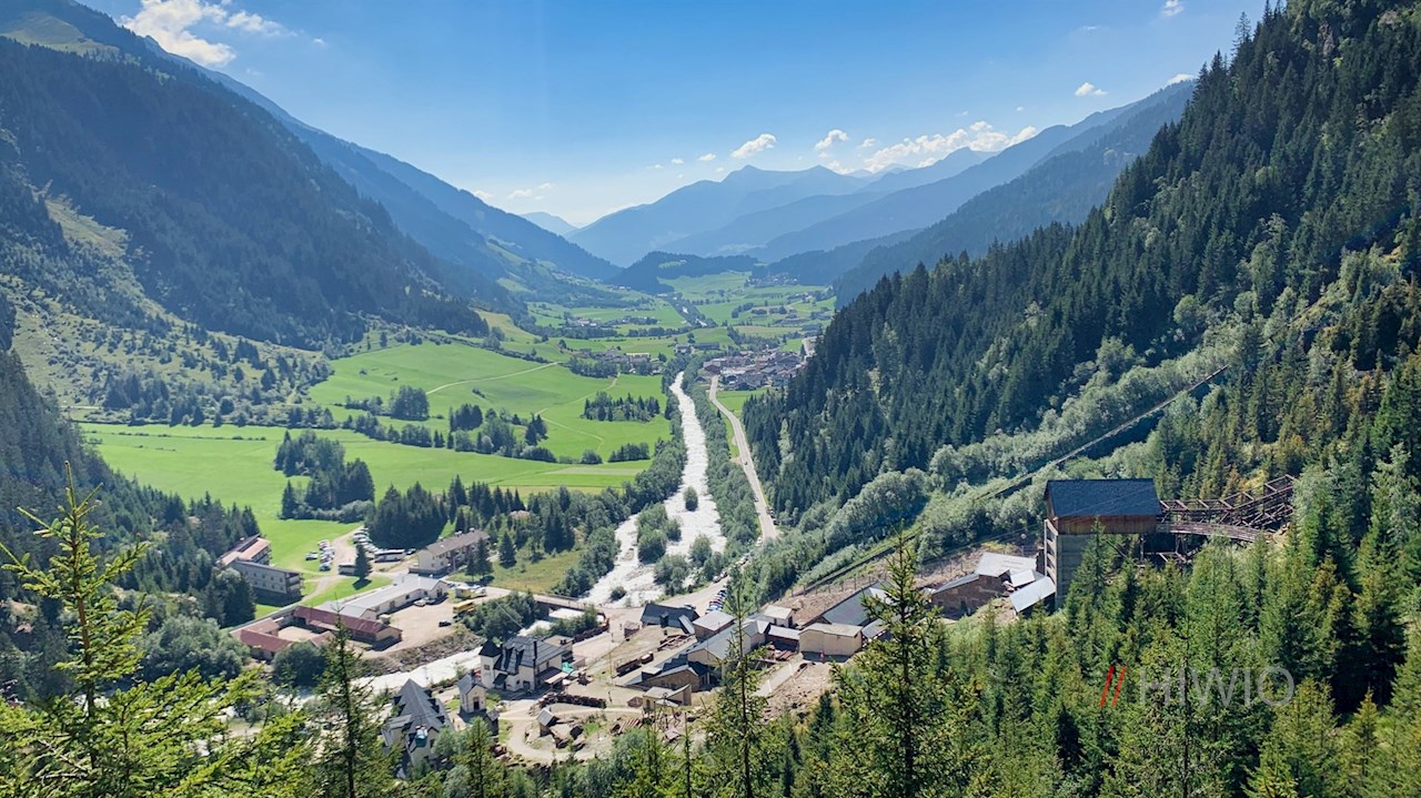 Hier weist das Wanderschild Nr. 28 den Weg zur Stadlalm. Er folgt zunächst einem recht steil ansteigenden Sträßchen, das schließlich in einen sanften Wanderweg übergeht. Unterwegs öffnen sich immer wieder schöne Ausblicke ins Ridnauntal, auf das einstige Bergwerk und die ringsum aufragende Bergwelt.