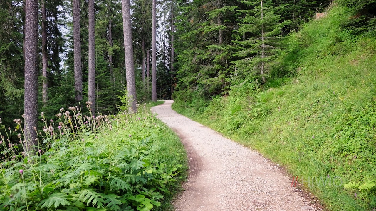 Hinter der Parkplatzunterführung hält man sich rechts, wandert kurz den schimmernden Karersee entlang und folgt kurz darauf dem rechts abzweigenden Wanderweg Nr. 8 in Richtung Stadlalm.