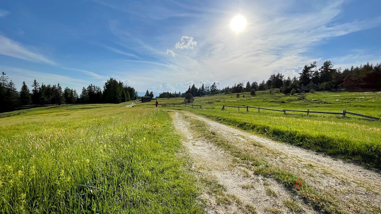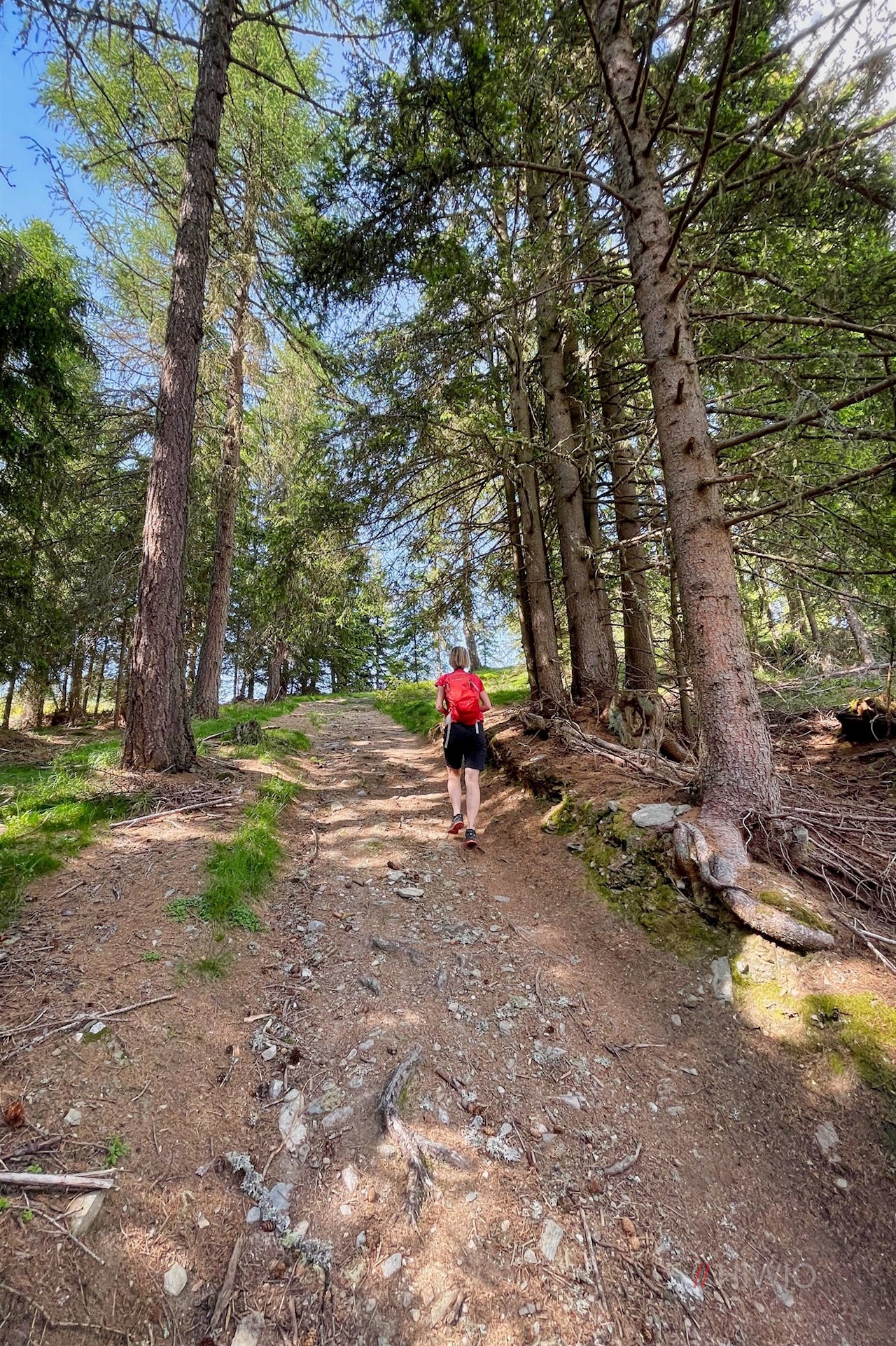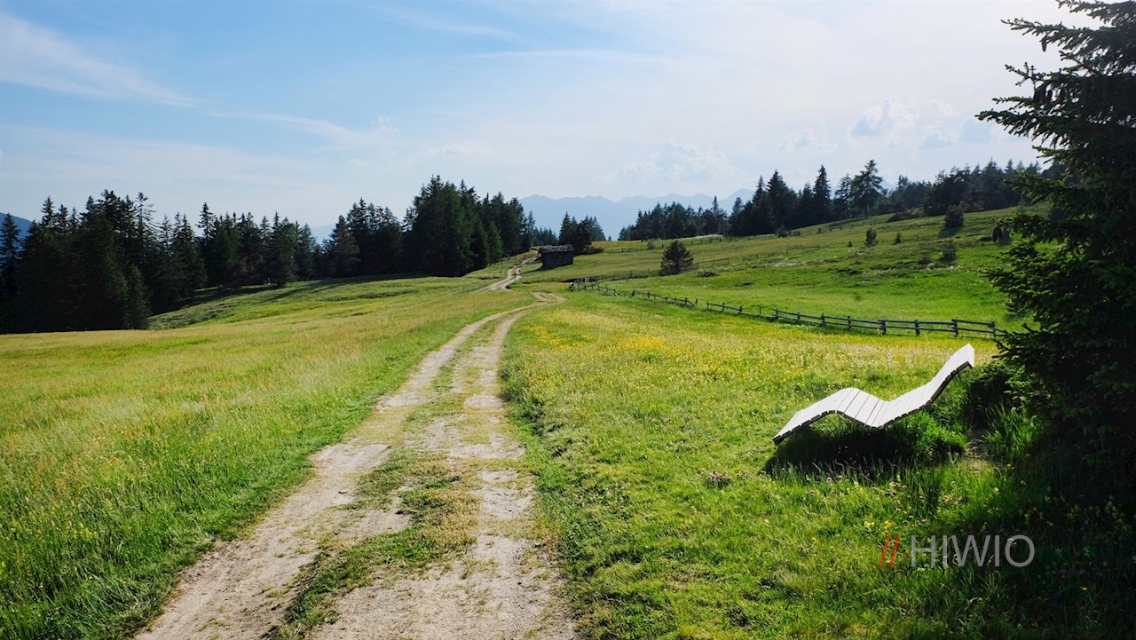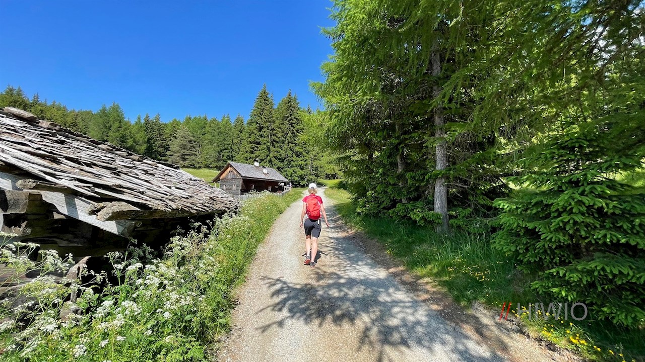 Am Parkplatz weist das Wanderschild Nr. 3 den Weg auf die Lüsner-Rodenecker Alm. Er schlängelt sich im sanften Anstieg durch lichten Wald, der hie und da schöne Ausblicke auf die gegenüberliegende Bergwelt freigibt.