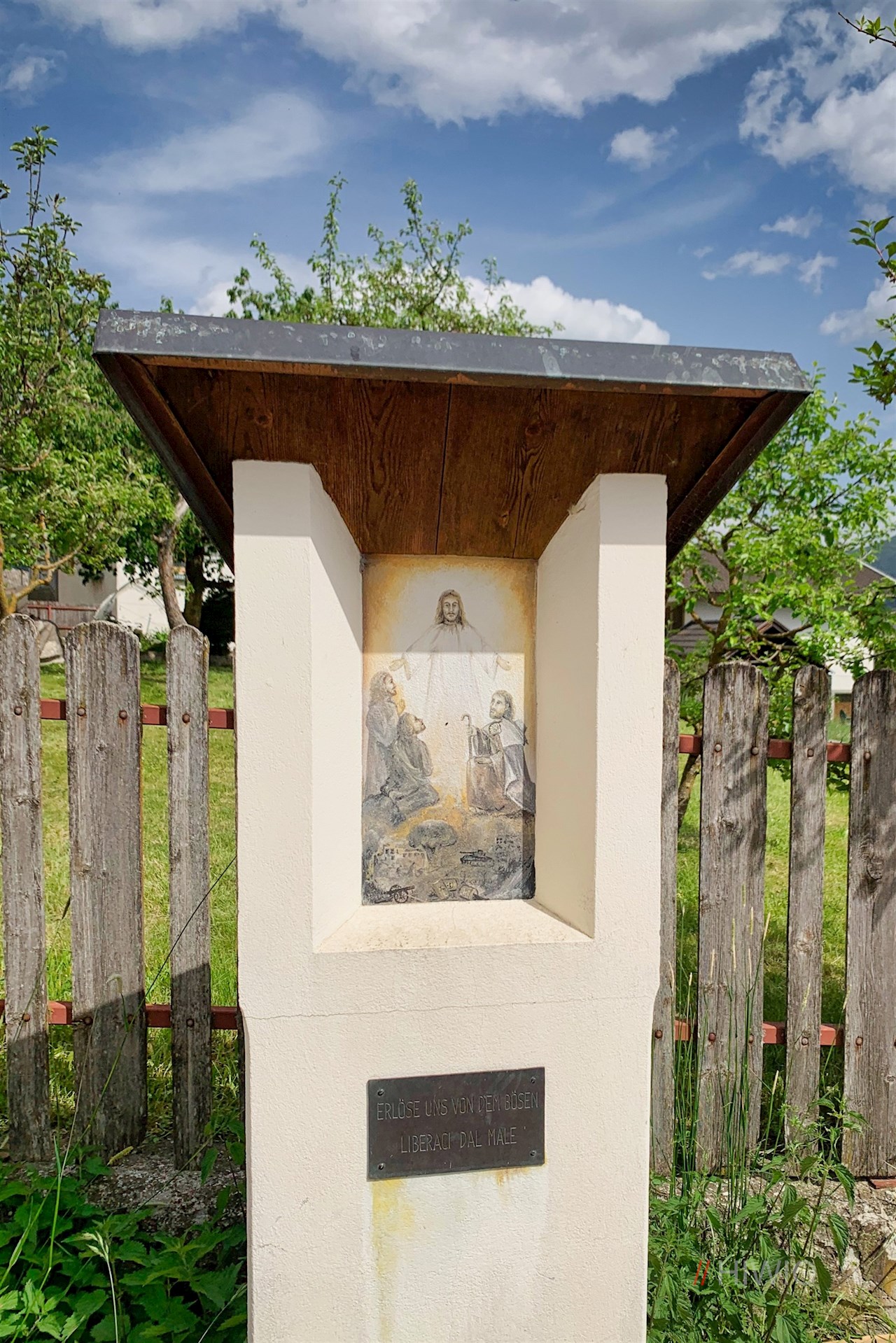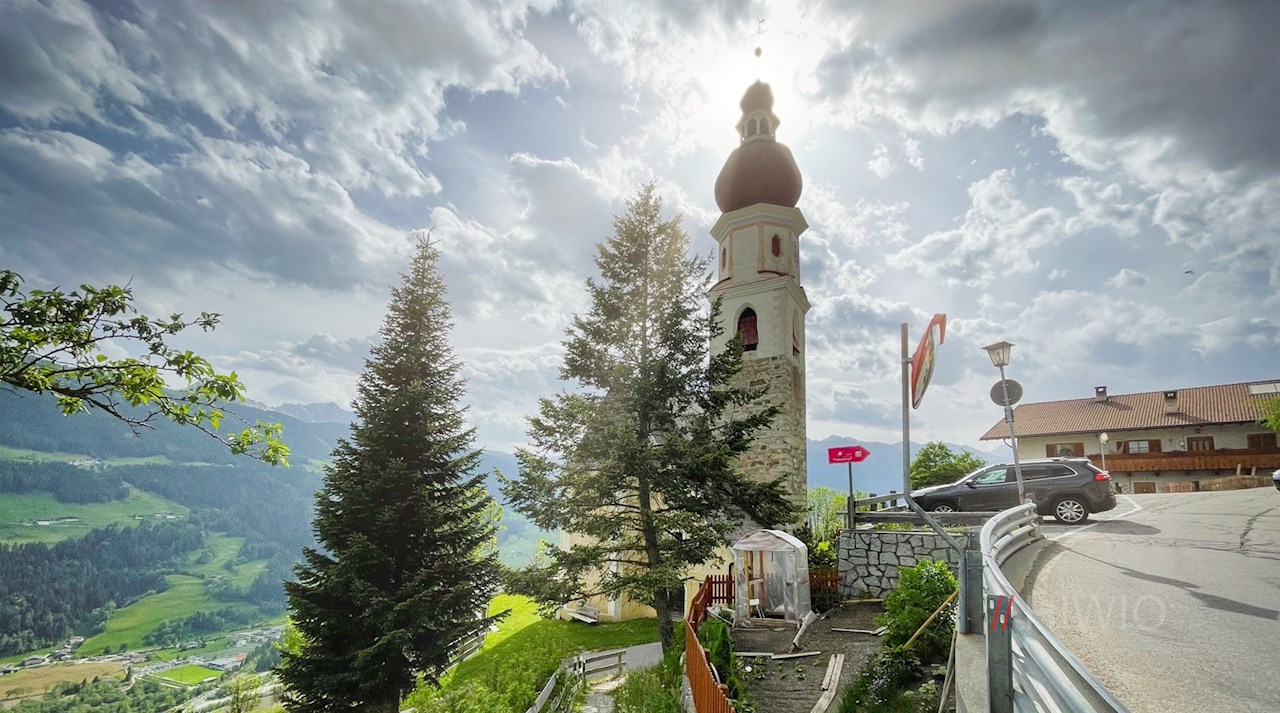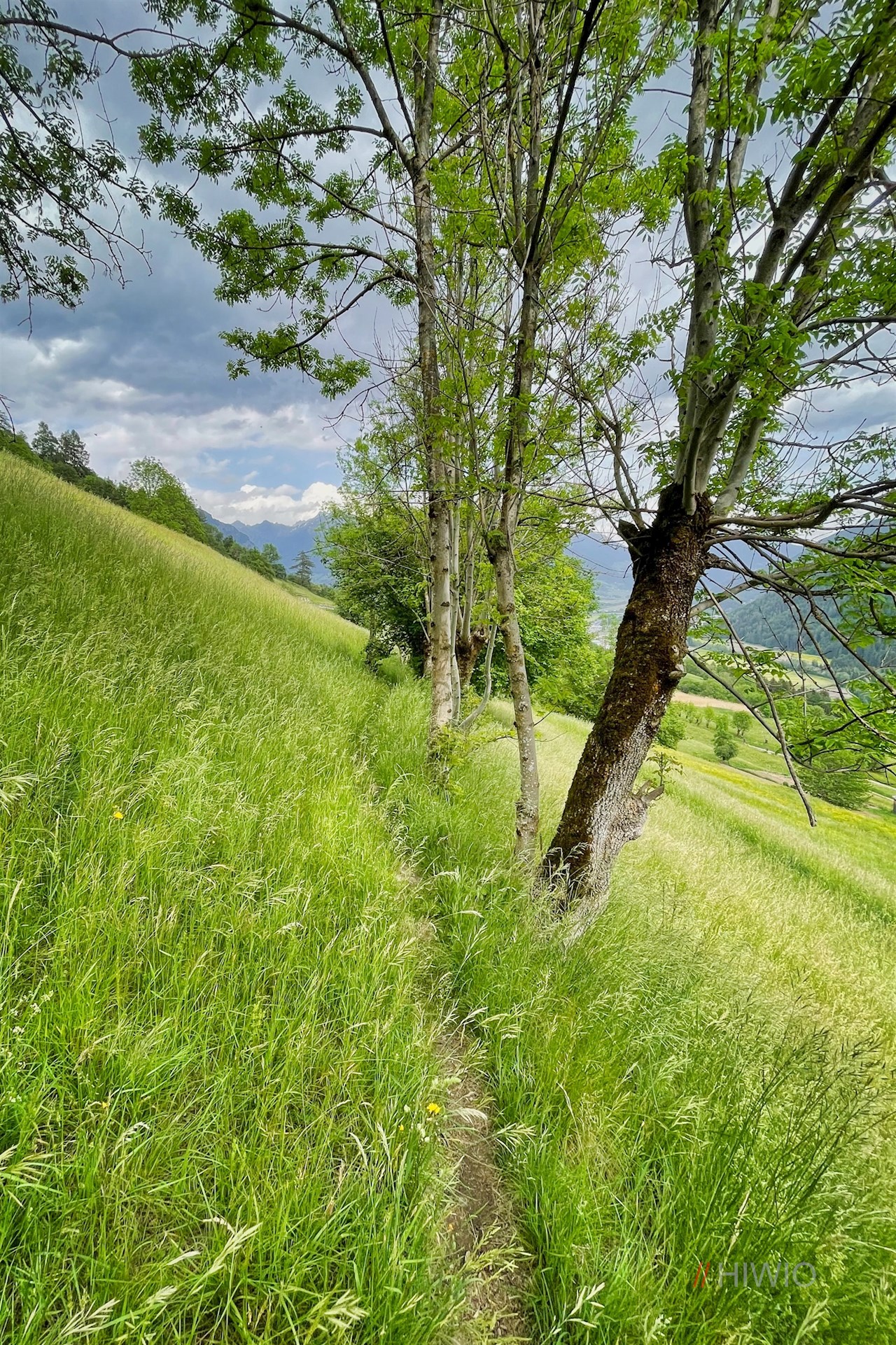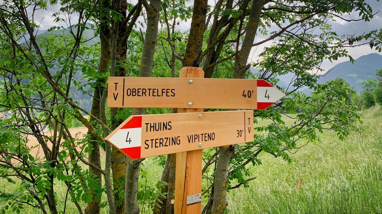 Hinter der Kirche weist das Wanderschild Nr. 4 den Anstieg nach Obertelfes. Er führt zunächst zum westlichen Dorfrand, überquert dort die Straße und geht unterhalb des Restaurants Lahnerhof in einen sanft verlaufenden Wiesenweg über.