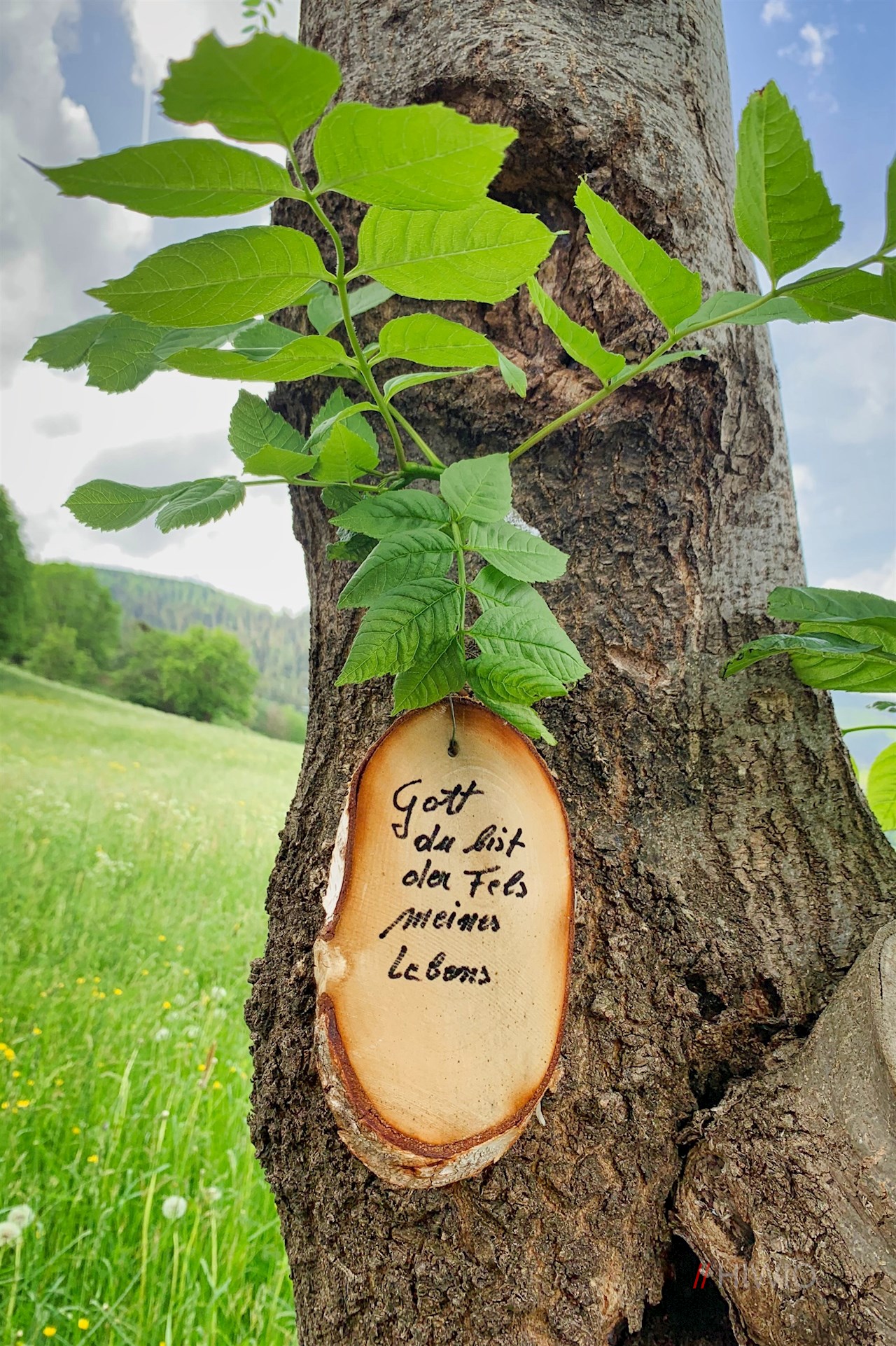Bei der Bushaltestelle neben der Kirche ist der Besinnungsweg zur Jakobskirche bereits ausgeschildert. Er zweigt hinter dem Hotel Engel rechts ab und steigt durch sonnenbeschienene Wiesen und lichte Haine ins höher gelegene Dorf Thuins an. Unterwegs zeichnen suggestive Besinnungsstationen das Vaterunser nach.