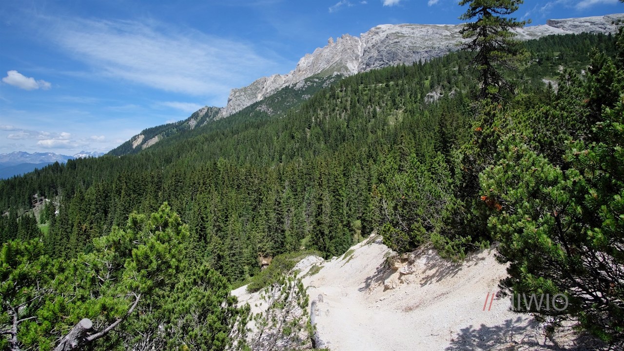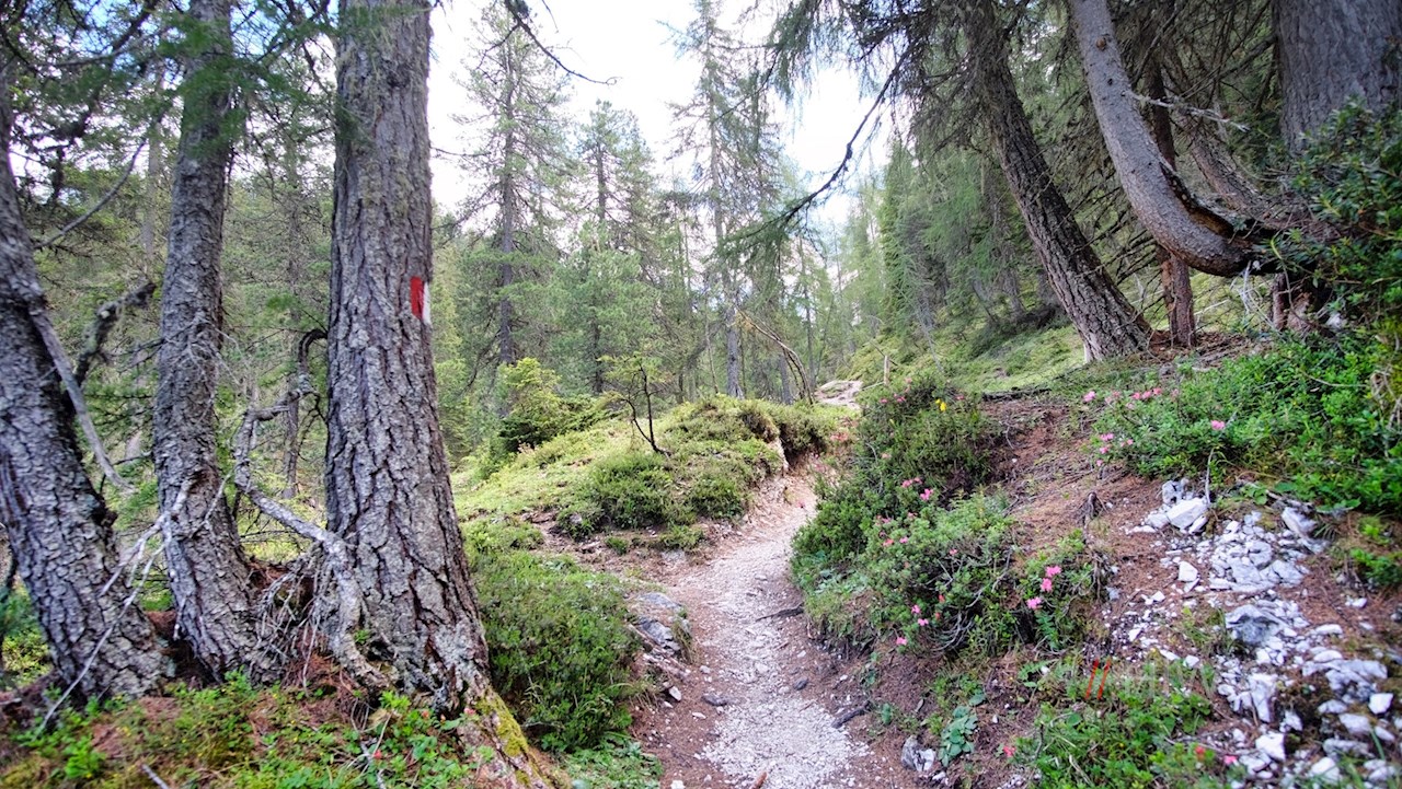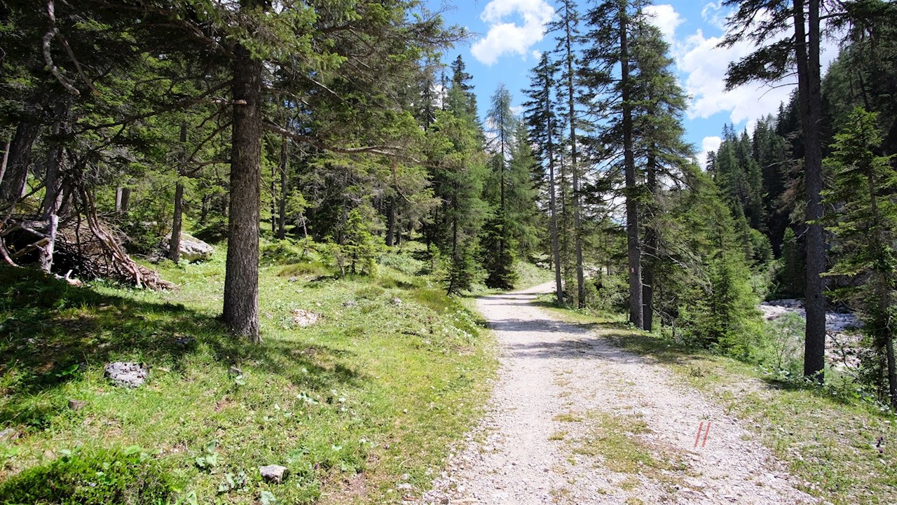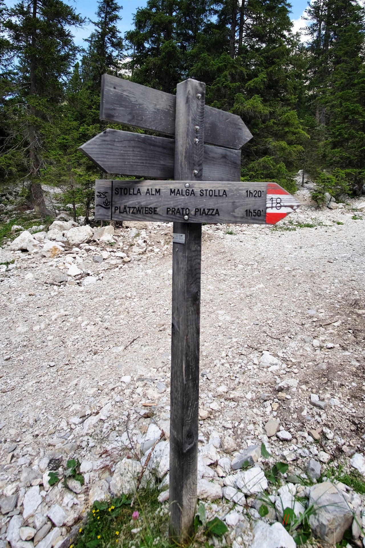 Hinter dem kostenpflichtigen Parkplatz zweigt der breite Wanderweg Nr. 18 in Richtung Stolla Alm ab. Er führt im angenehmen Anstieg durch Wald und kleine Wiesenlichtungen und kreuzt dabei dreimal die Bergstraße. Ständiger Wegbegleiter ist der munter plätschernde Stolla-Bach.