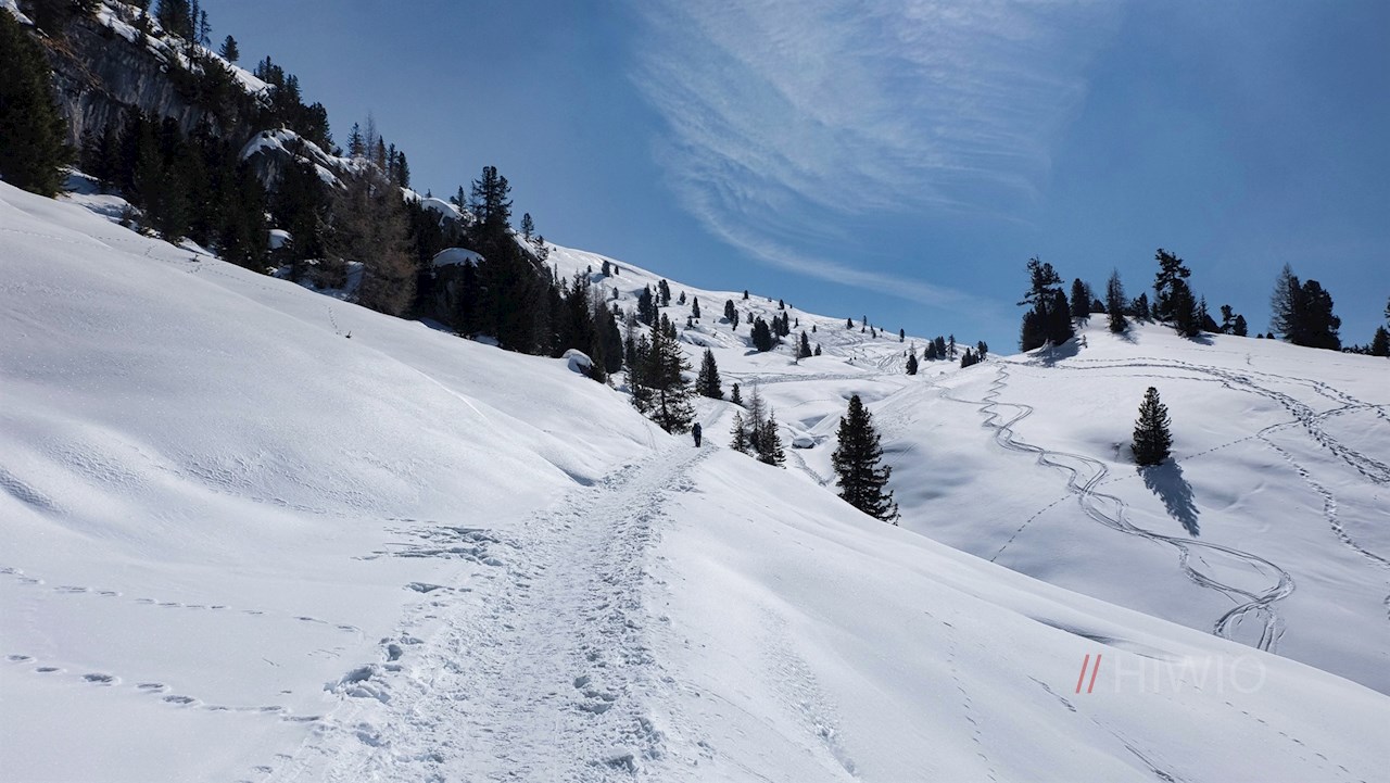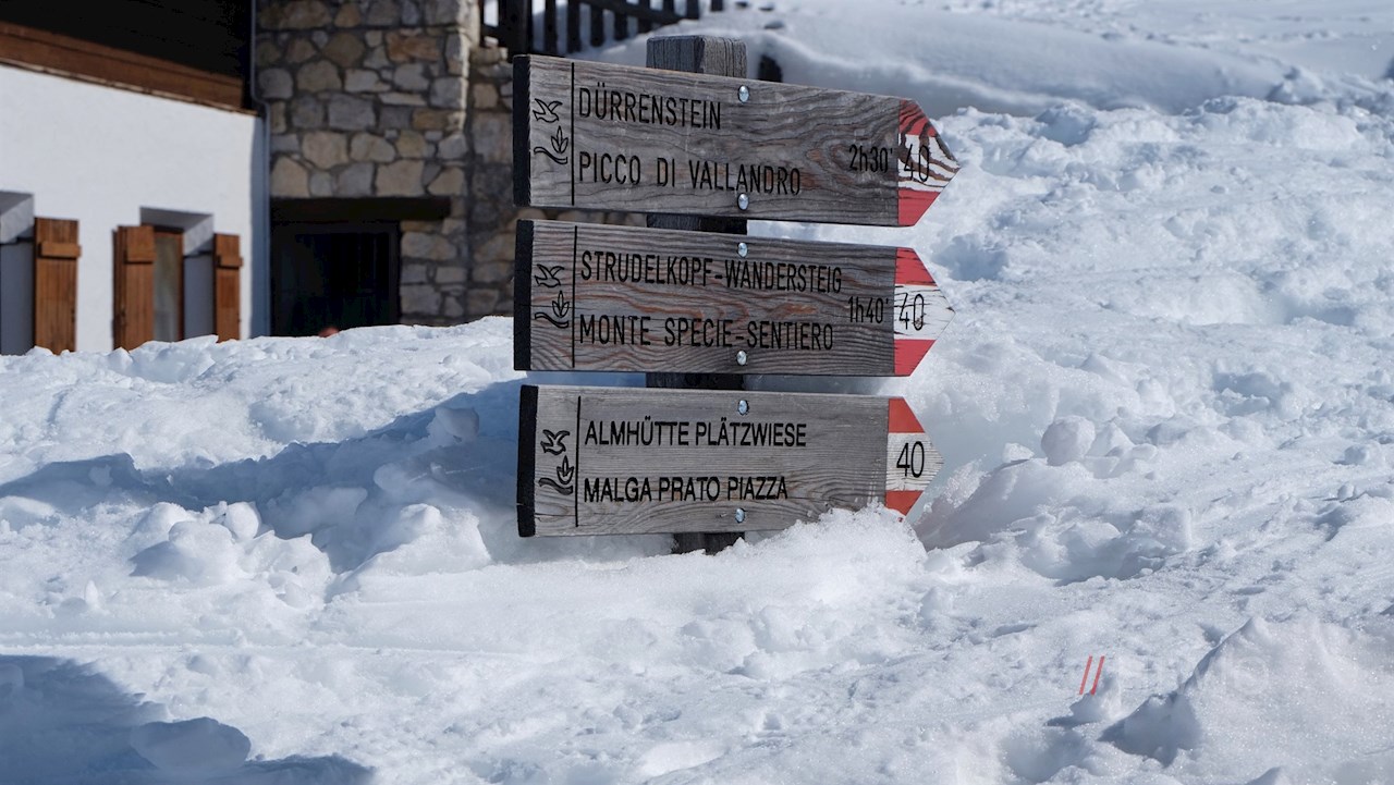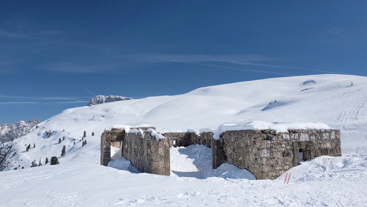 Hier zweigt der Weg Nr. 34 in Richtung Strudelkopf ab. Er führt im angenehmen Anstieg über die anfangs bewaldeten Hänge auf den Strudelkopfsattel. Dort erinnert eine mittlerweile verfallene Festungsanlage an den grausamen Gebirgskrieg, der hier während des Ersten Weltkriegs tobte.