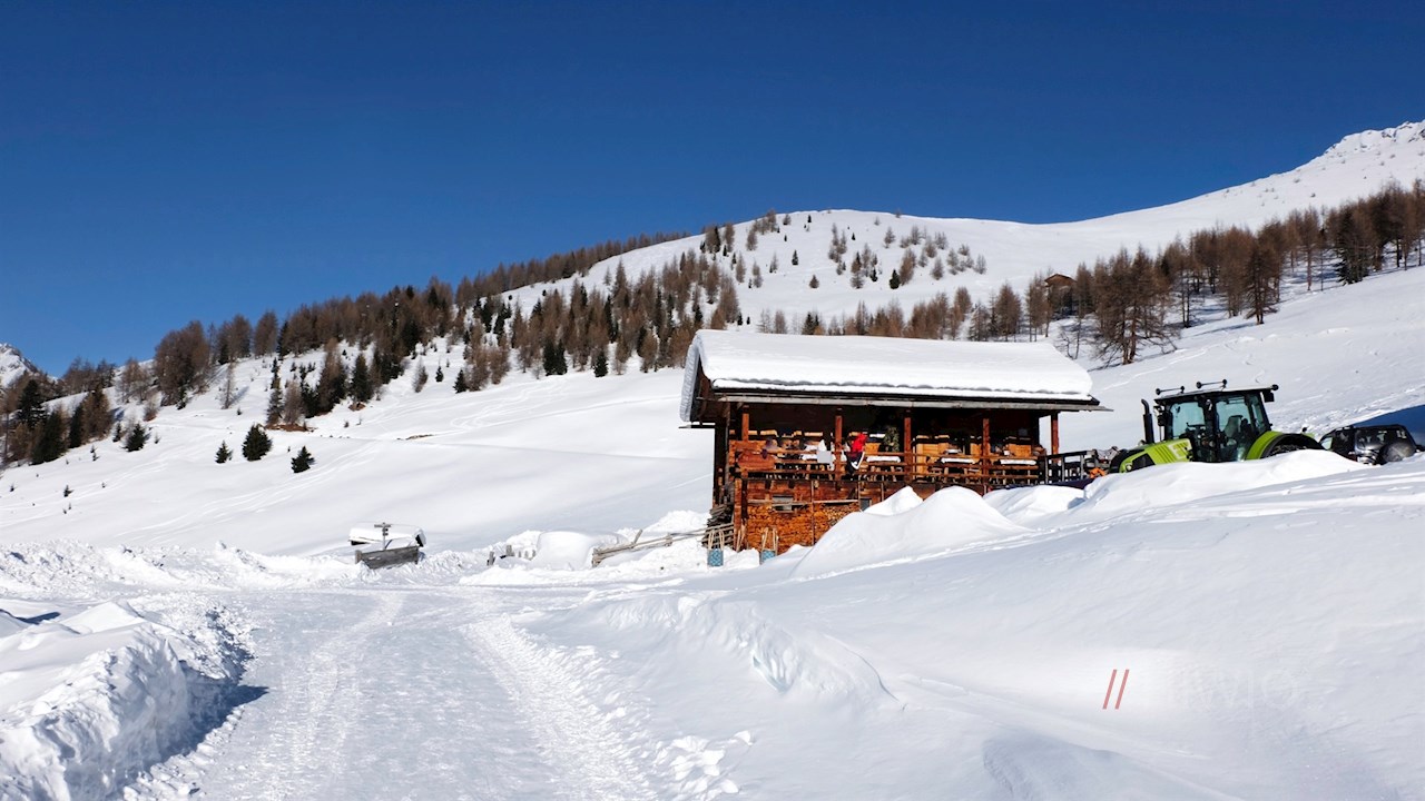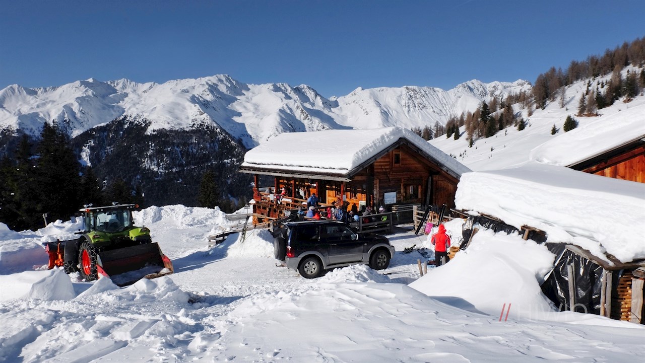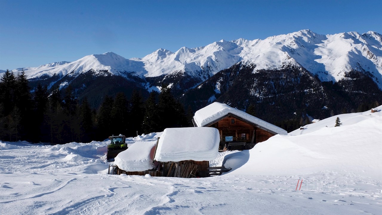 Die Stumpfalm in Gsies ist auch im Winter geöffnet. Zu dieser malerisch gelegenen Almhütte führt ein breiter Wanderweg, der in der kalten Jahreszeit auch als Rodelbahn genutzt wird.