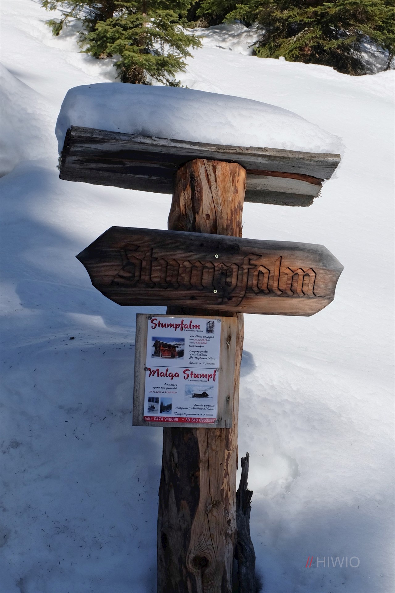 Nach etwa zwei Stunden lichtet sich der Wald und gibt den Blick auf die idyllisch gelegene Stumpfalm frei, in der die Gäste auch im Winter mit liebevoll zubereiteten Südtiroler Spezialitäten verwöhnt werden (Öffnungszeiten von Ende Dezember bis Ende März; Stand 2022).