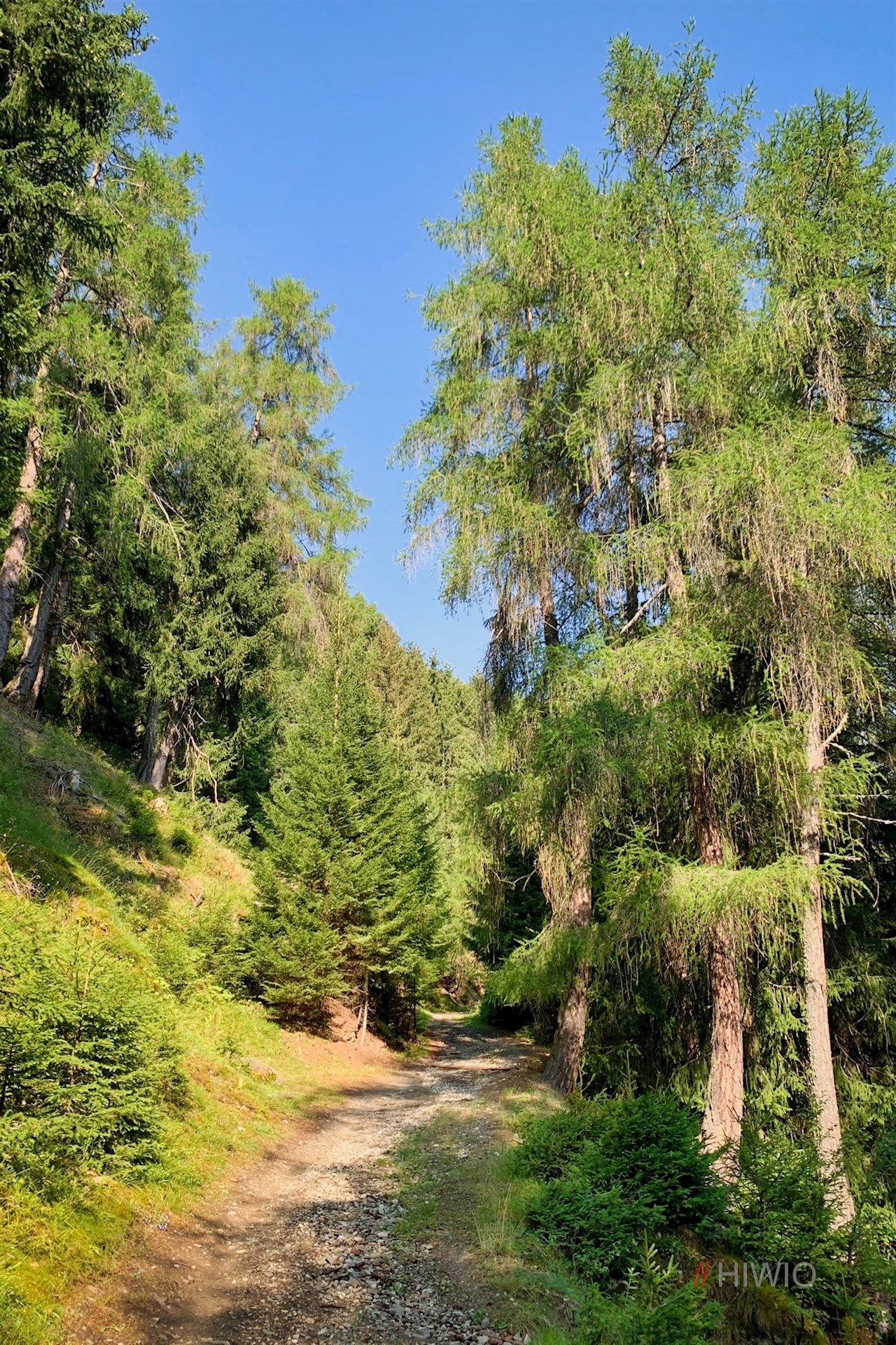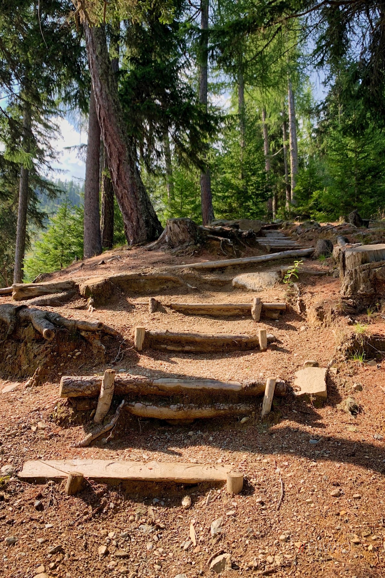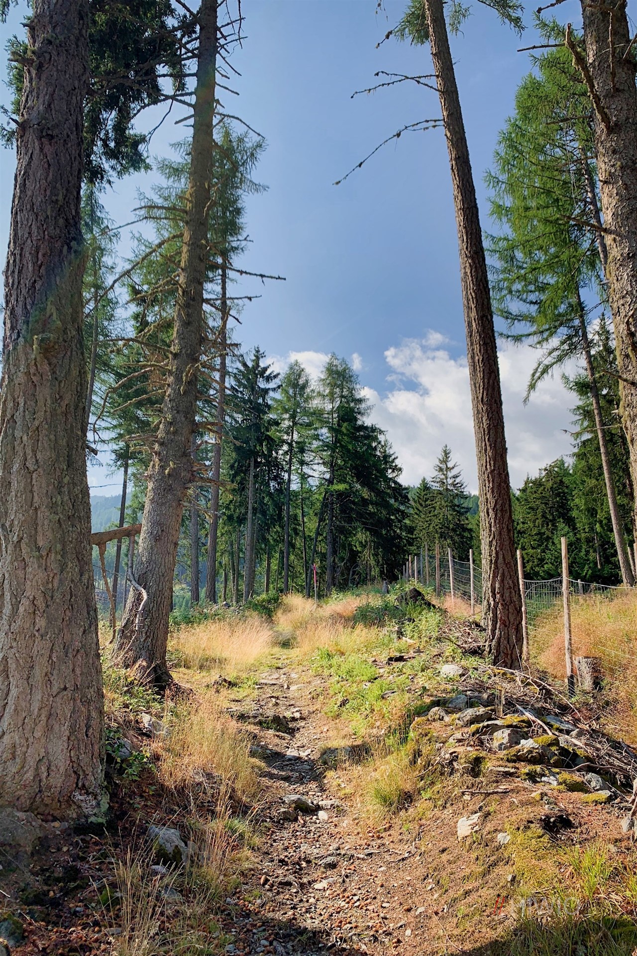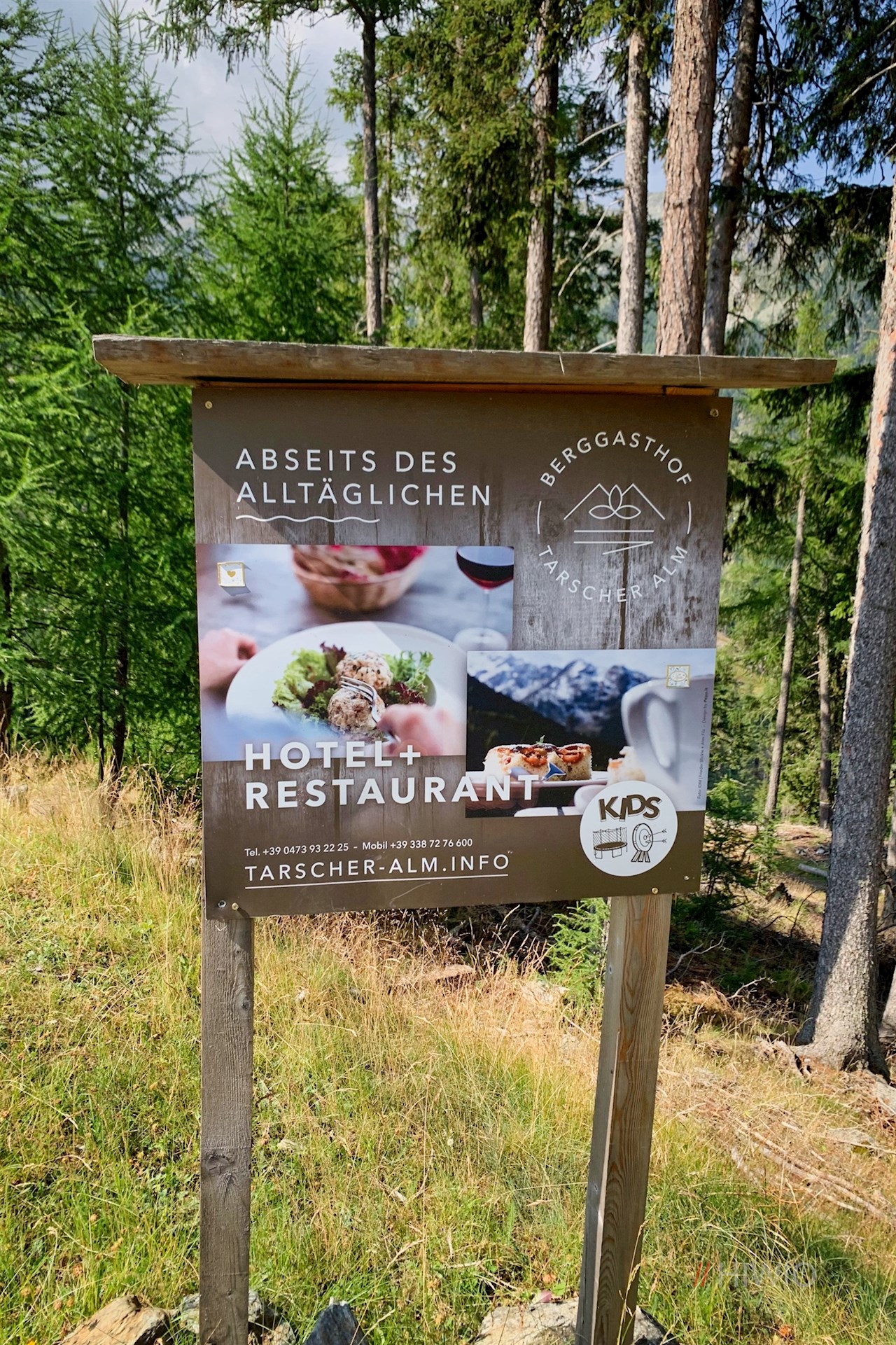 Neben dem Sessellift weist das Wanderschild Nr. 1 den Anstieg zur Tarscher Alm. Er taucht sogleich in einen schattenverheißenden Nadelwald ein, durch den er sich anfangs recht gemächlich seinen Weg bahnt.