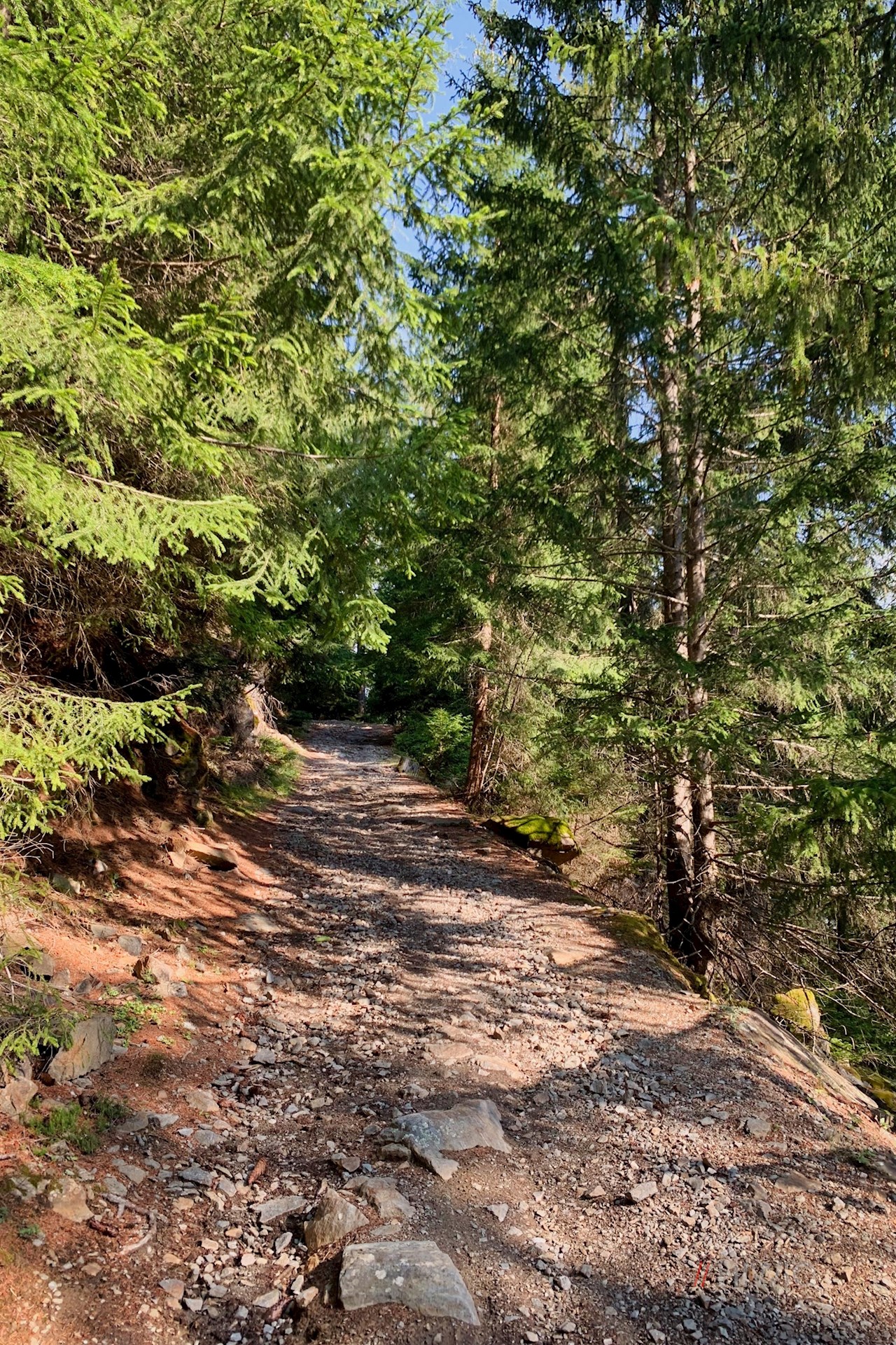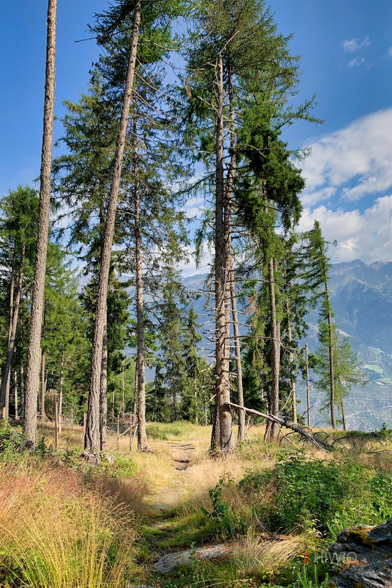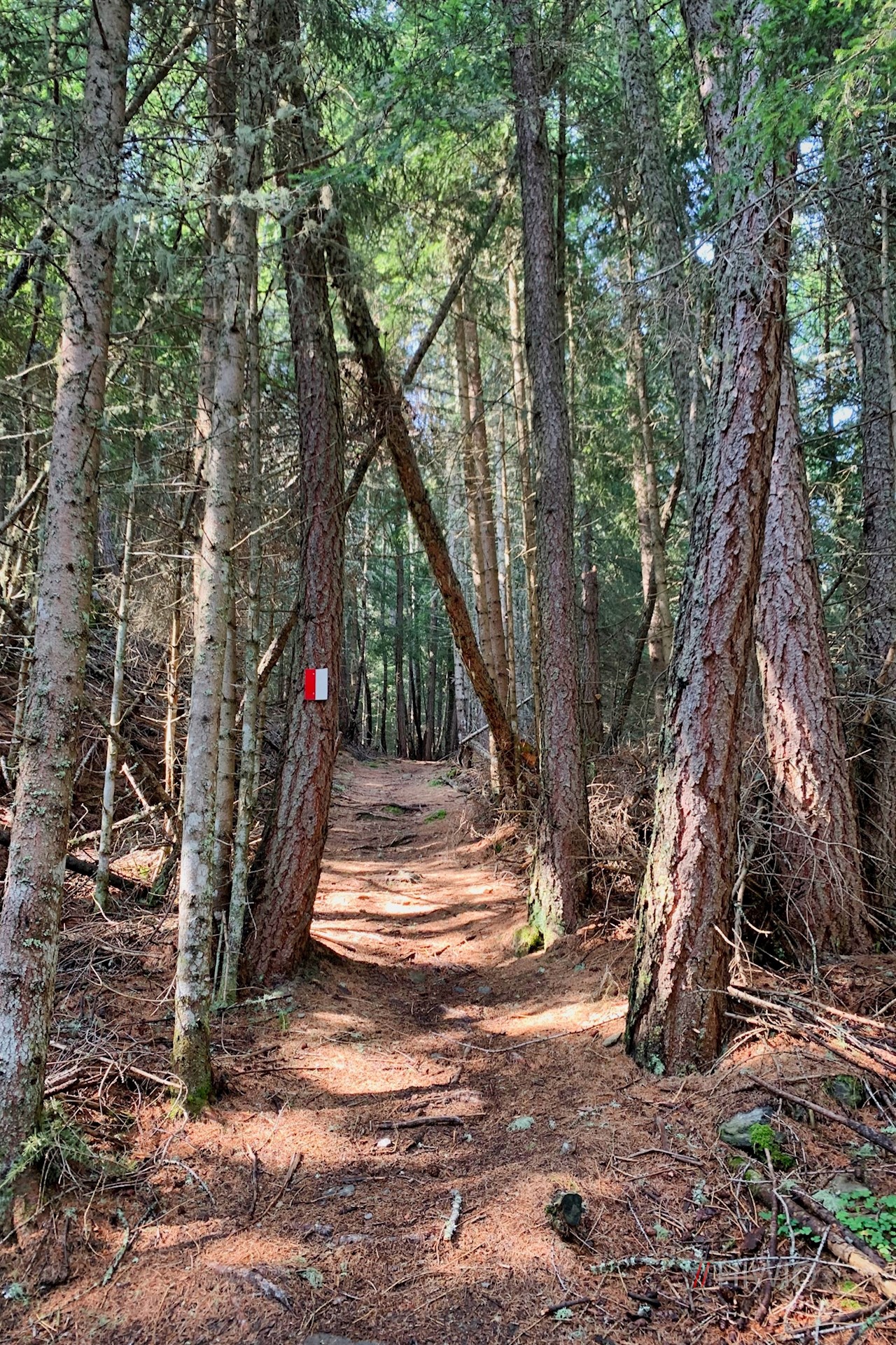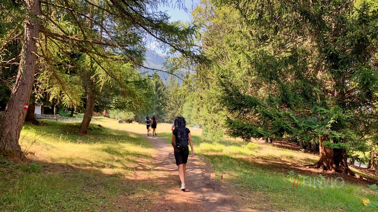 Neben dem Sessellift weist das Wanderschild Nr. 1 den Anstieg zur Tarscher Alm. Er taucht sogleich in einen schattenverheißenden Nadelwald ein, durch den er sich anfangs recht gemächlich seinen Weg bahnt.