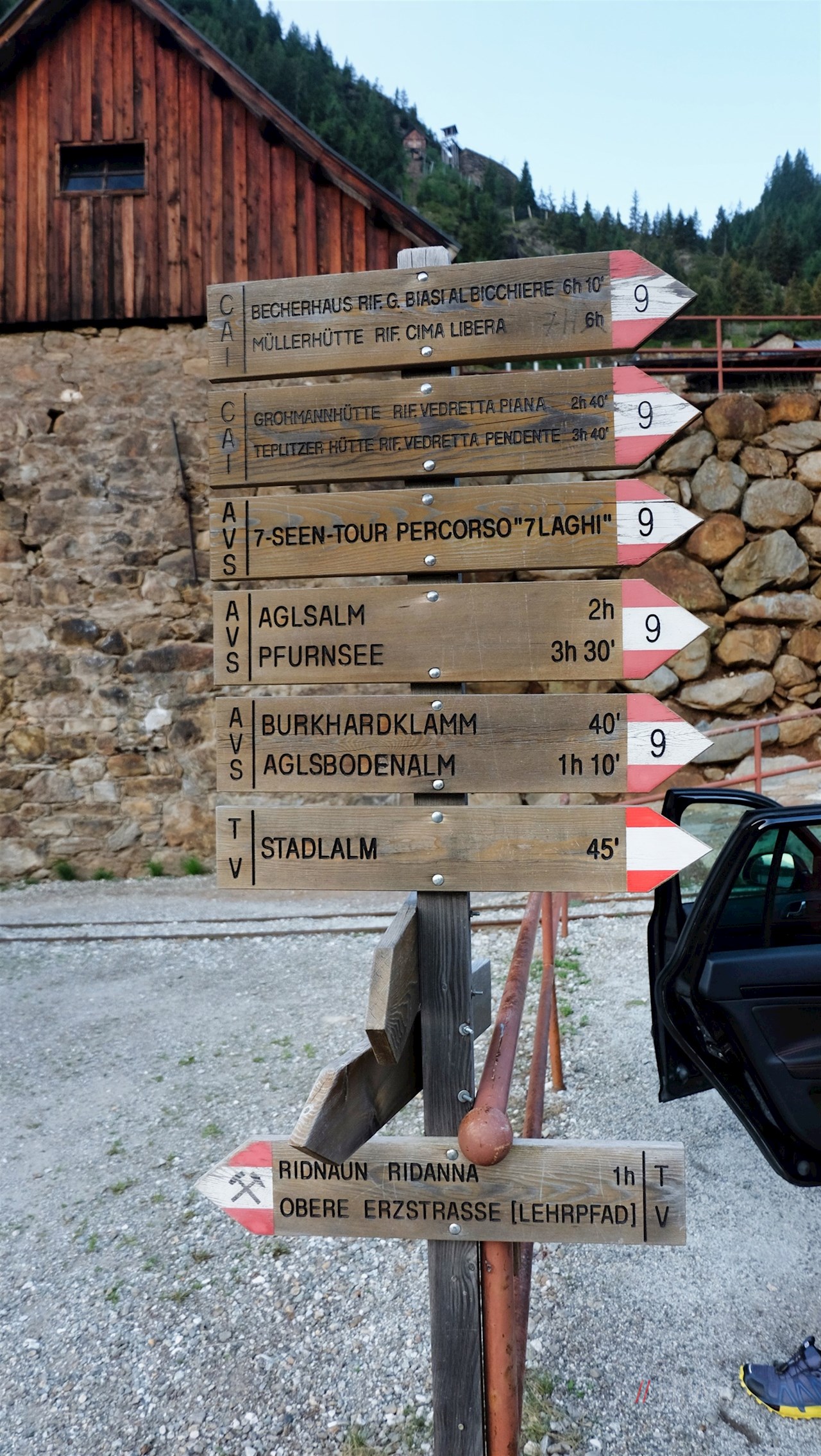 Am Wanderparkplatz weist die Beschilderung Nr. 9 den Weg in Richtung Grohmann- bzw. Teplitzer Hütte.