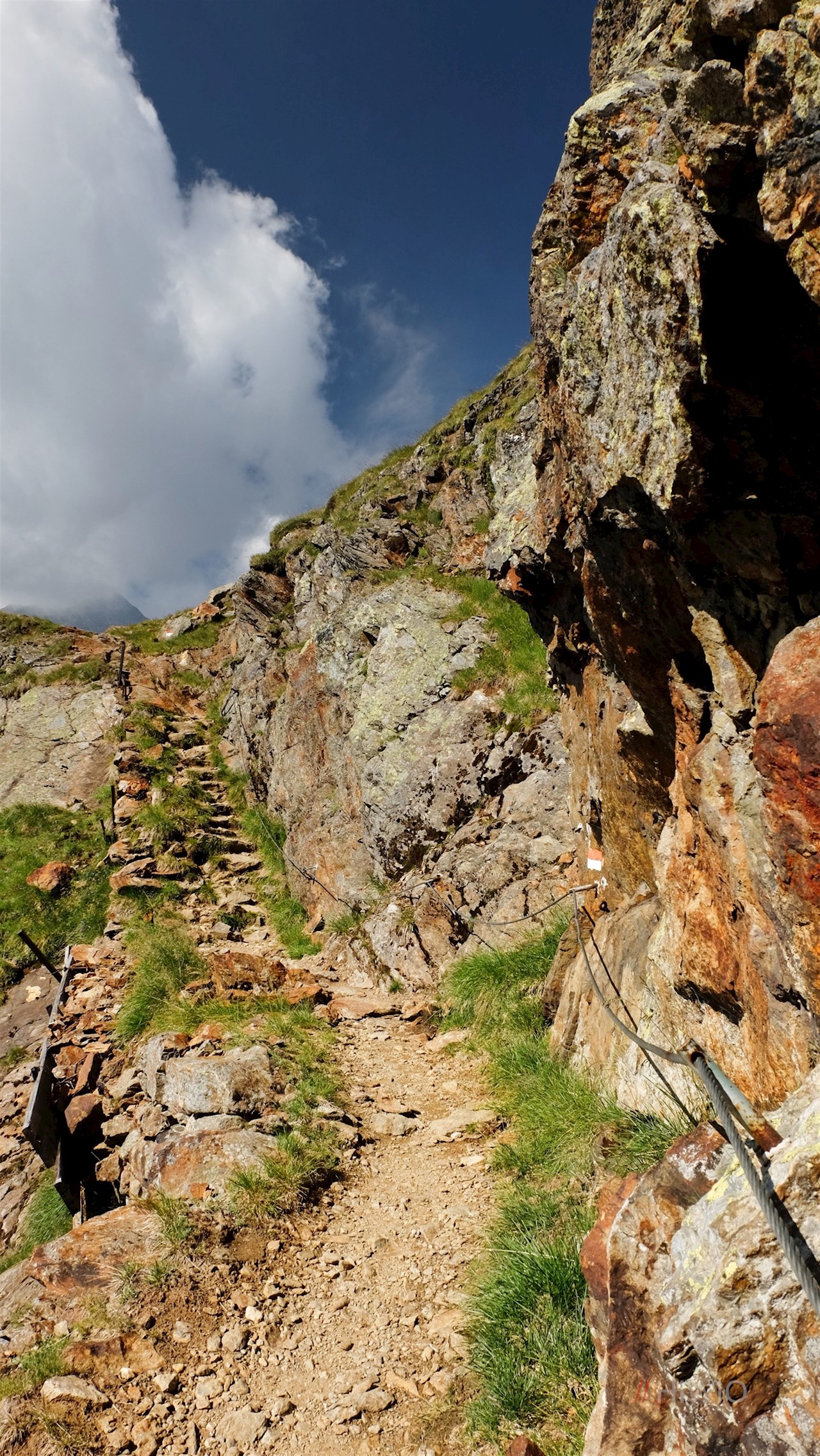 Nahe der Grohmannhütte rückt unser eigentliches Ziel erneut ins Blickfeld: die auf einem kargen Felsen thronende Teplitzer Hütte, zu der sich der schmale Pfad nun ziemlich steil nach oben windet. Einige ausgesetzte, aber relativ einfach zu überwindende Passagen sind mit einer Stahlbrücke und Stahlseilen gesichert.
