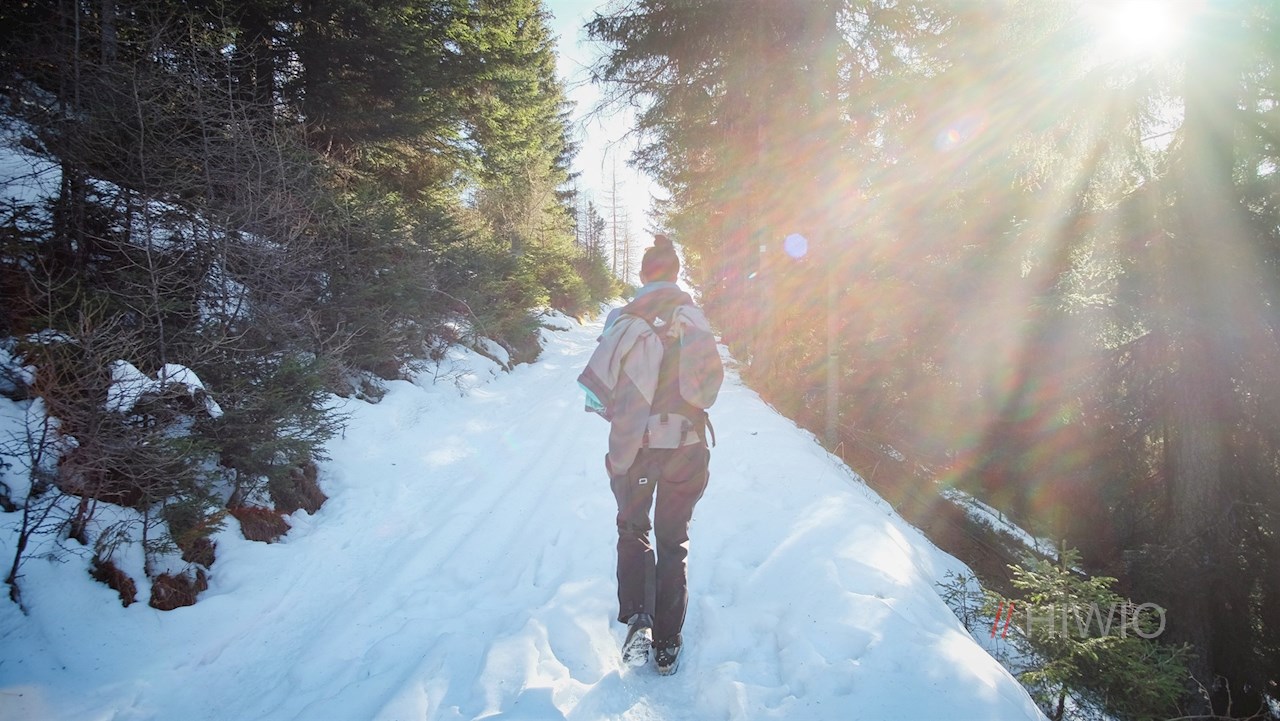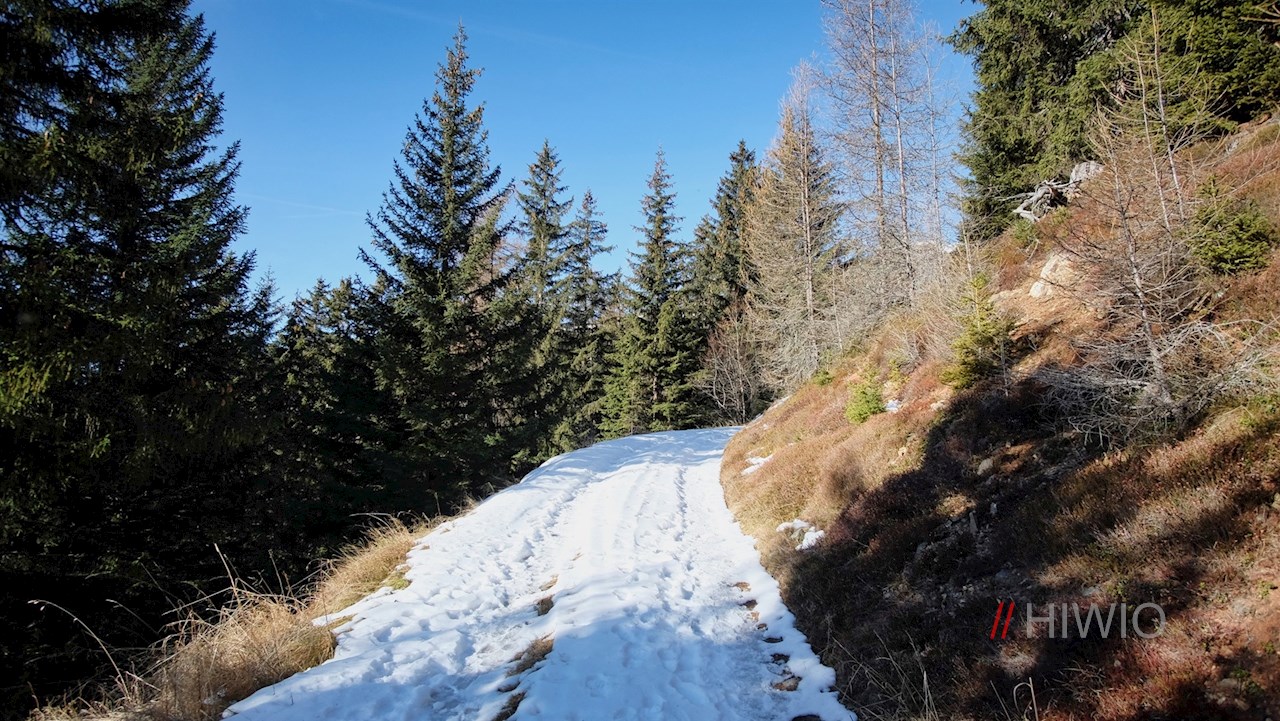 Am Parkplatz folgt man dem breiten Wanderweg Nr. 8A in Richtung Gols. Er führt im sanften Anstieg durch den winterlich verschneiten Nadelwald.