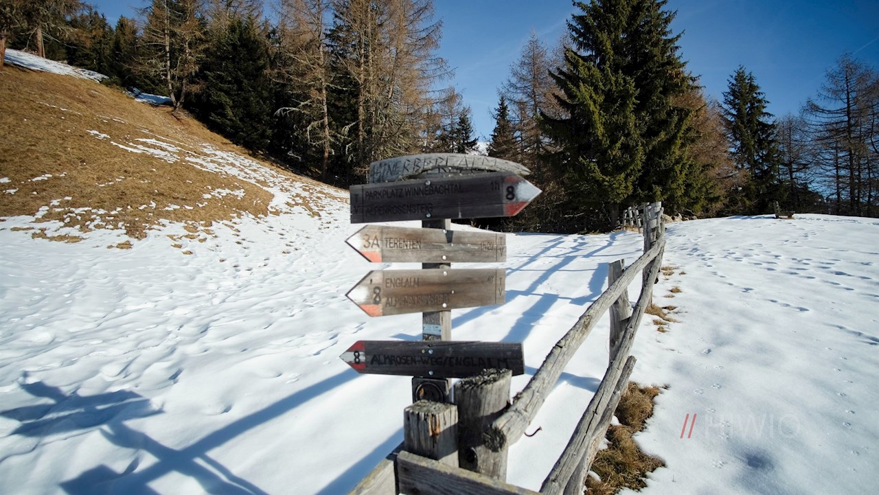 Die Winterwanderung zu den Natursolarien auf dem Gols nimmt am kleinen Wanderparkplatz am oberen Ende der Sonnbergstraße ihren Anfang, die man über Terenten anfährt (die Sonnbergstraße zweigt kurz vor dem Weiler Margen rechts ab).