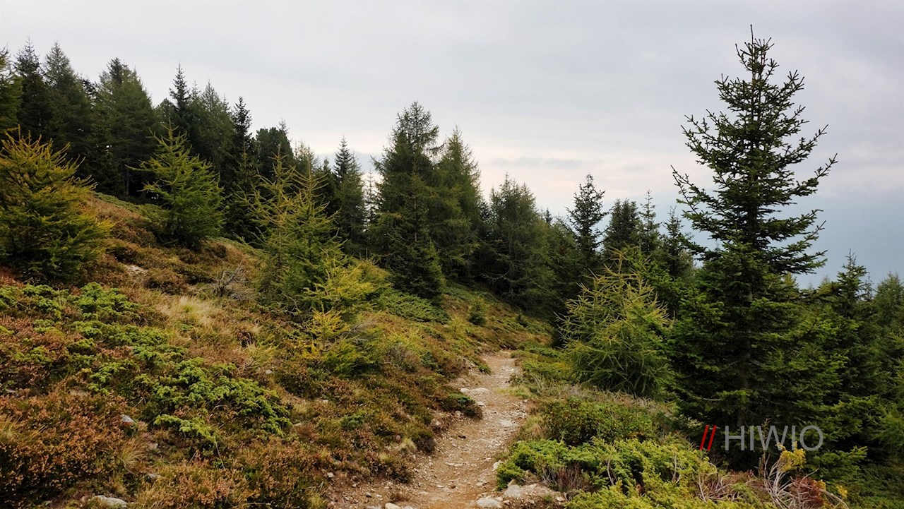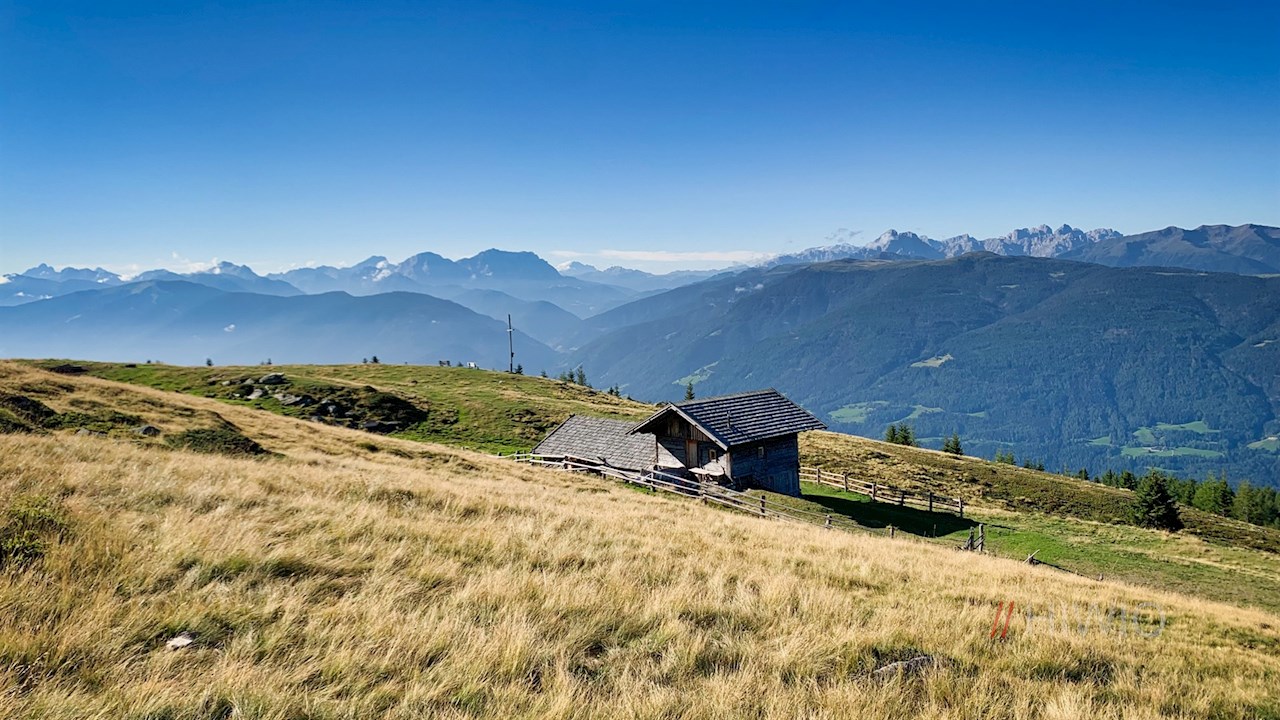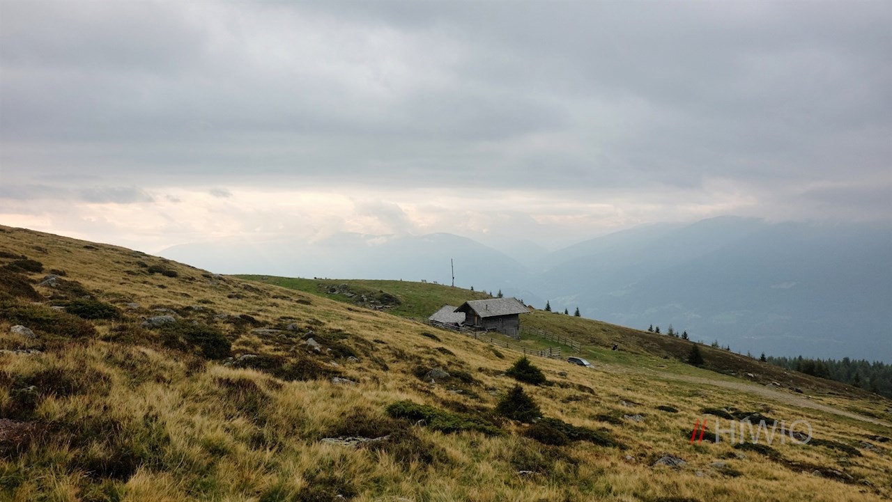 Hinter der einladenden Almhütte windet sich der Weg durch lichte Zirben- und Lärchenhaine zur (nicht bewirtschafteten) Oberen Pertinger Alm, neben deren Wetterkreuz sich bereits ein schönes Panorama öffnet.