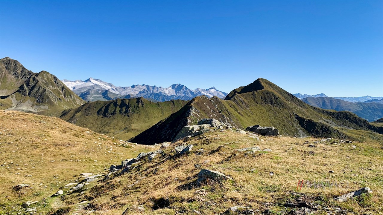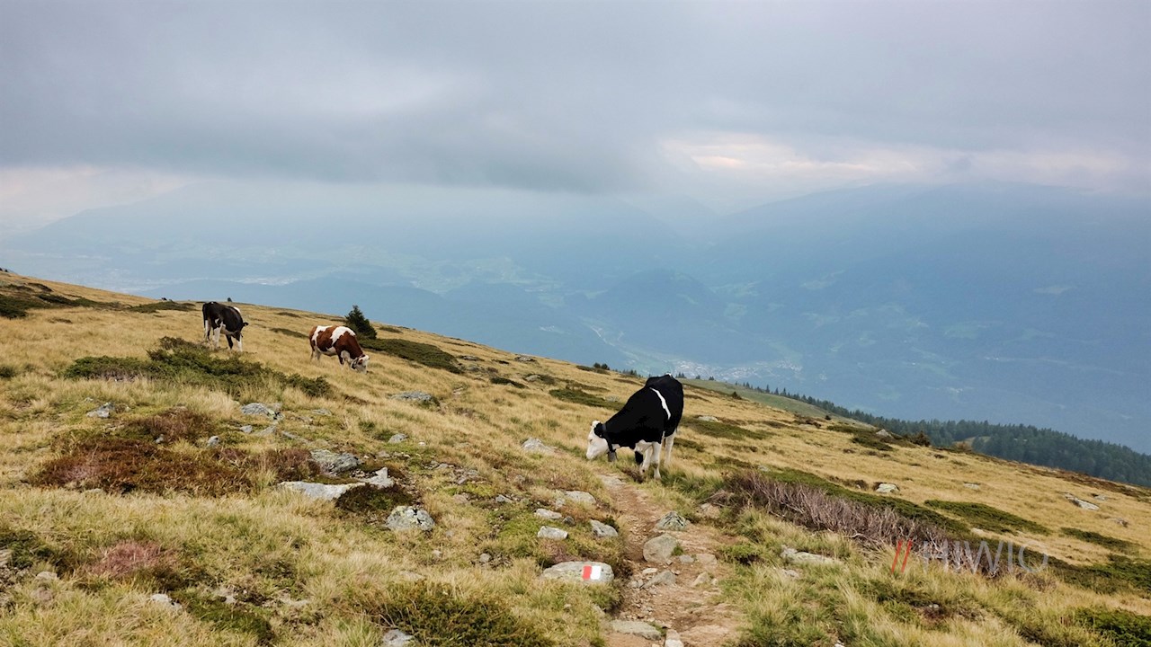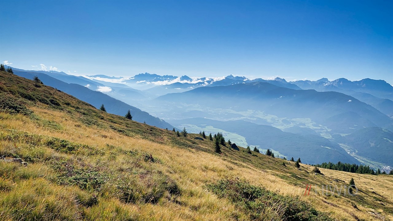 Weiterhin der Wegnummer 5 folgend, zieht sich der Pfad nun über den breiten Grasrücken auf den Gipfel des Terner Jöchl, neben dessen schmiedeisernem Gipfelkreuz sich ein unvergesslicher Panoramablick entfaltet: Der Blick schweift von der gegenüberliegenden Rodenecker Alm über die Plose und den Peitlerkofel zu den bleichen Dolomiten und den umliegenden Pfunderer Bergen. Ganz in der Nähe lassen sich übrigens zwei weitere beliebte Wanderziele in Terenten ausmachen: die markante Eidechsspitze und die vielbesuchte Tiefrastenhütte.