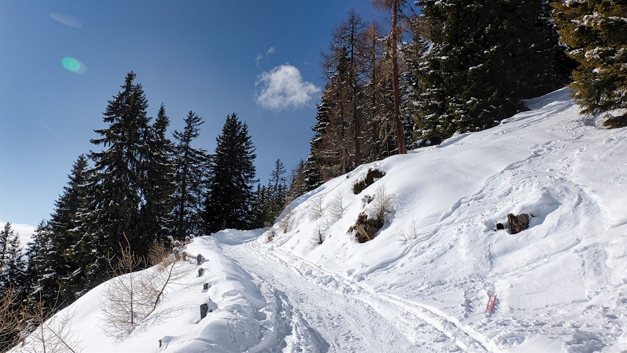Hinter der Pertinger Alm steigt der Weg Nr. 5 durch winterliche Zirben- und Lärchenhaine zur (nicht bewirtschafteten) Oberen Pertinger Alm an.