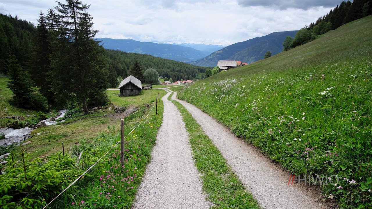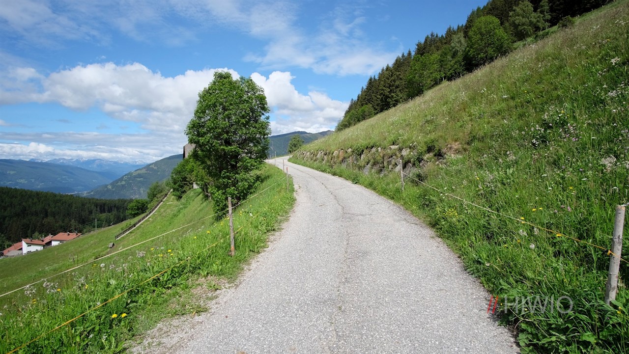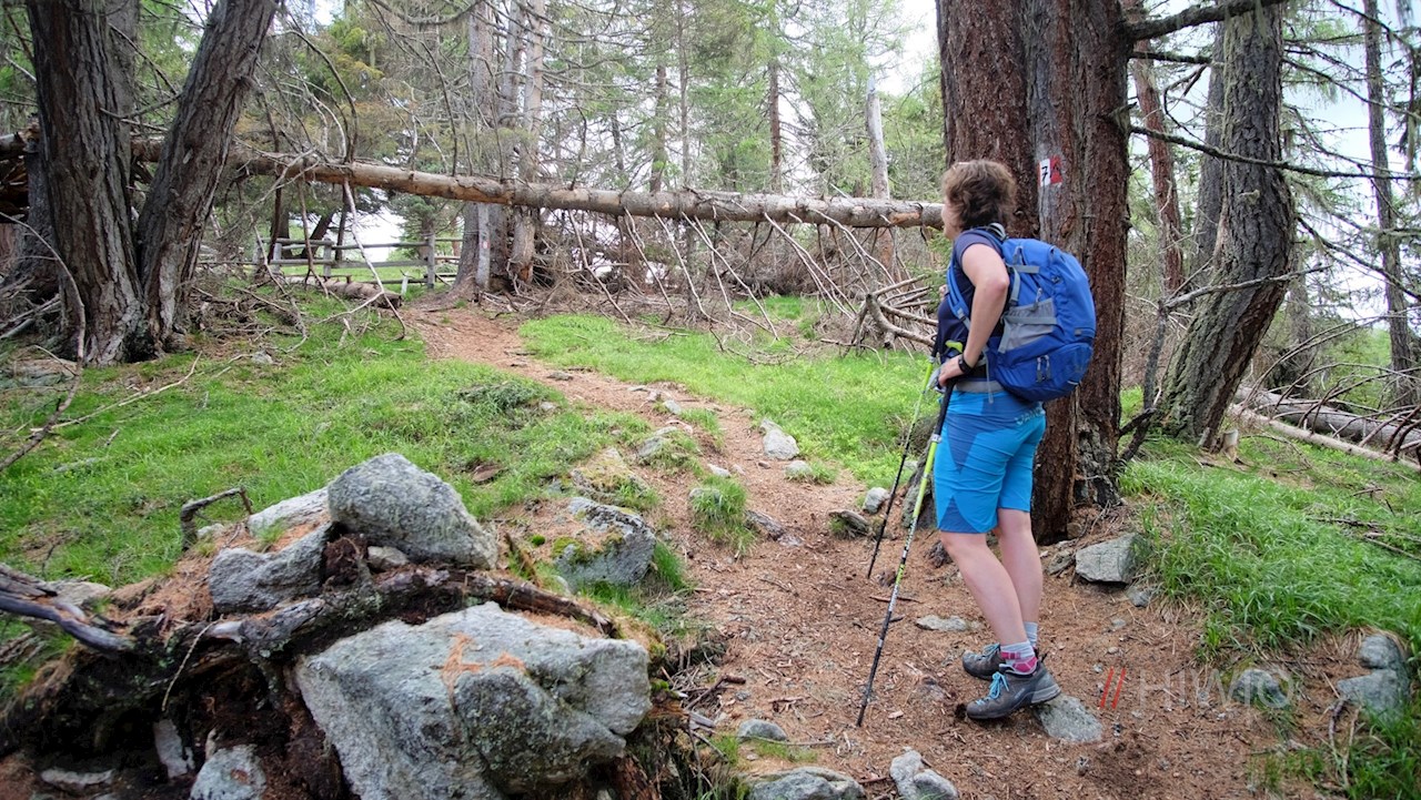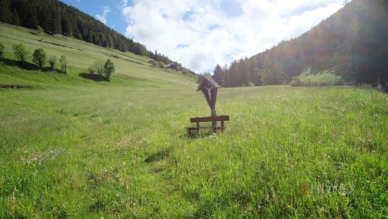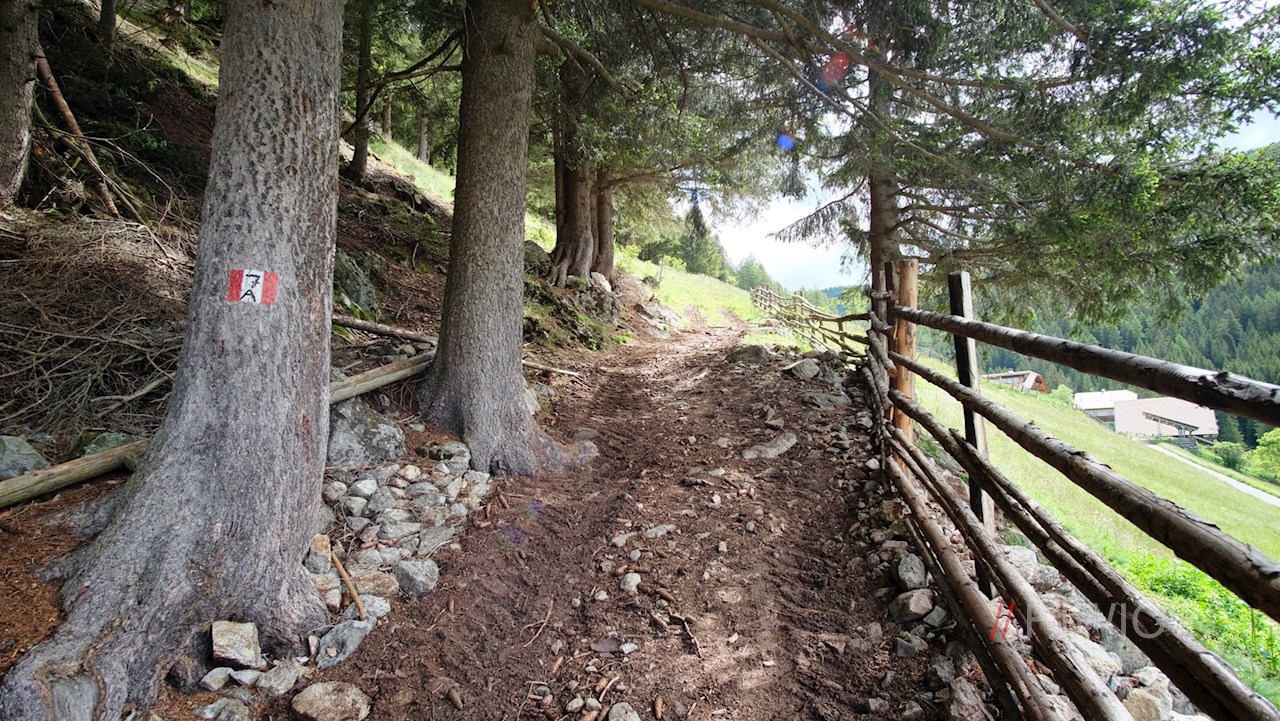 Stets der Wegnummer 7A in Richtung Geige folgend, wandert man zunächst auf einem schmalen Wiesenpfad zur höher gelegenen Höfestraße, der man nach oben folgt. Kurz vor den letzten Höfen zweigt links der Waldweg Nr. 7A ab. Er führt im ziemlich steilen Anstieg durch den schattenverheißenden Nadelwald, dessen friedvolle Stille hie und da vom Gezwitscher der Vögel durchbrochen wird.