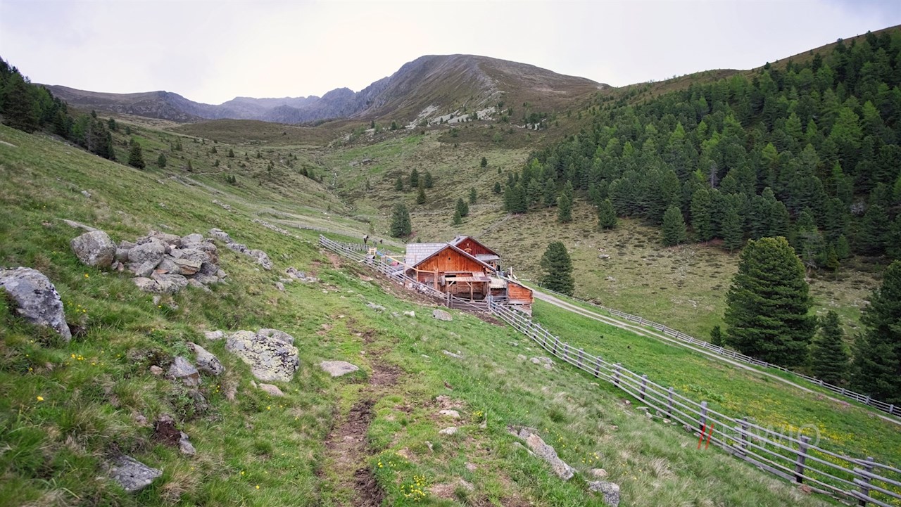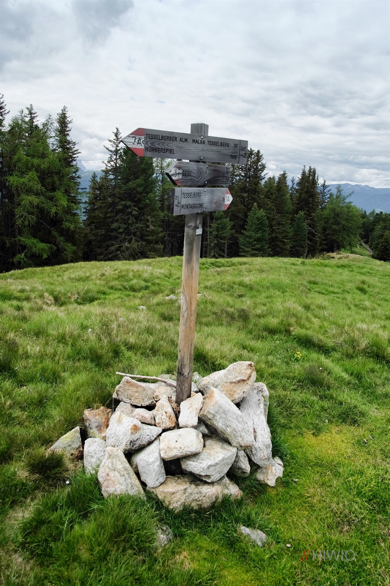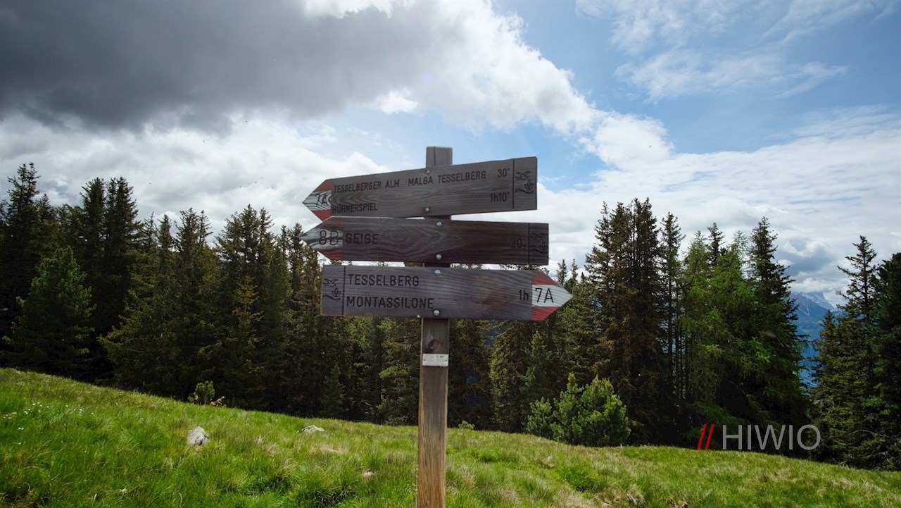 Auf dem Rückweg von der Geige folgt man zunächst dem bereits bekannten Wiesenpfad. An der nächsten Weggabelung schlägt man diesmal aber den links abzweigenden Weg Nr. 7A in Richtung Tesselberger Alm ein. Er führt in sanft abfallender Querung zu dieser bewirtschafteten Almhütte, die am Fuße des Schönbichl zu einer genüsslichen Zwischenrast einlädt.