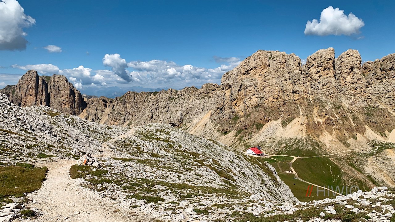 An der nächsten Weggabelung zweigt der Weg Nr. 3A rechts ab. Er führt zur beliebten, von den imposanten Felsen der nördlichen Rosengartengruppe umrahmten Grasleitenhütte, in der die Wanderer den Sommer über mit erfrischenden Getränken und köstlichen Gerichten verwöhnt werden.