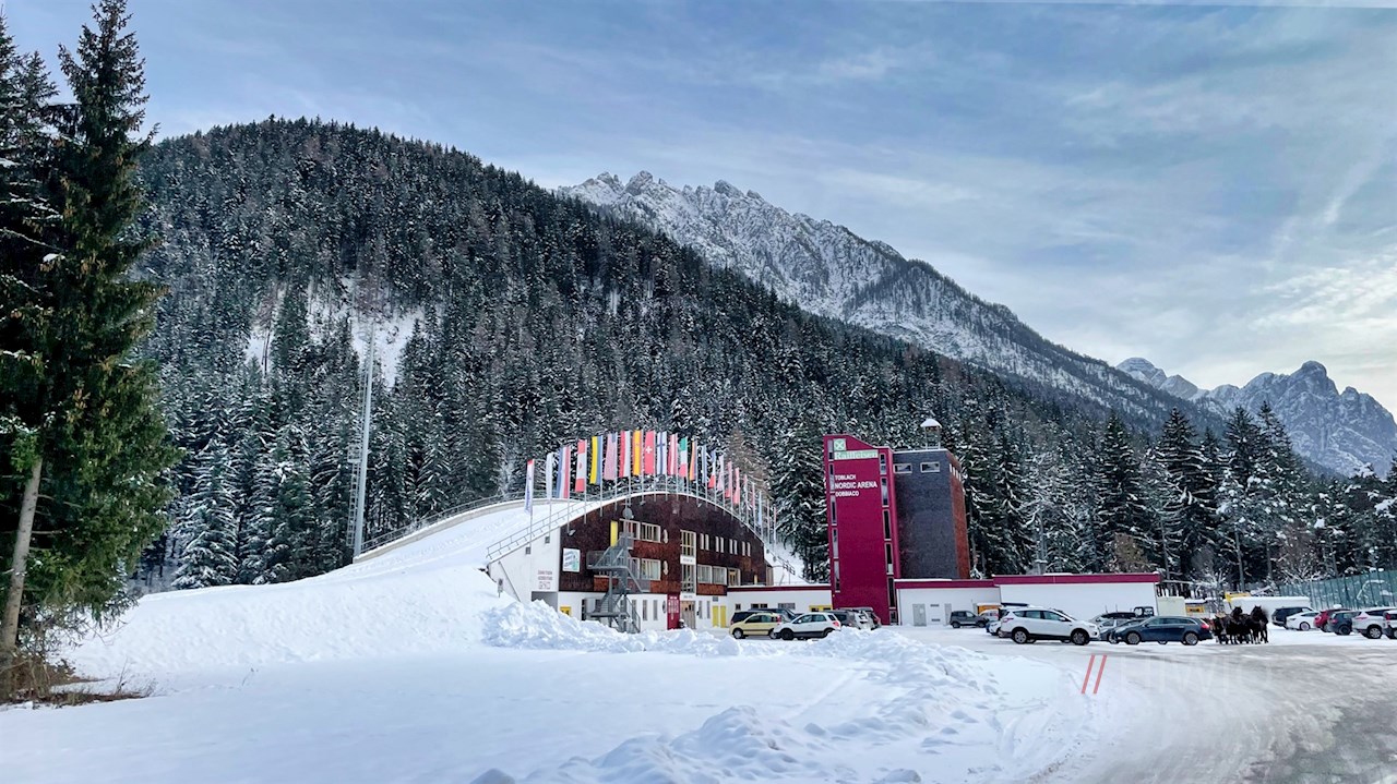 Die Winterwanderung zum Toblacher See beginnt am Bahnhof in Toblach, neben dem sich einige Parkplätze finden.