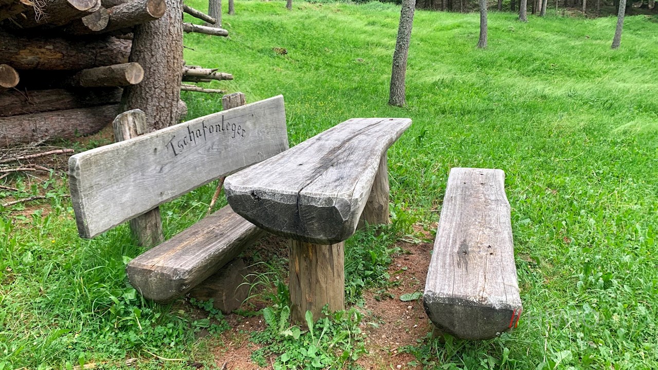 Nach einer guten Stunde steten Wanderns erreicht man den Tschafonleger, eine idyllische Lärchenwiese, in der ein Tisch samt Bänken zur kleinen Zwischenrast verlockt.