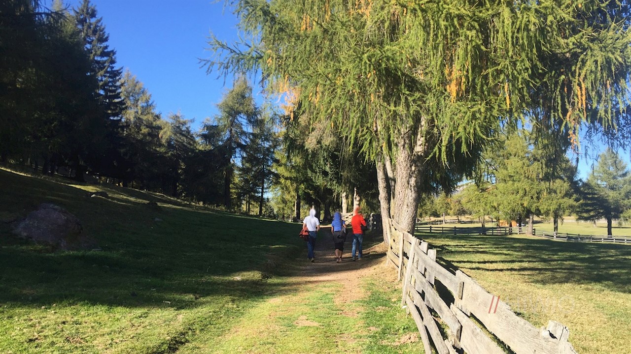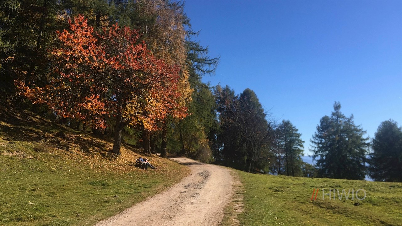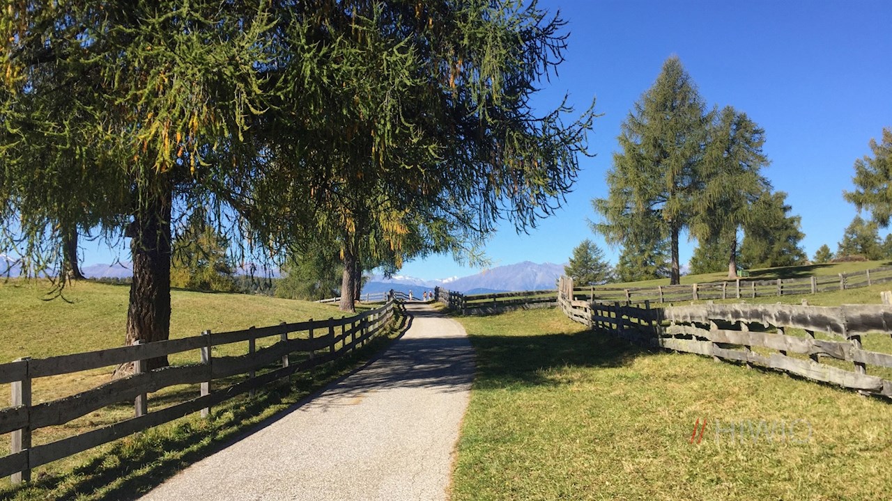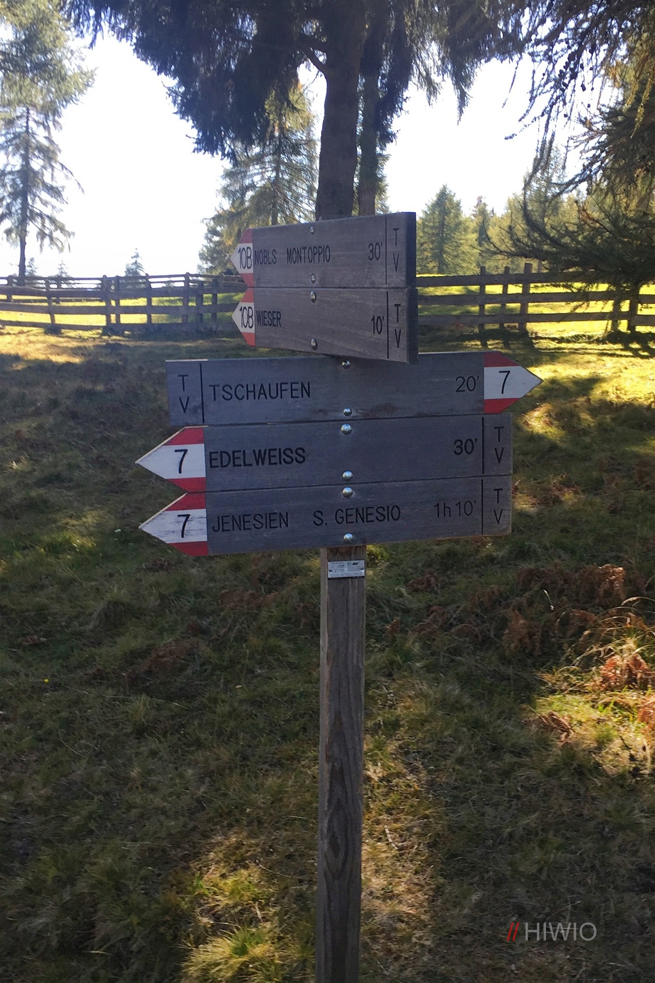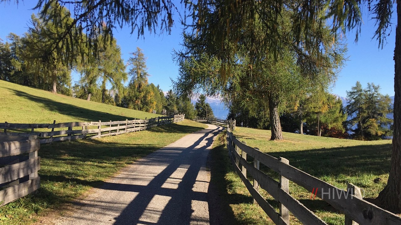 Nach der genussreichen Einkehr setzt man die Wanderung auf dem rechts abzweigenden Wanderweg Nr. 2 in Richtung Jenesien fort. Er schlängelt sich durch sanft gewellte Wiesen und lichte Waldstücke und mündet schließlich in den Weg Nr. 10. Auf diesem gelangt man wieder auf den bereits bekannten Weg Nr. 7, auf dem man zum Ausgangspunkt zurückwandert.