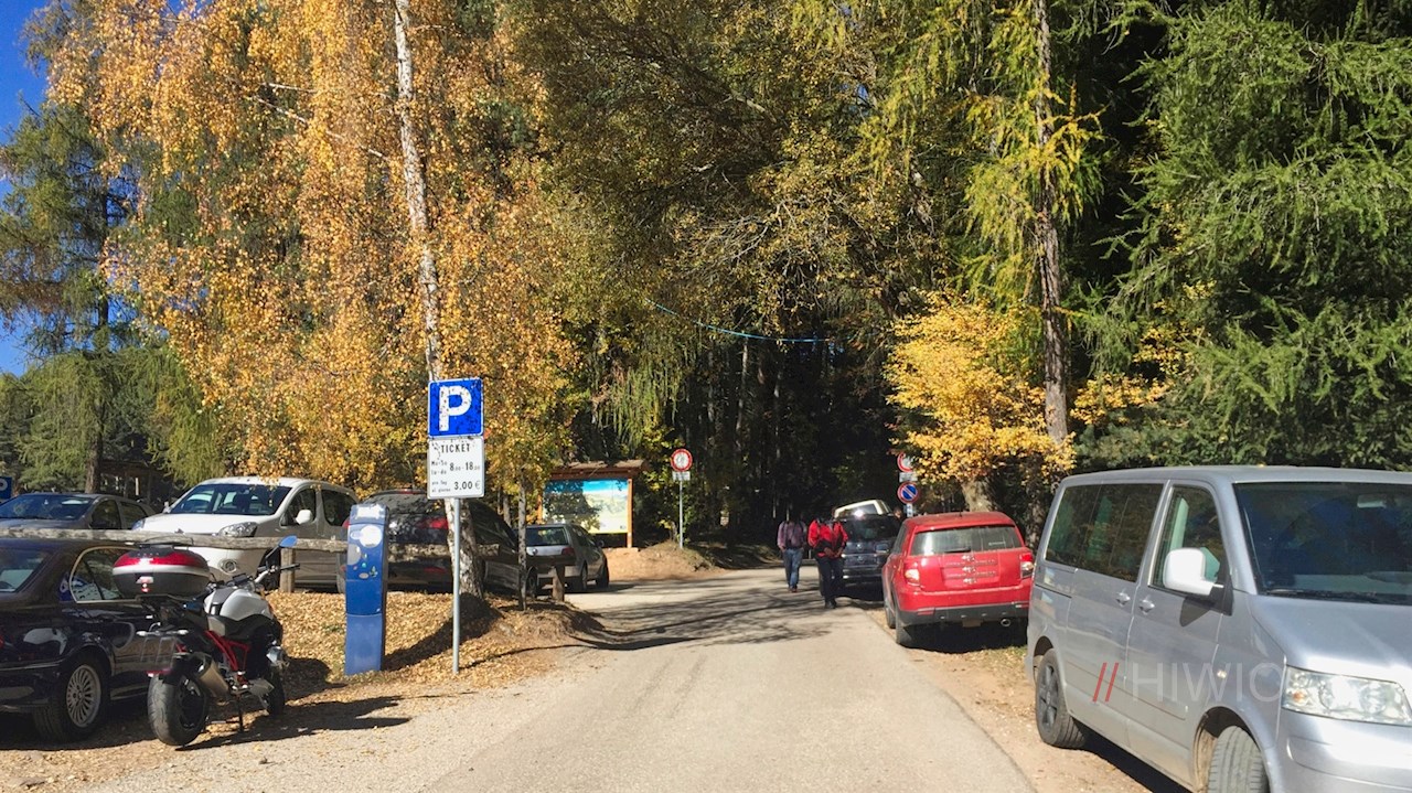 Die Wanderung zum Tschaufenhaus nimmt auf dem gebührenpflichtigen Parkplatz am Sportplatz Jenesien ihren Anfang.
